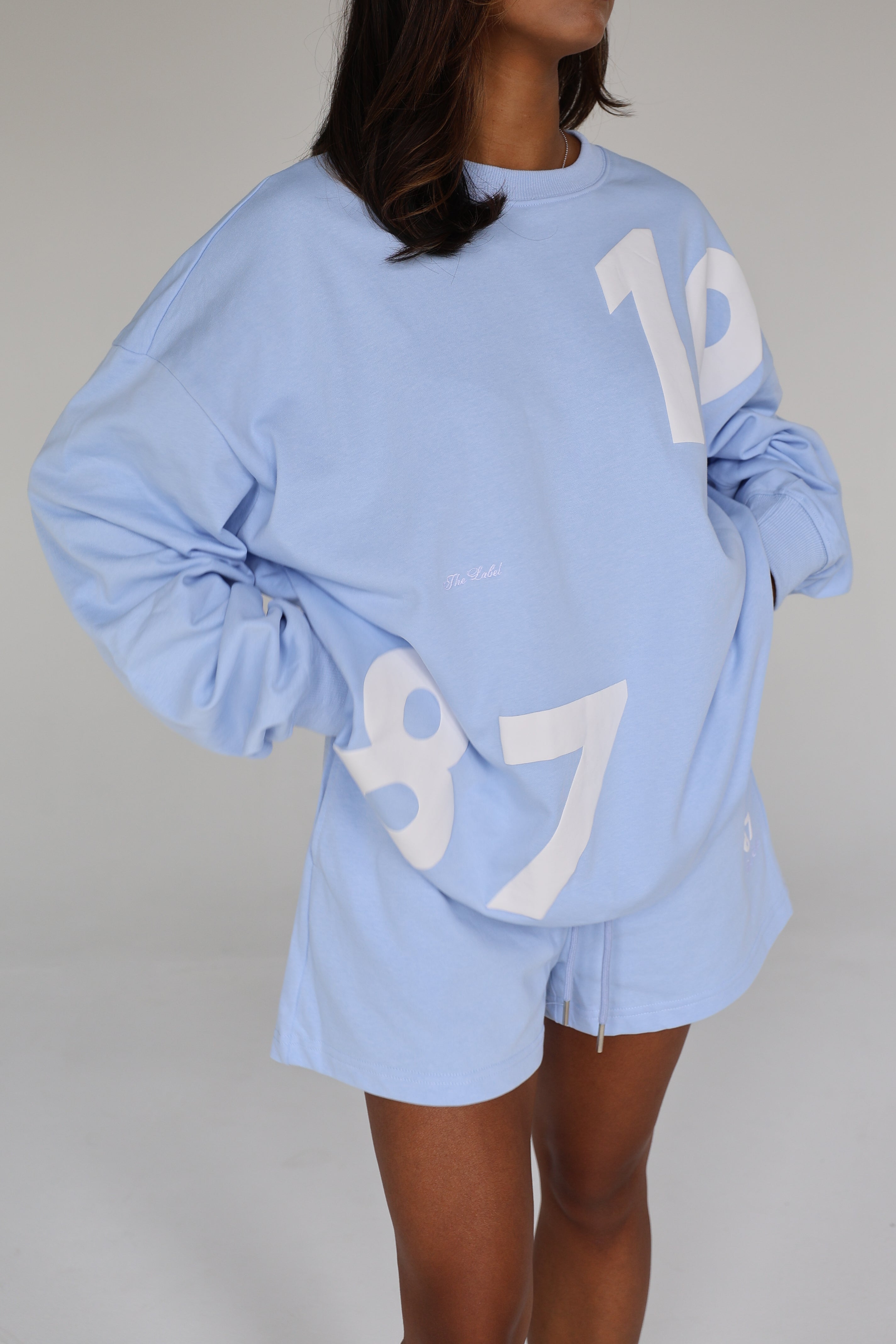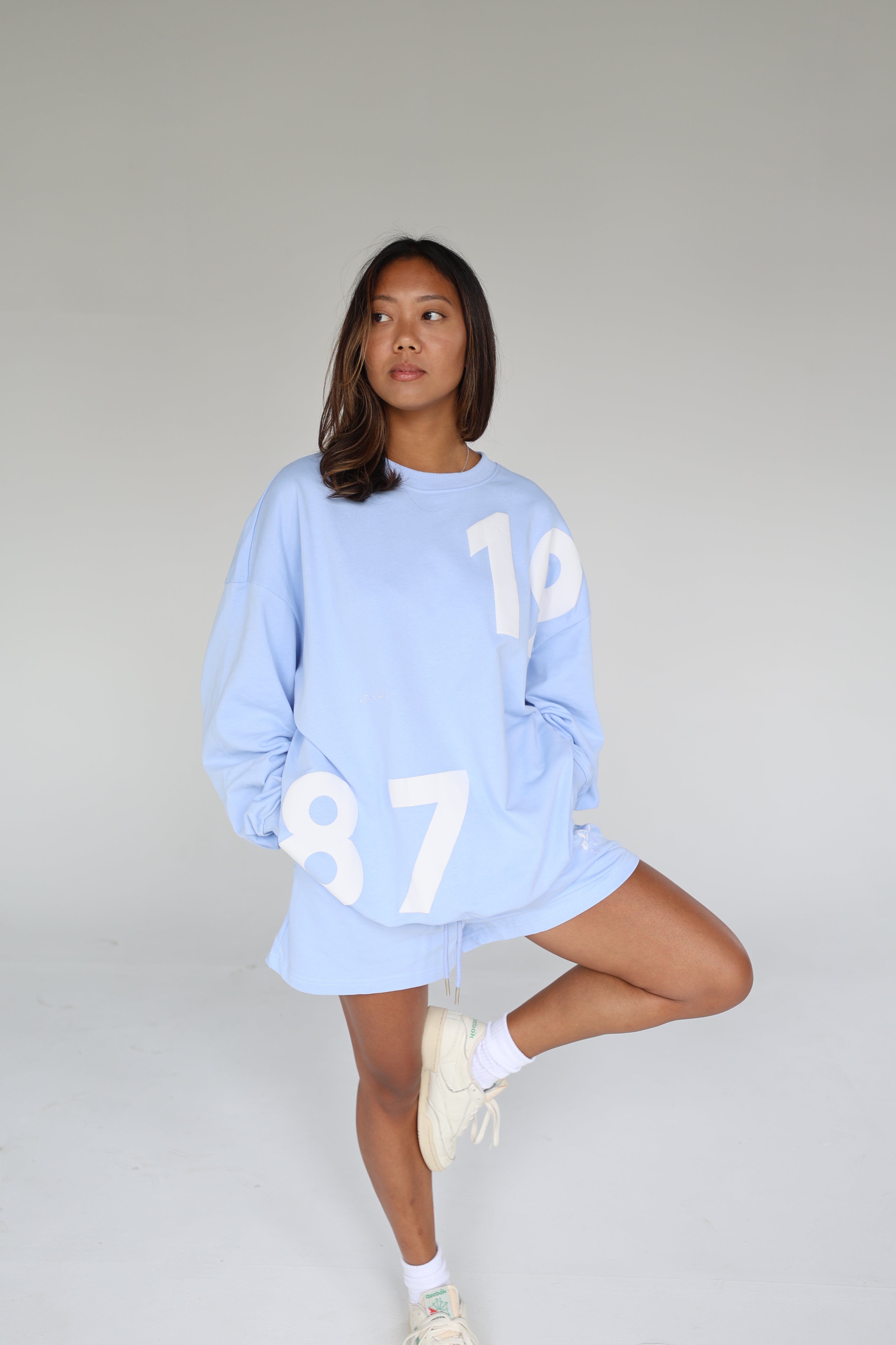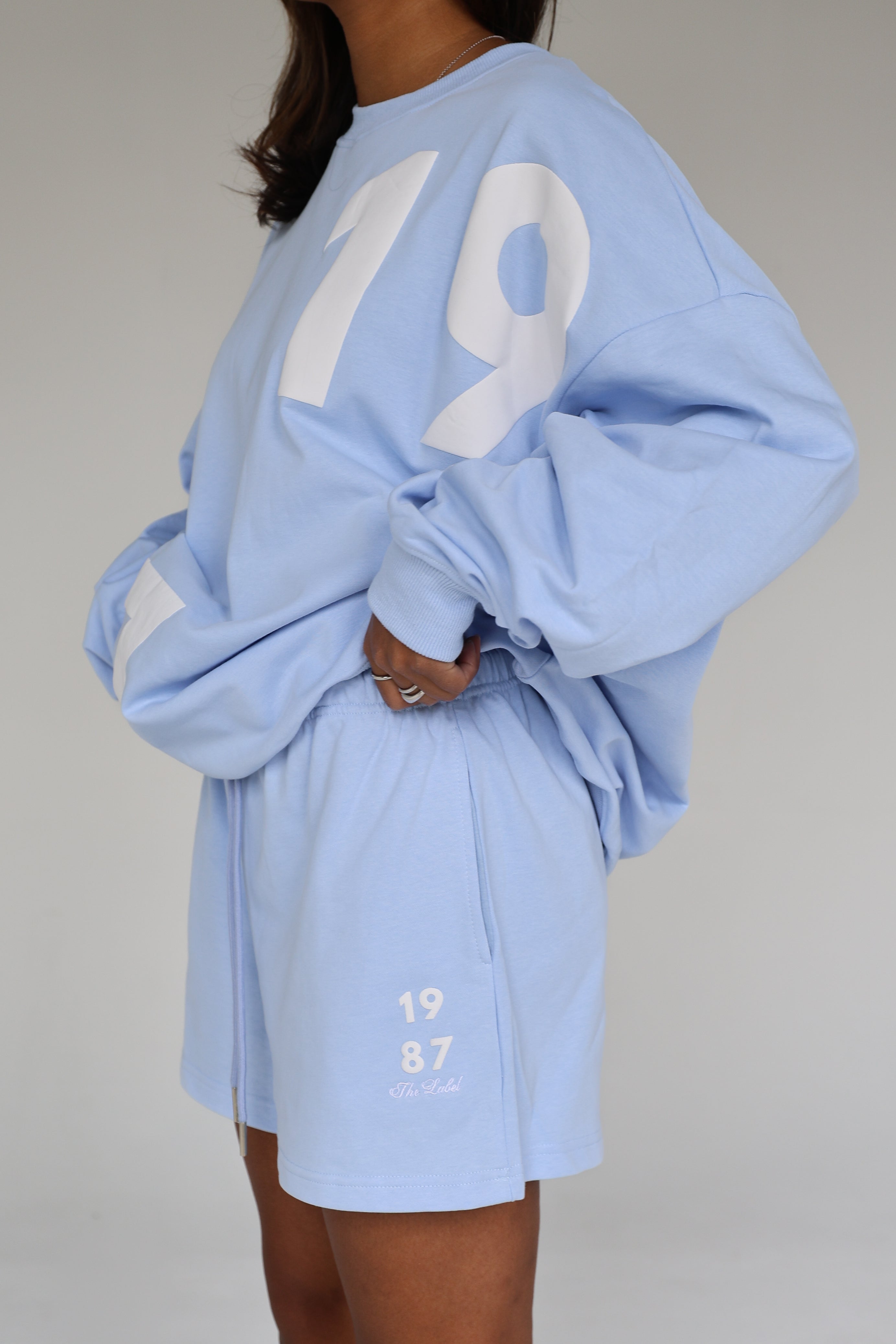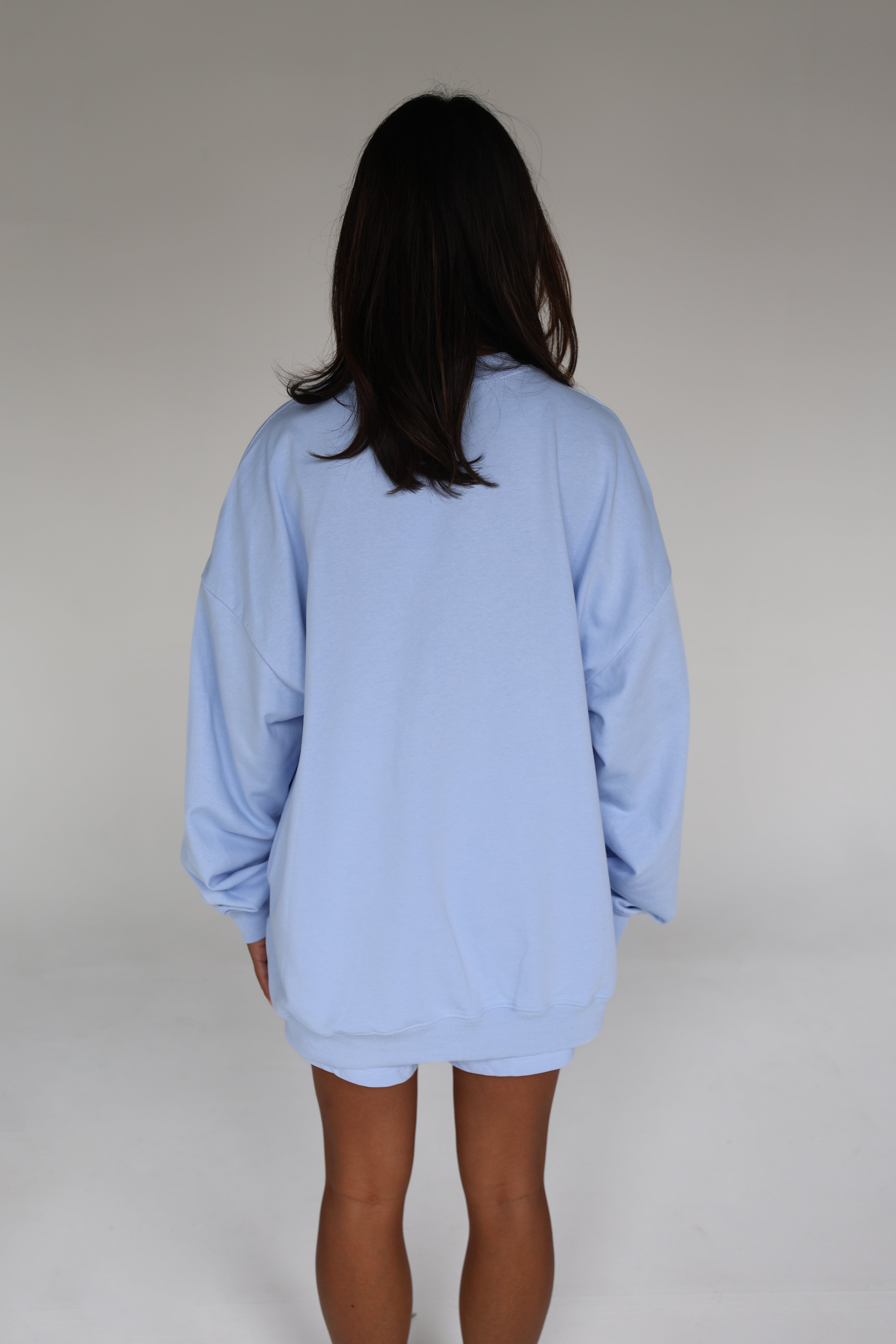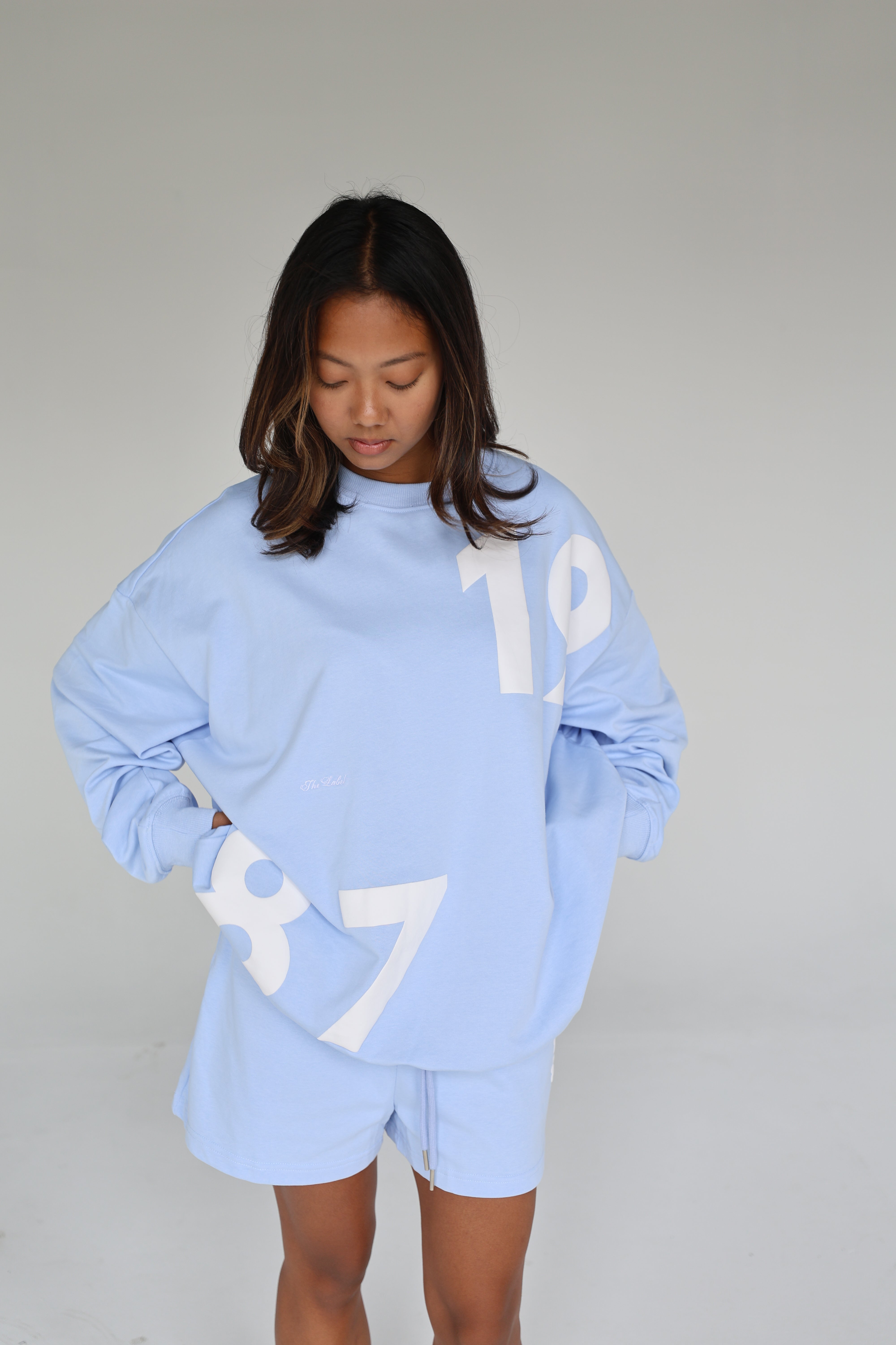 The 1987 crewneck and short set in "Cornflower" is a refreshing hue turned matching moment. Featuring a relaxed-fit crewneck and coordinating shorts in soft, dreamy fleece, this set is made for golden hour walks and waffle cone runs.