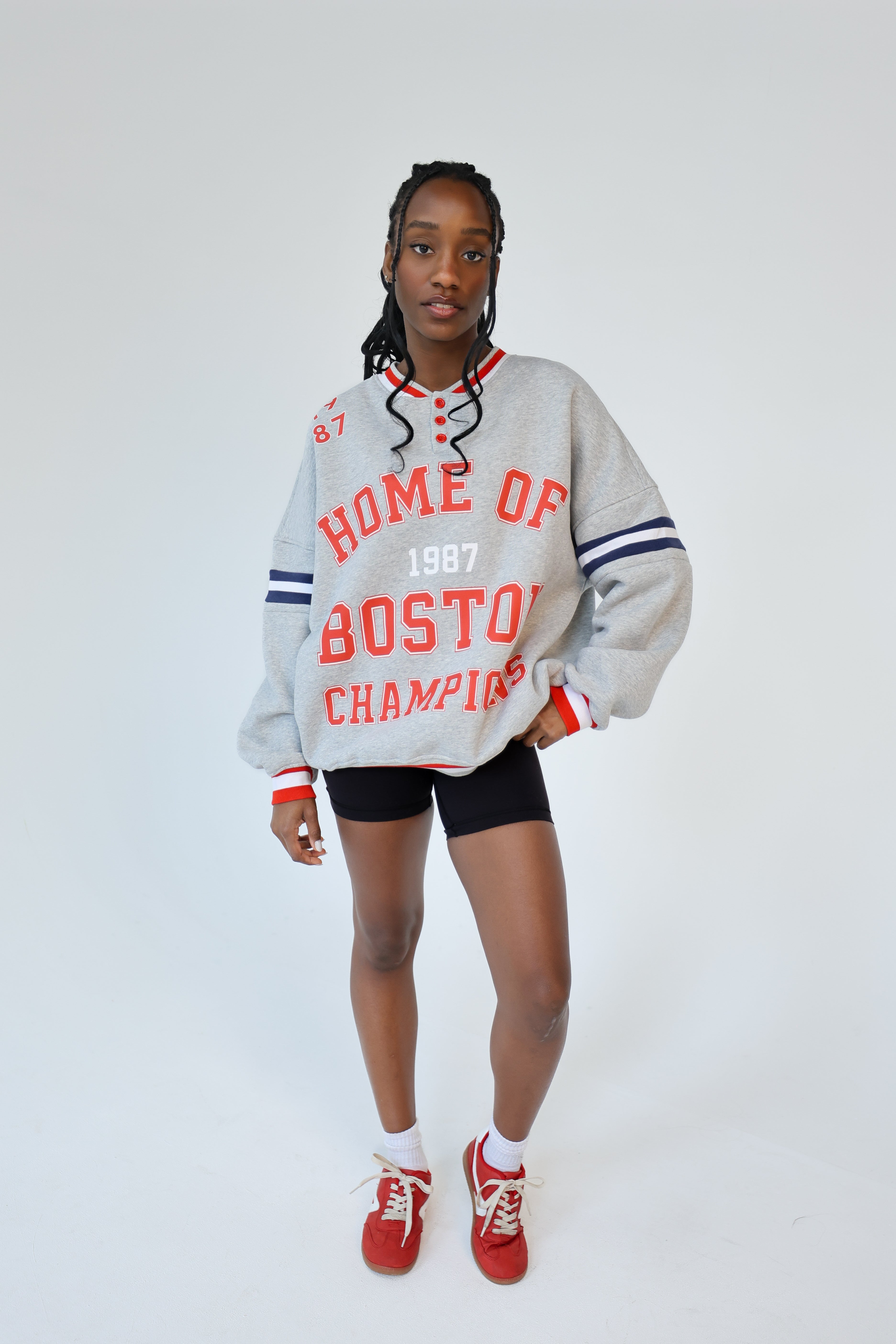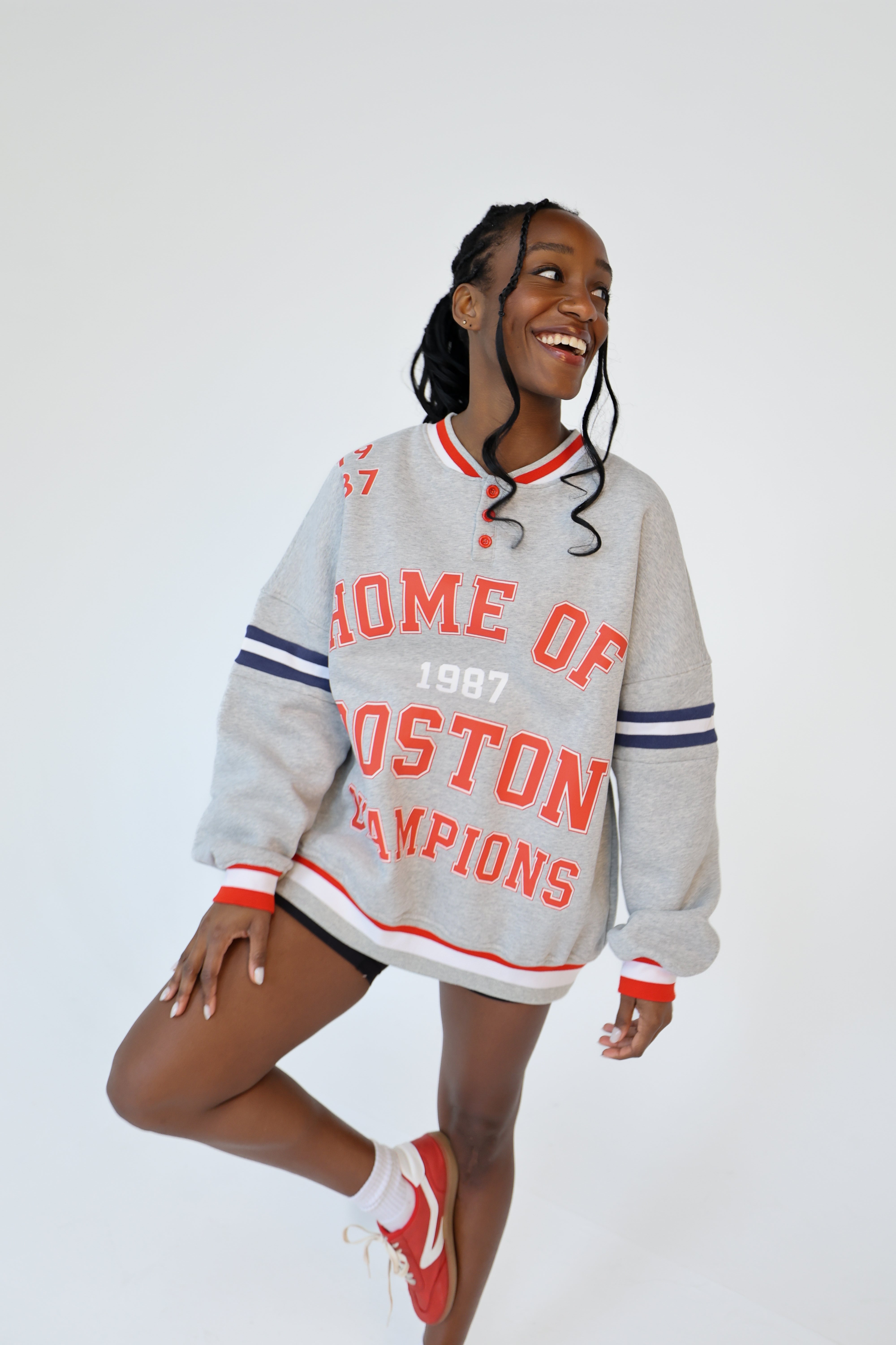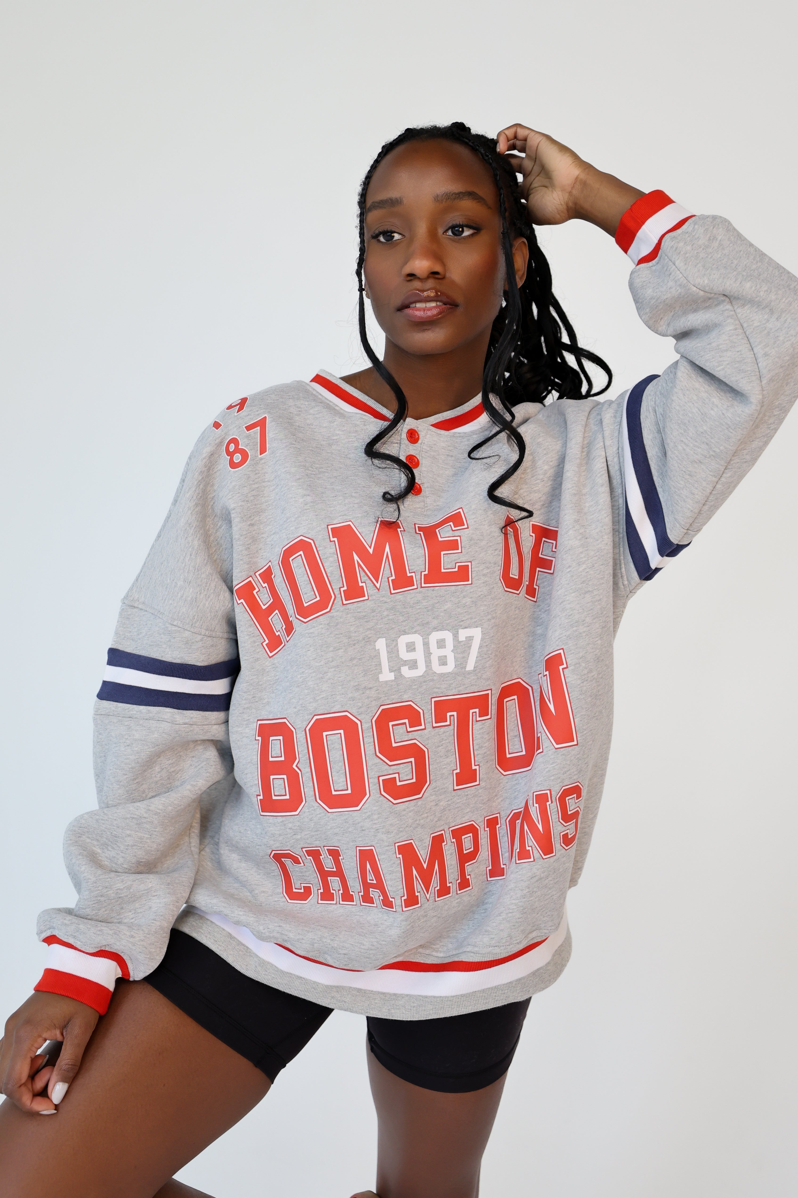 Crafted from plush heavyweight fleece, it wears relaxed and easy — think boyfriend-fit meets trophy-sweat. Championship-coded, Boston through and through.