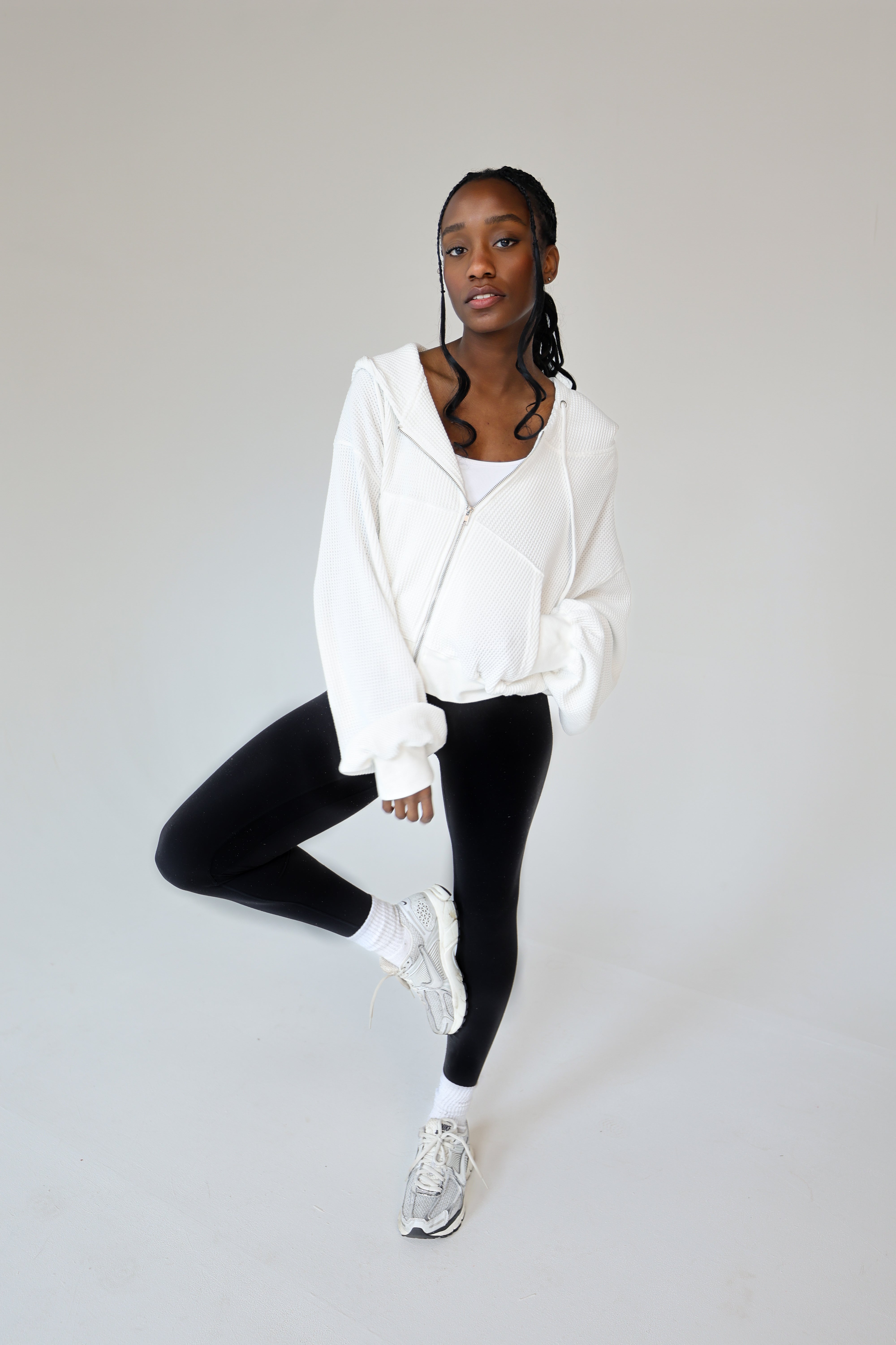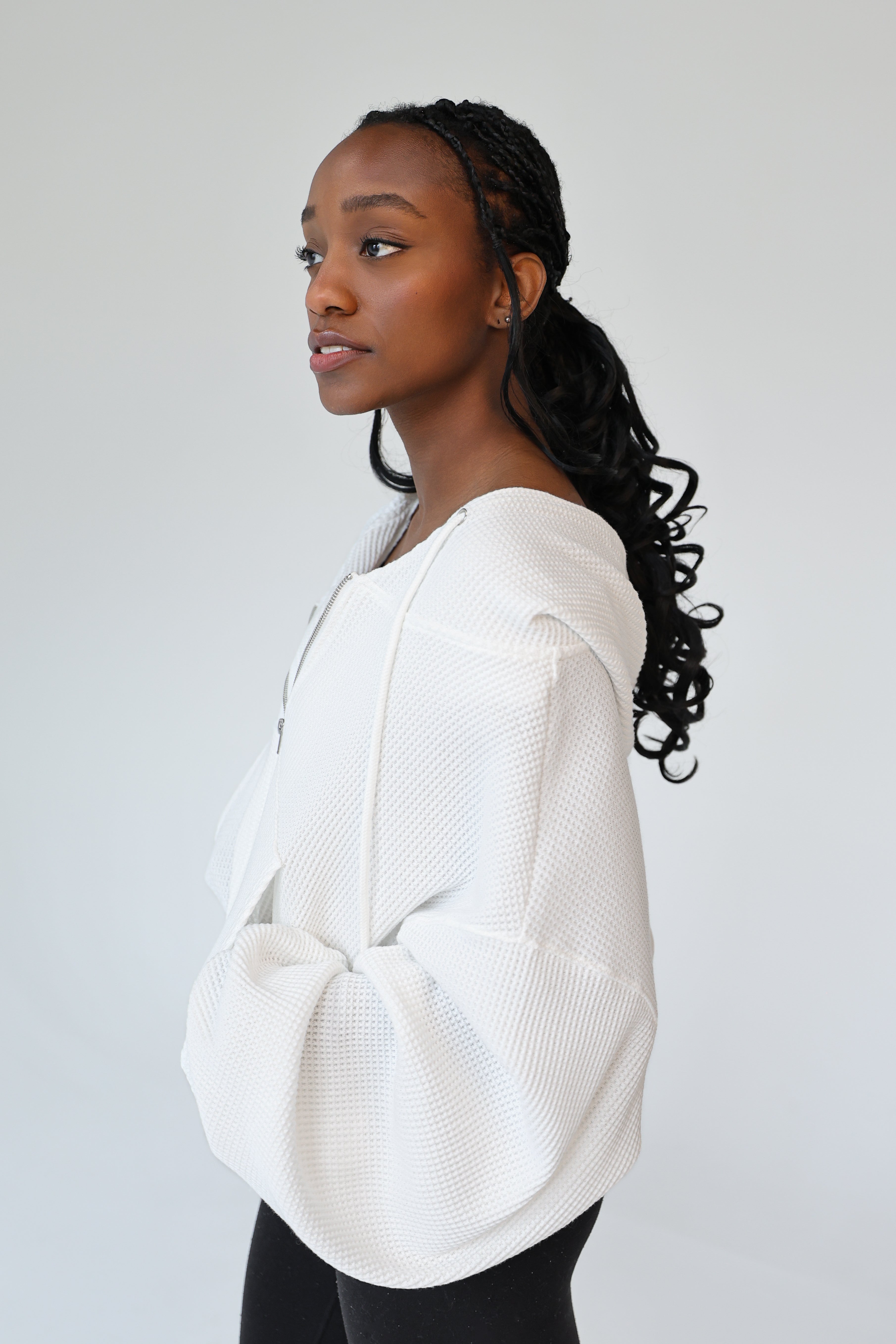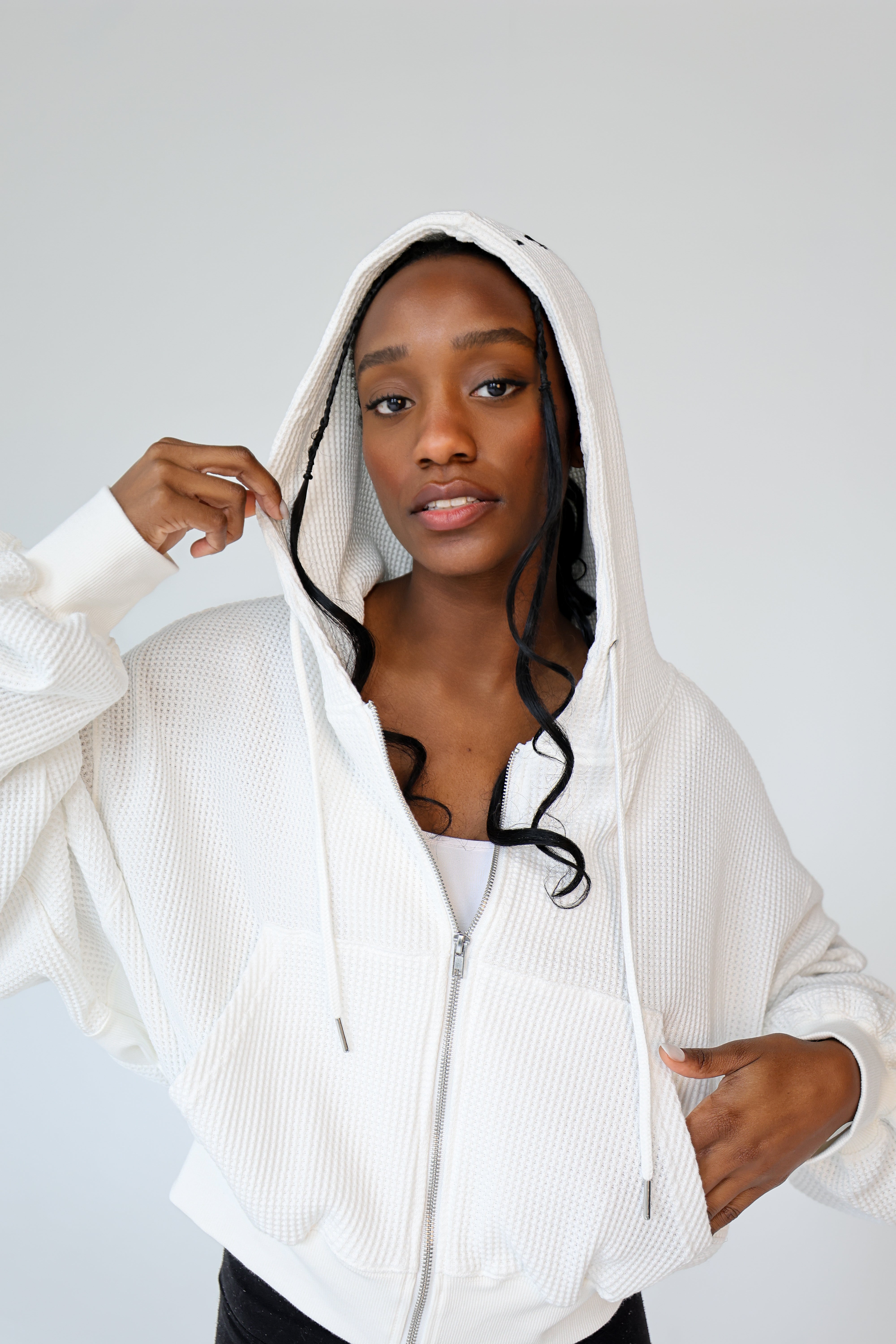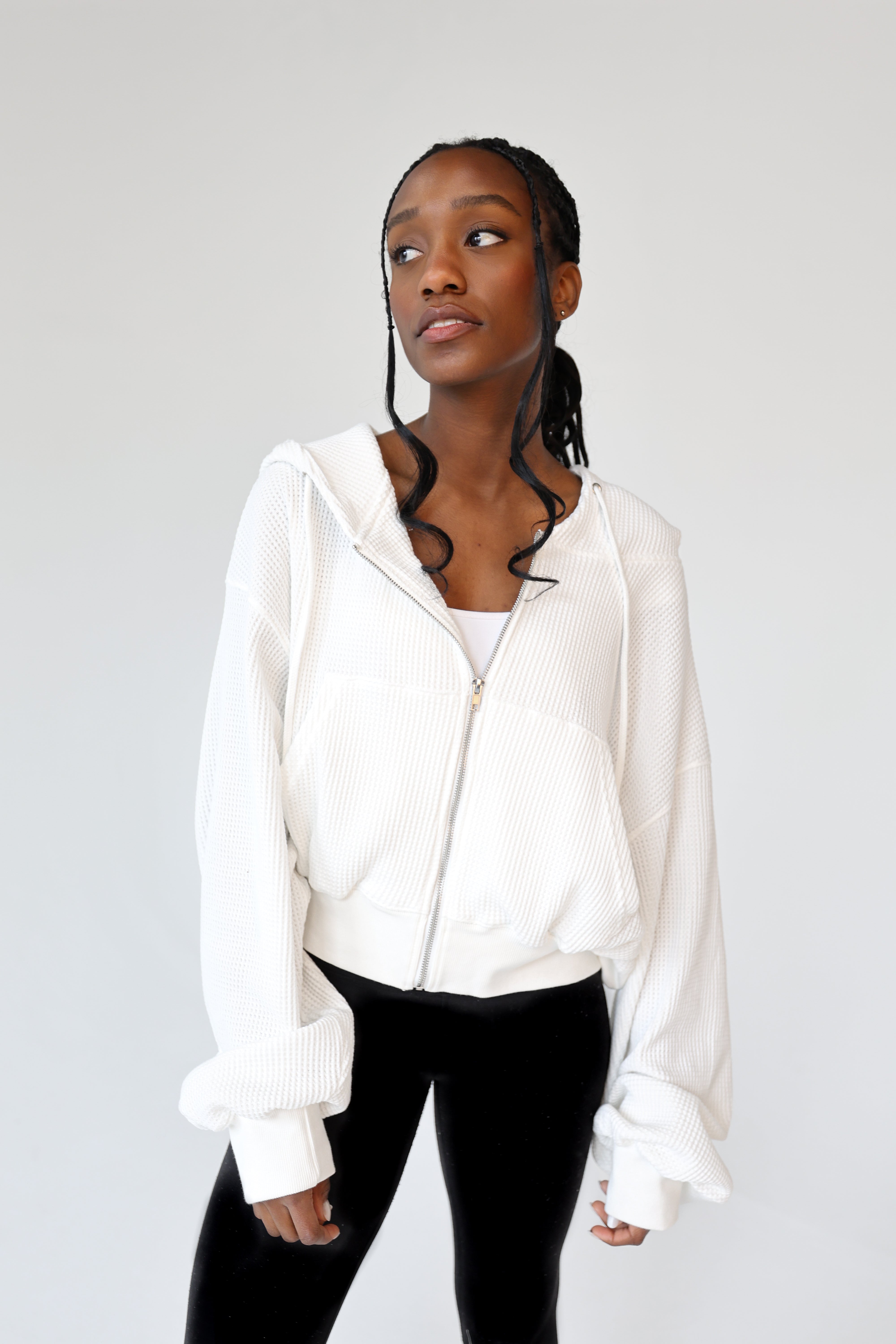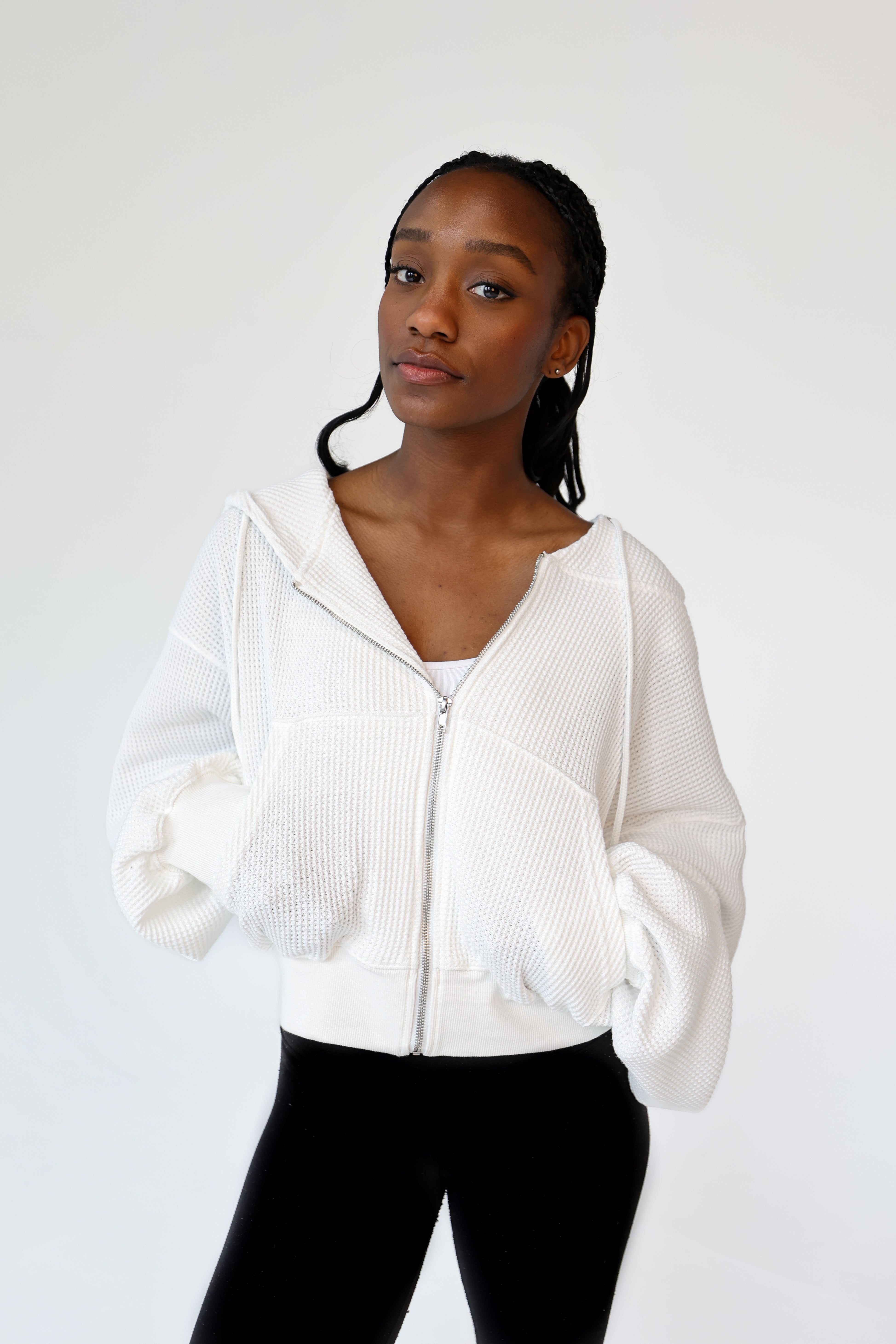 The West End Waffle Zip in "white" is crafted from a breathable, mid-weight waffle knit that strikes the perfect balance between softness and structure.