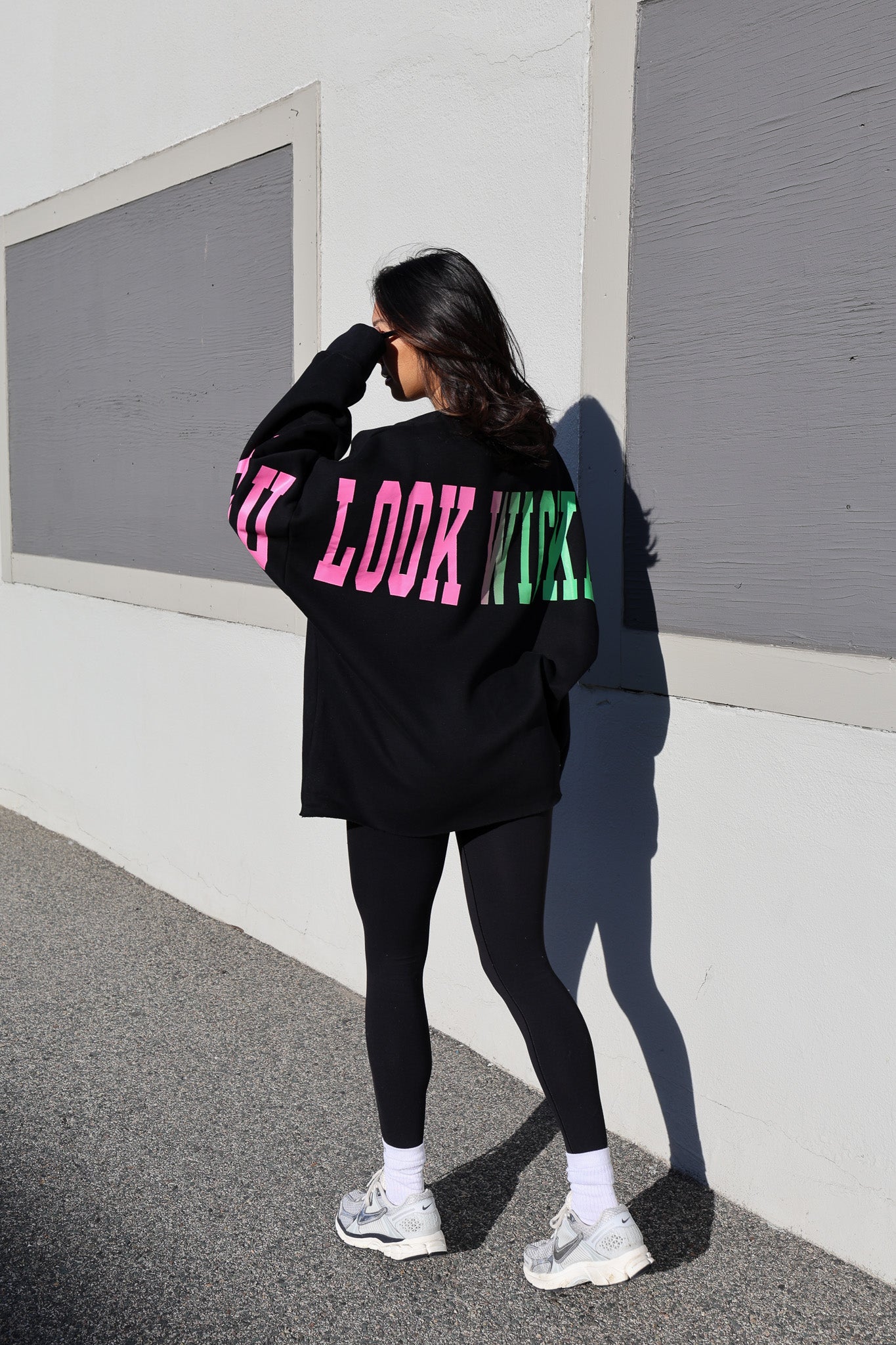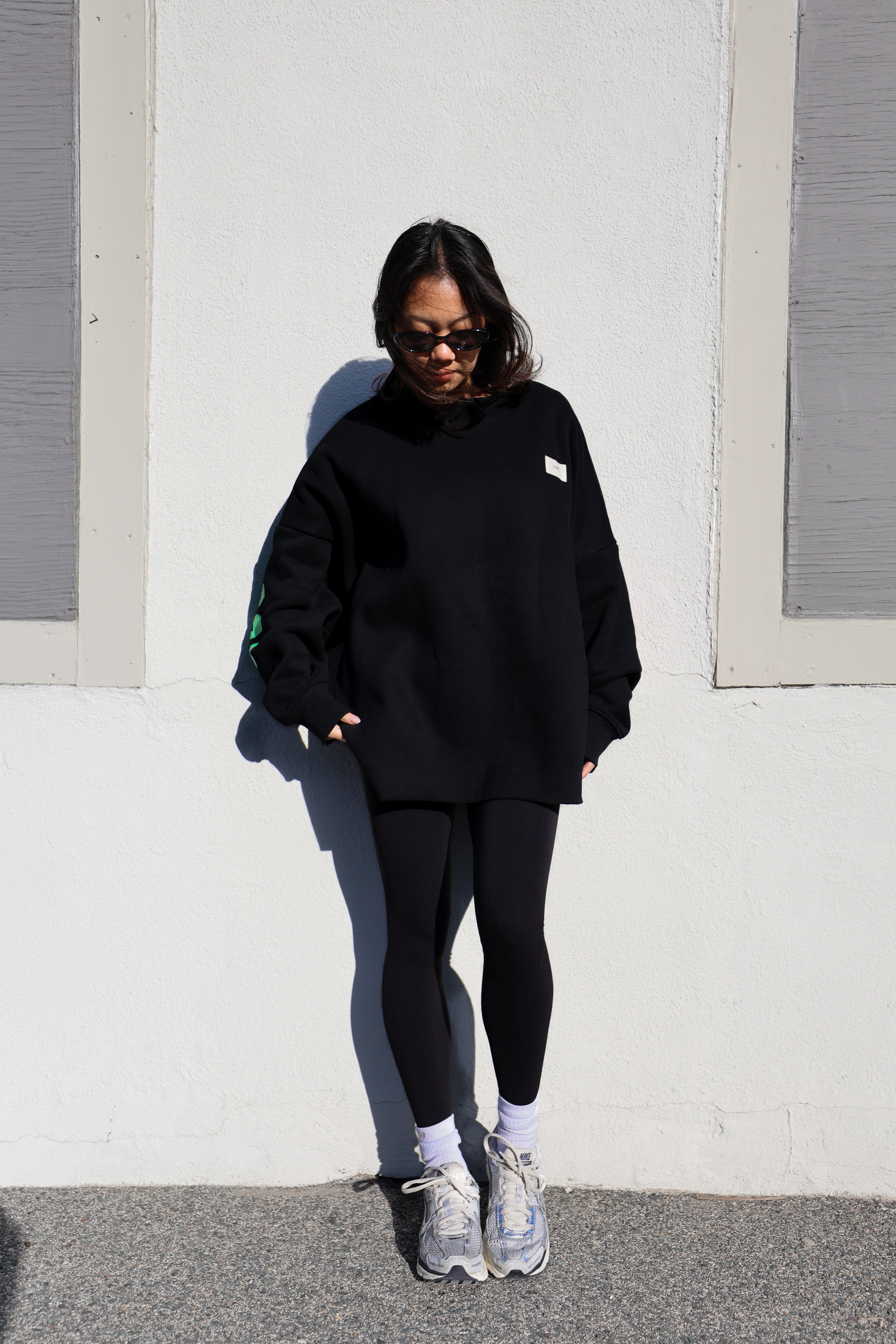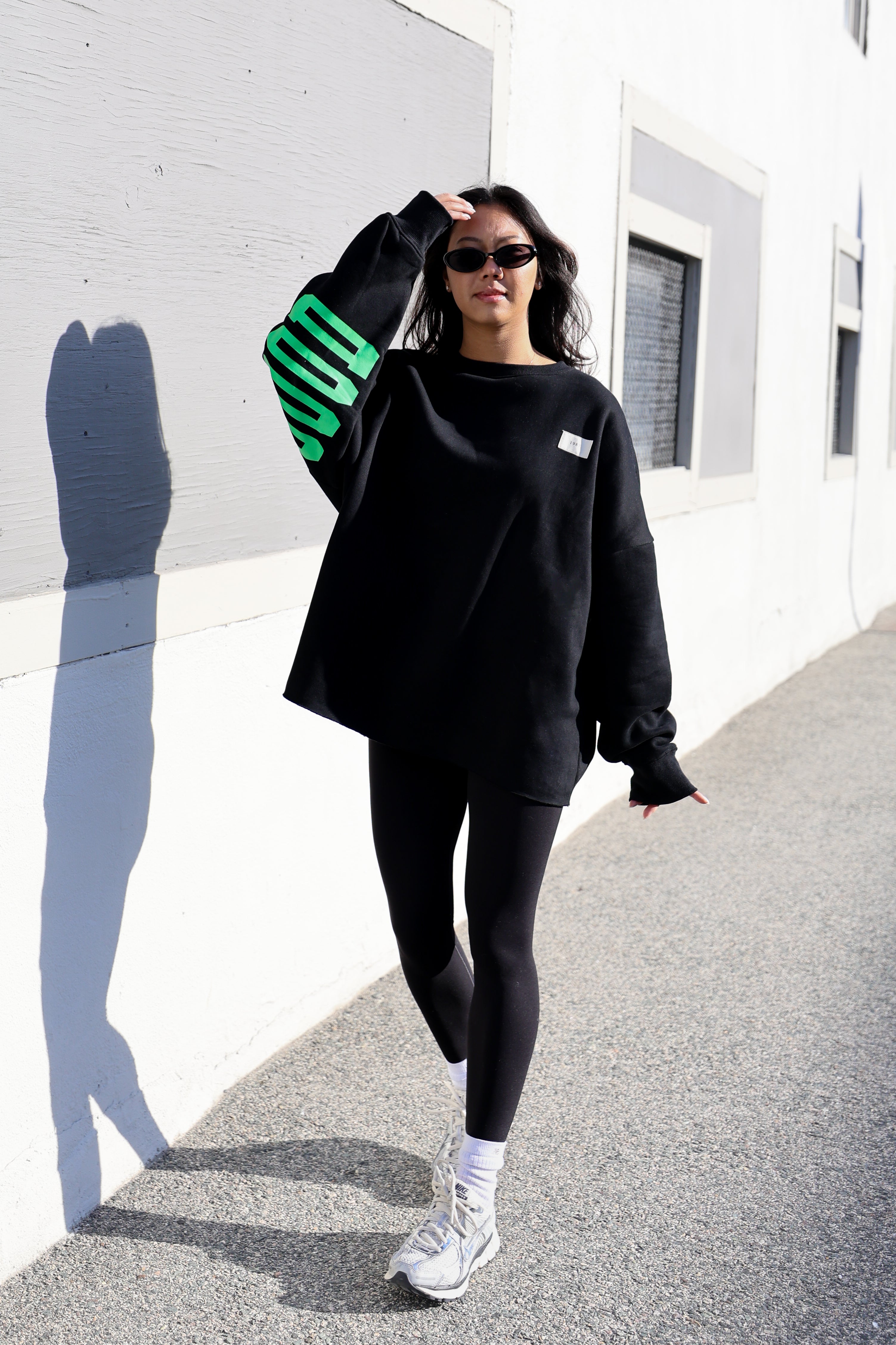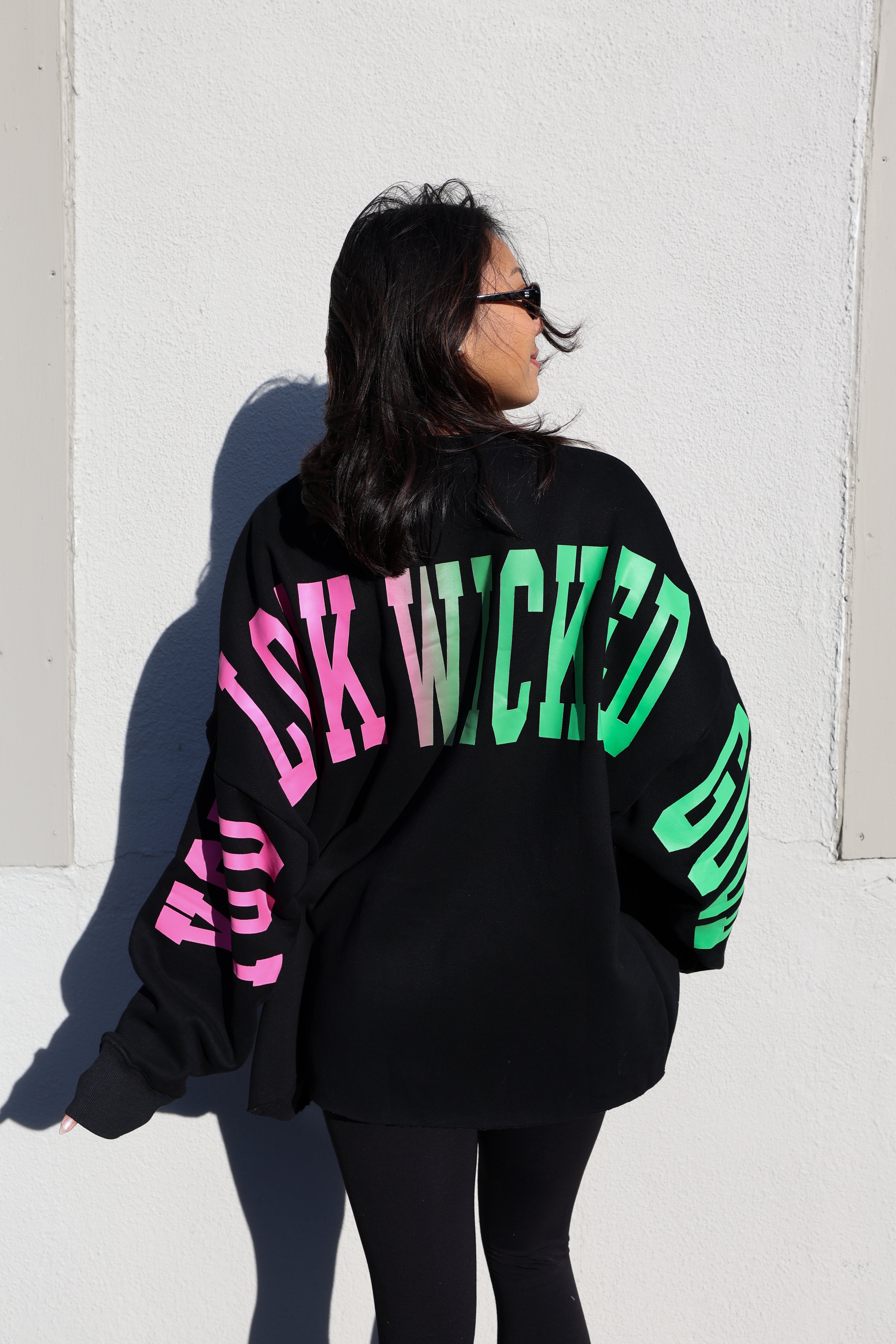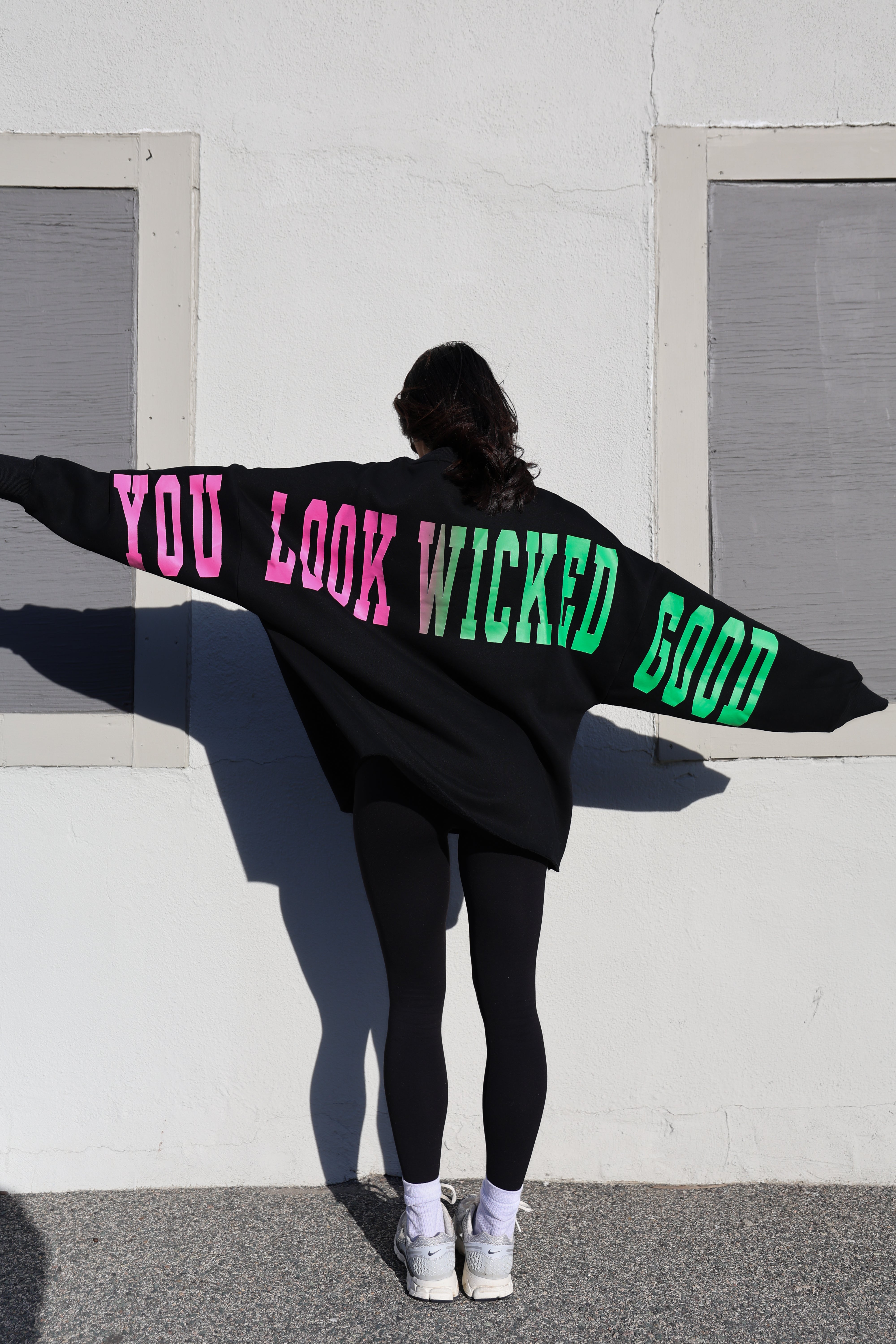 Inspired by an iconic emerald-and-pink color story and a little theatrical magic. Designed with an oversized fit, raw hemline, and dropped shoulders. No need to size up.