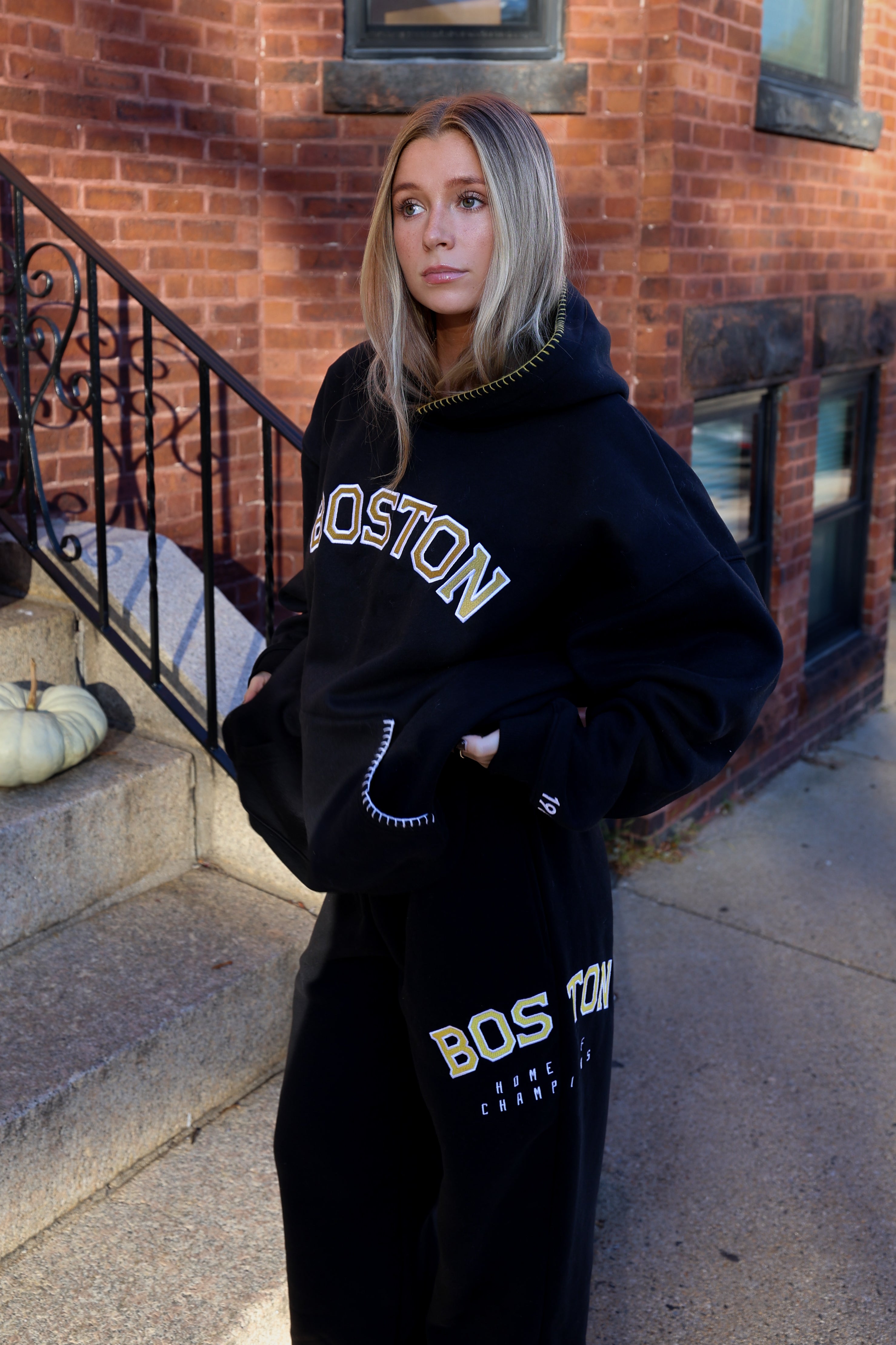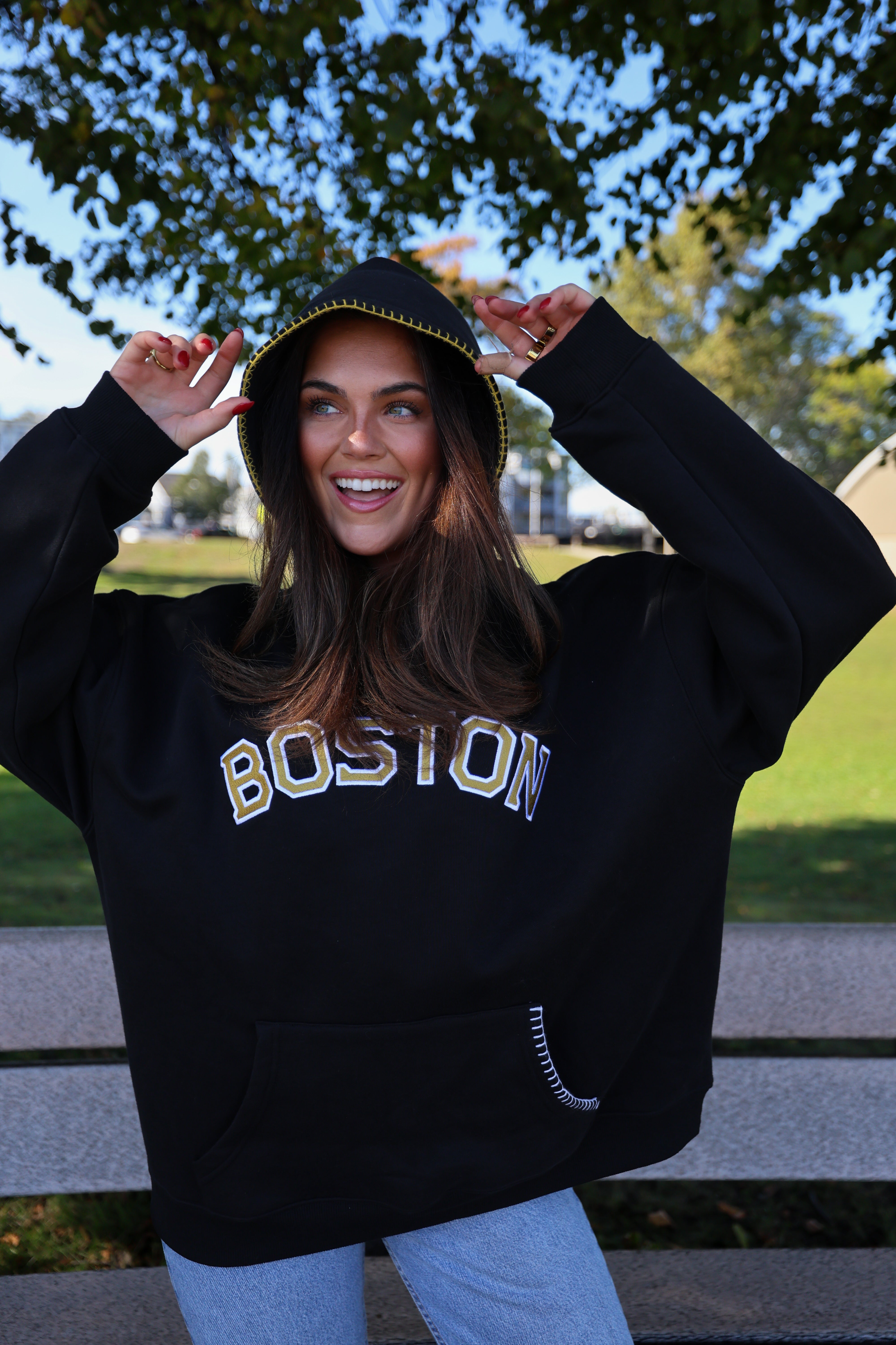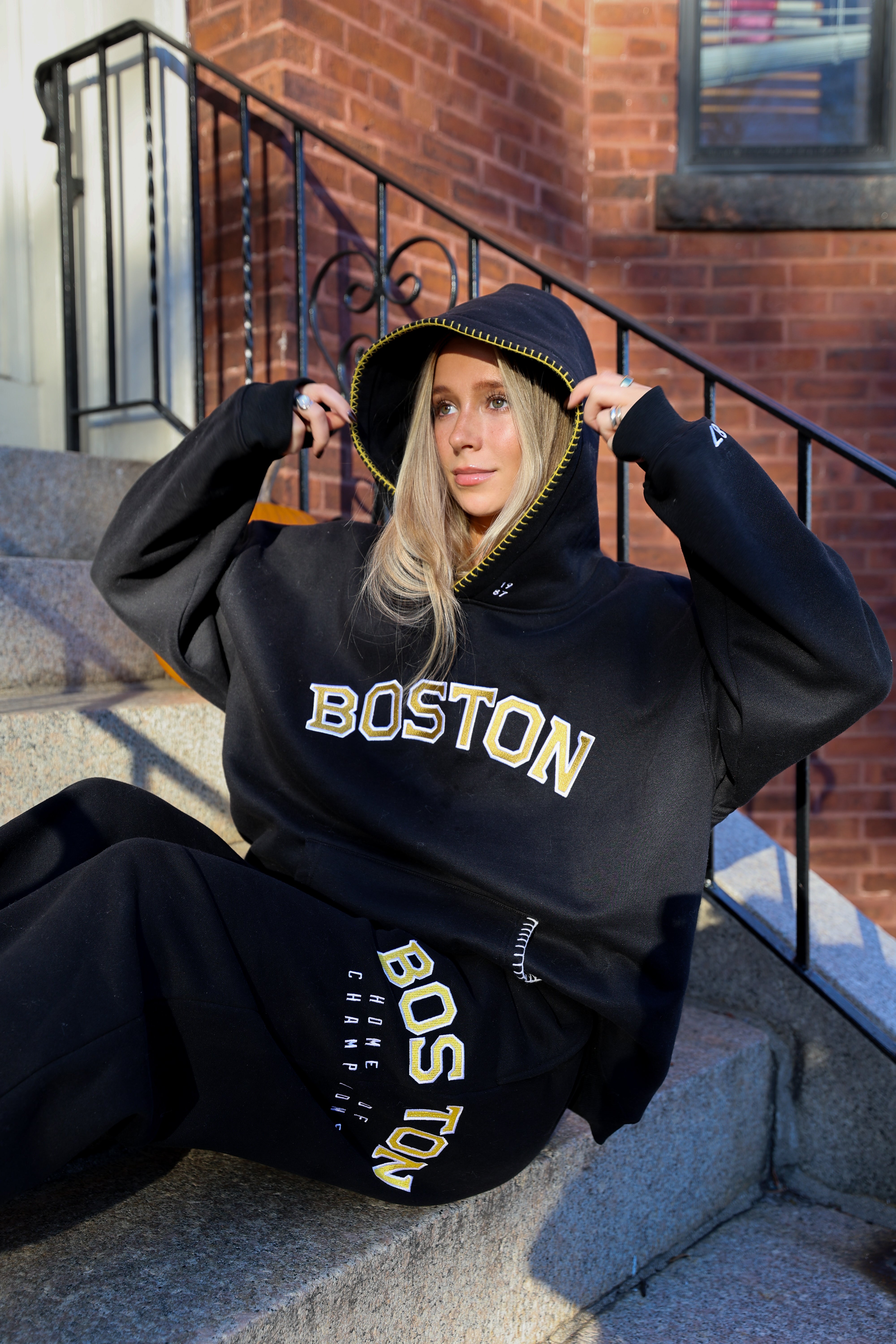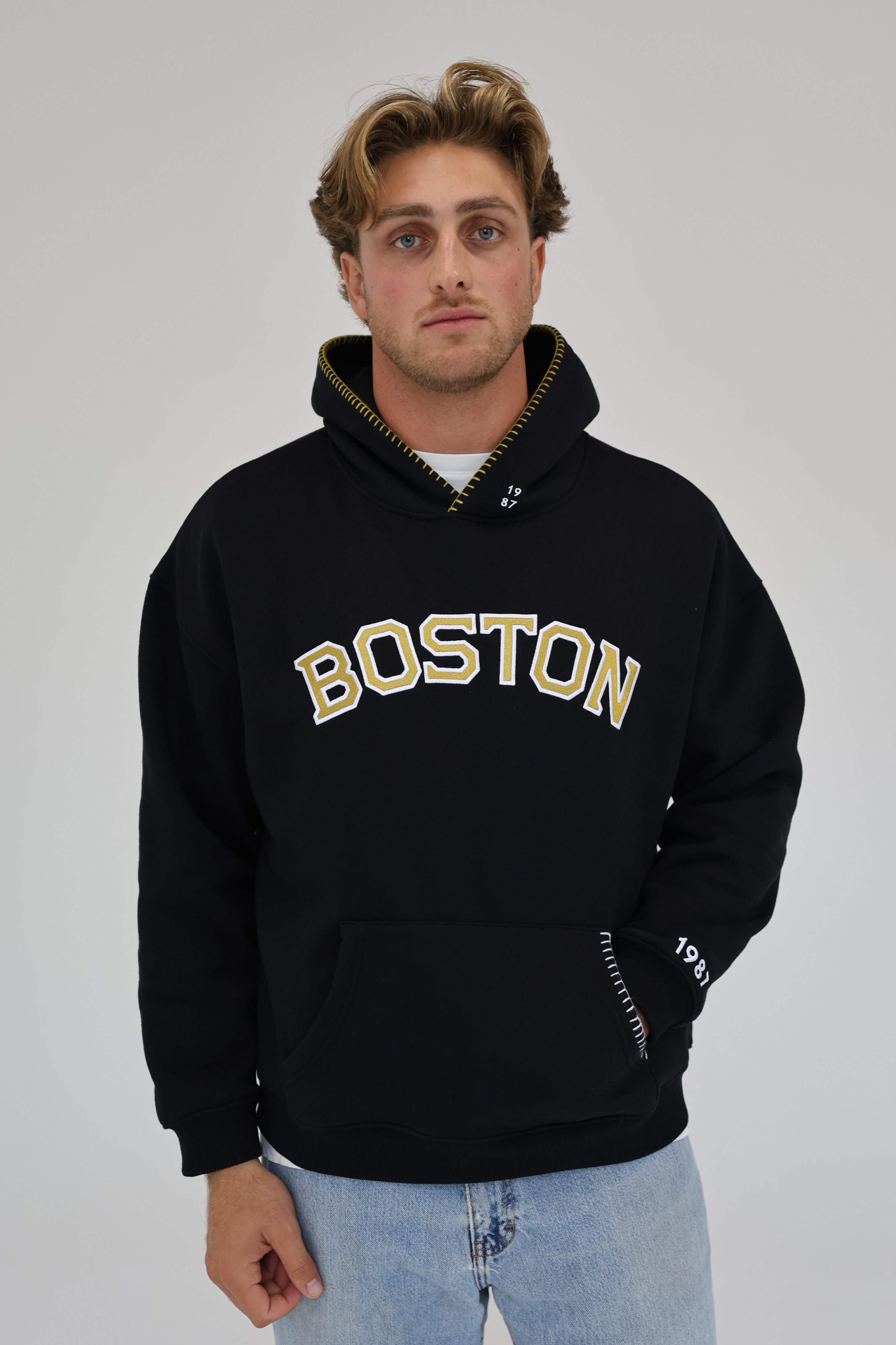 Cut from our premium, ultra-soft fleece, this unisex hoodie delivers oversized, boyfriend-fit comfort perfect for layering or everyday wear. The bold Boston embroidery, rendered in a classic varsity font, is meticulously stitched for lasting durability and a luxe finish. Contrast whipstitch detailing along the hood and pocket adds a distinctive, elevated touch.