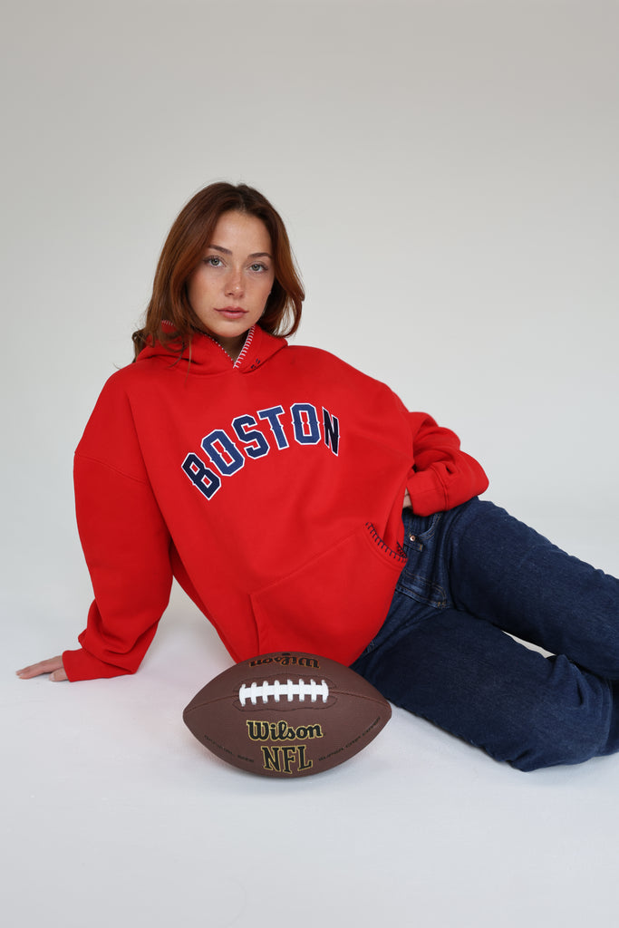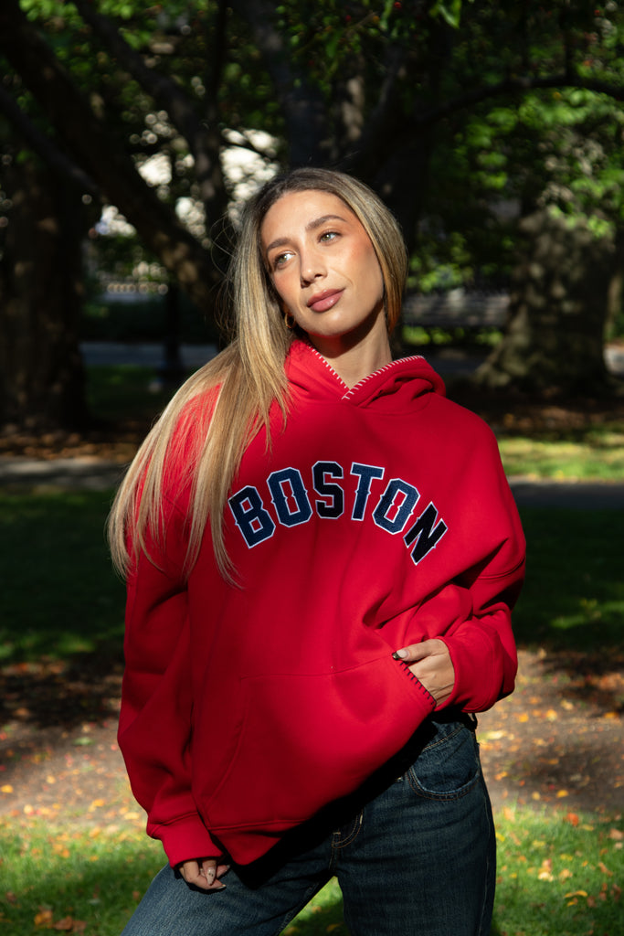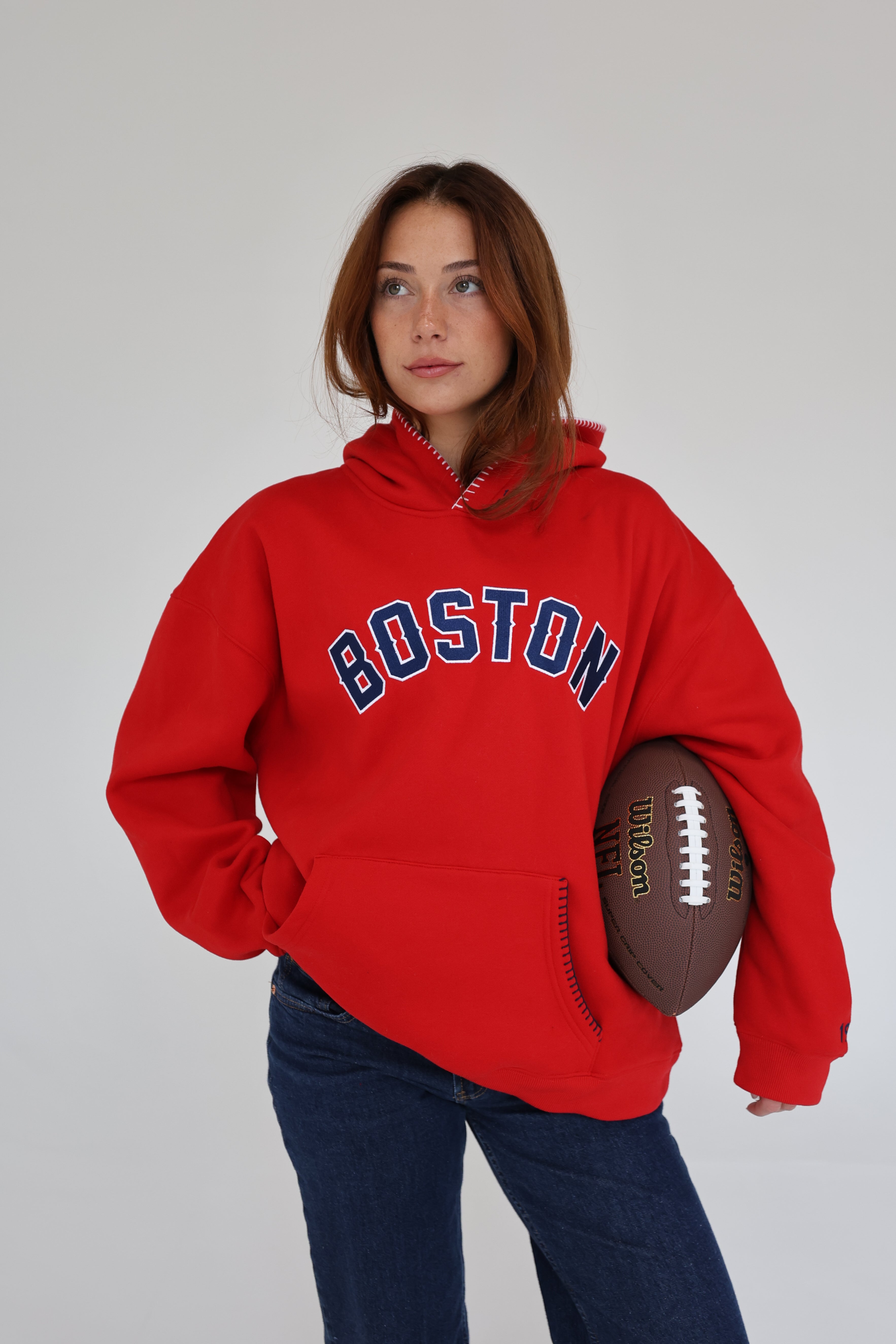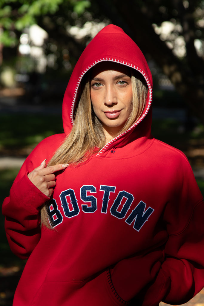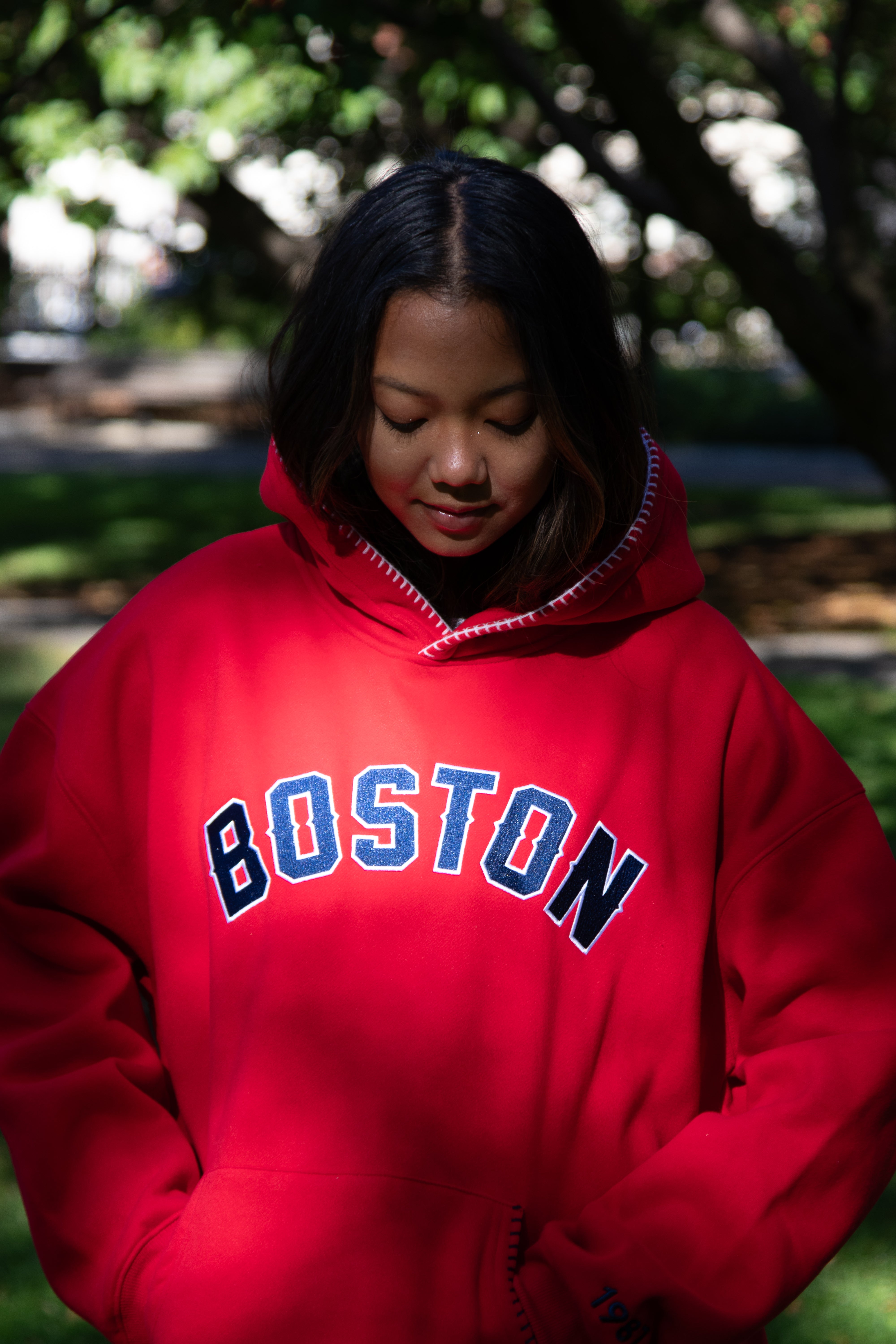 Cut from our premium, ultra-soft fleece, this unisex hoodie delivers oversized, boyfriend-fit comfort perfect for layering or everyday wear. The bold Boston embroidery, rendered in a classic varsity font, is meticulously stitched for lasting durability and a luxe finish. Contrast whipstitch detailing along the hood and pocket adds a distinctive, elevated touch — a collector’s piece for true fans and the ones who made it viral.