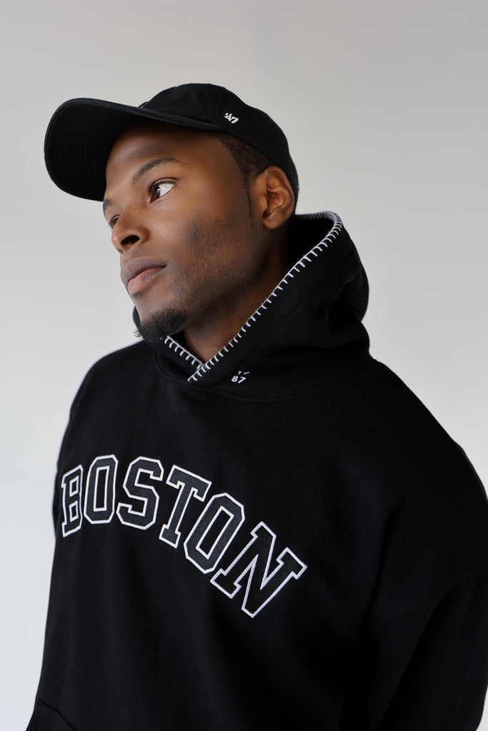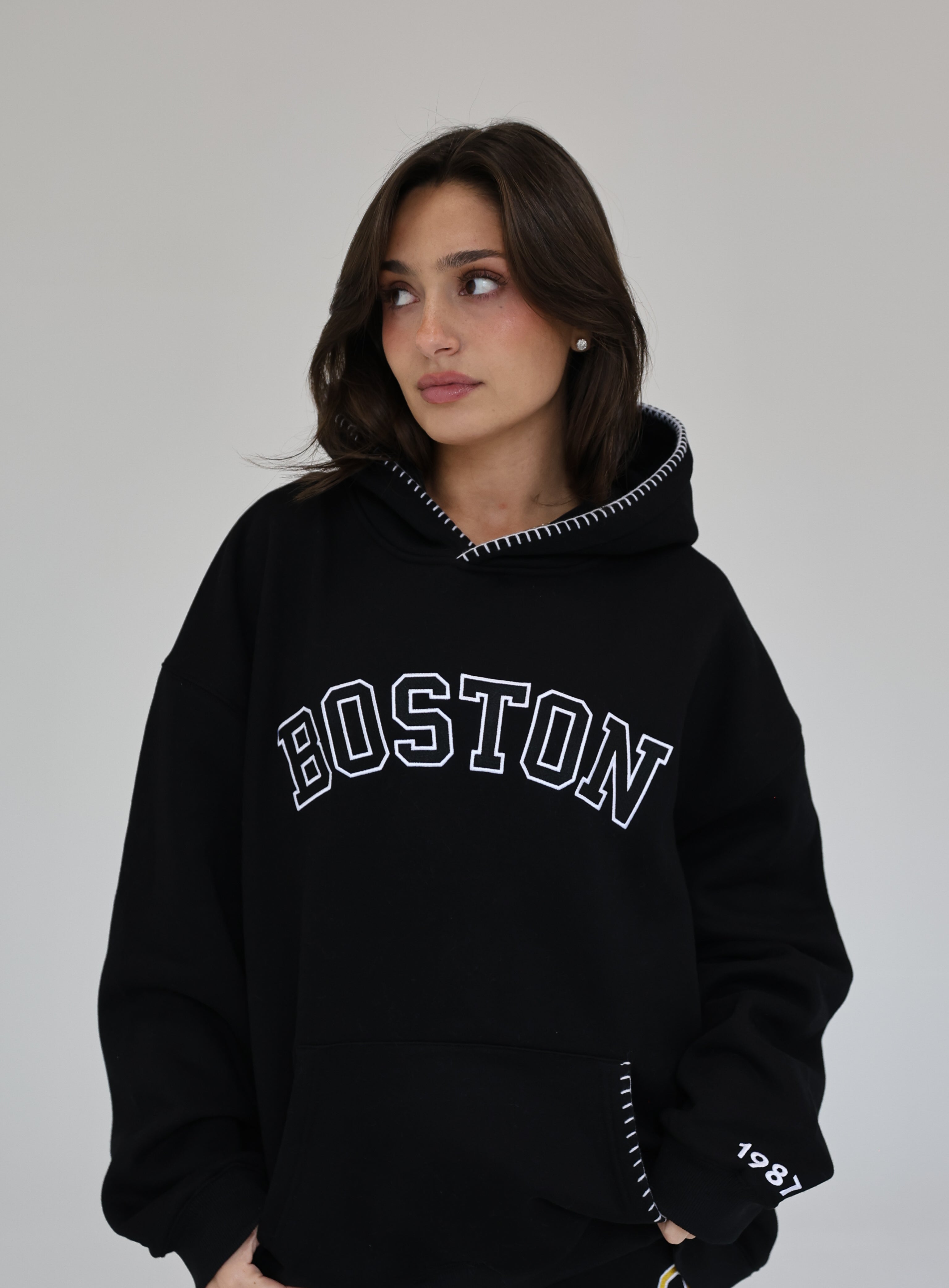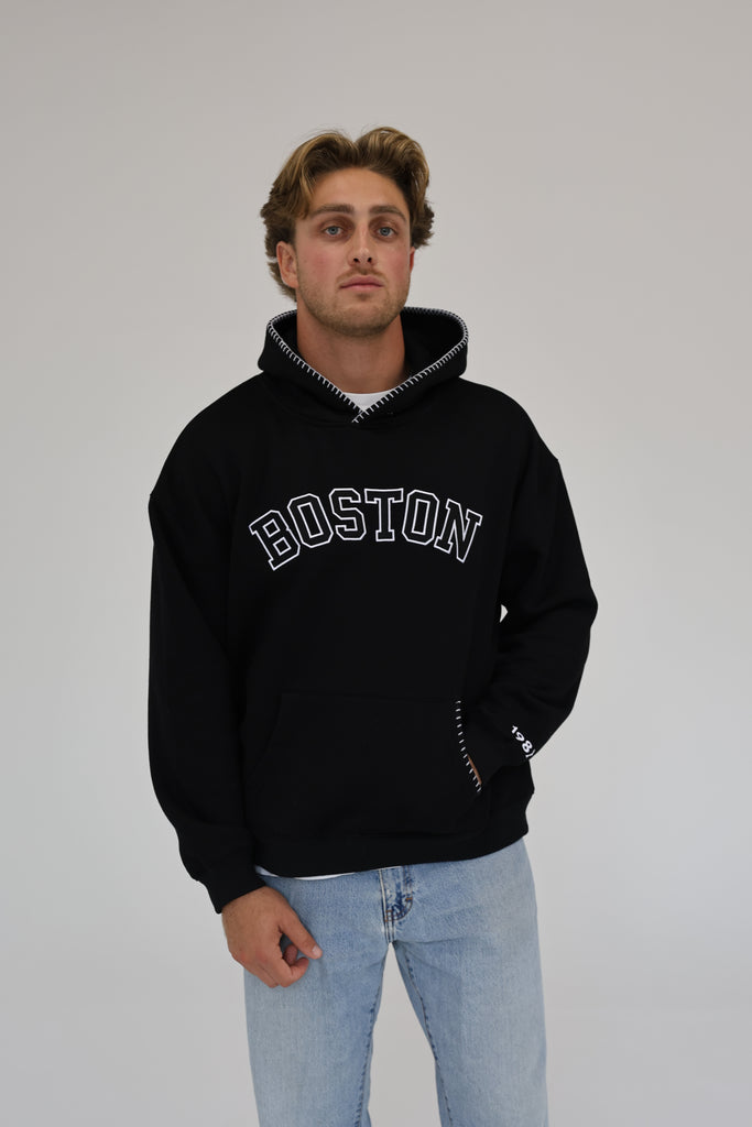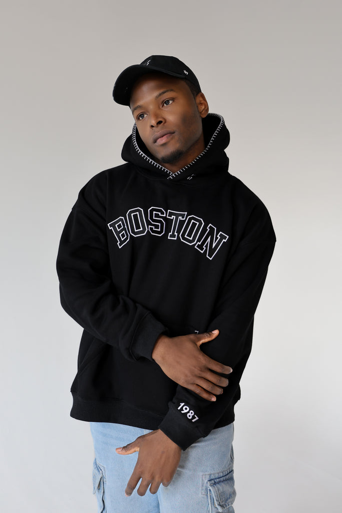 Cut from our premium, ultra-soft fleece, this unisex hoodie delivers oversized, boyfriend-fit comfort perfect for layering or everyday wear. The bold Boston embroidery, rendered in a classic varsity font, is meticulously stitched for lasting durability and a luxe finish. Contrast whipstitch detailing along the hood and pocket adds a distinctive, elevated touch.