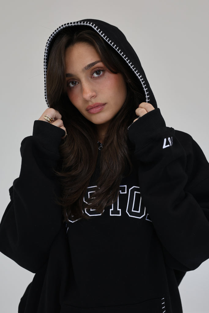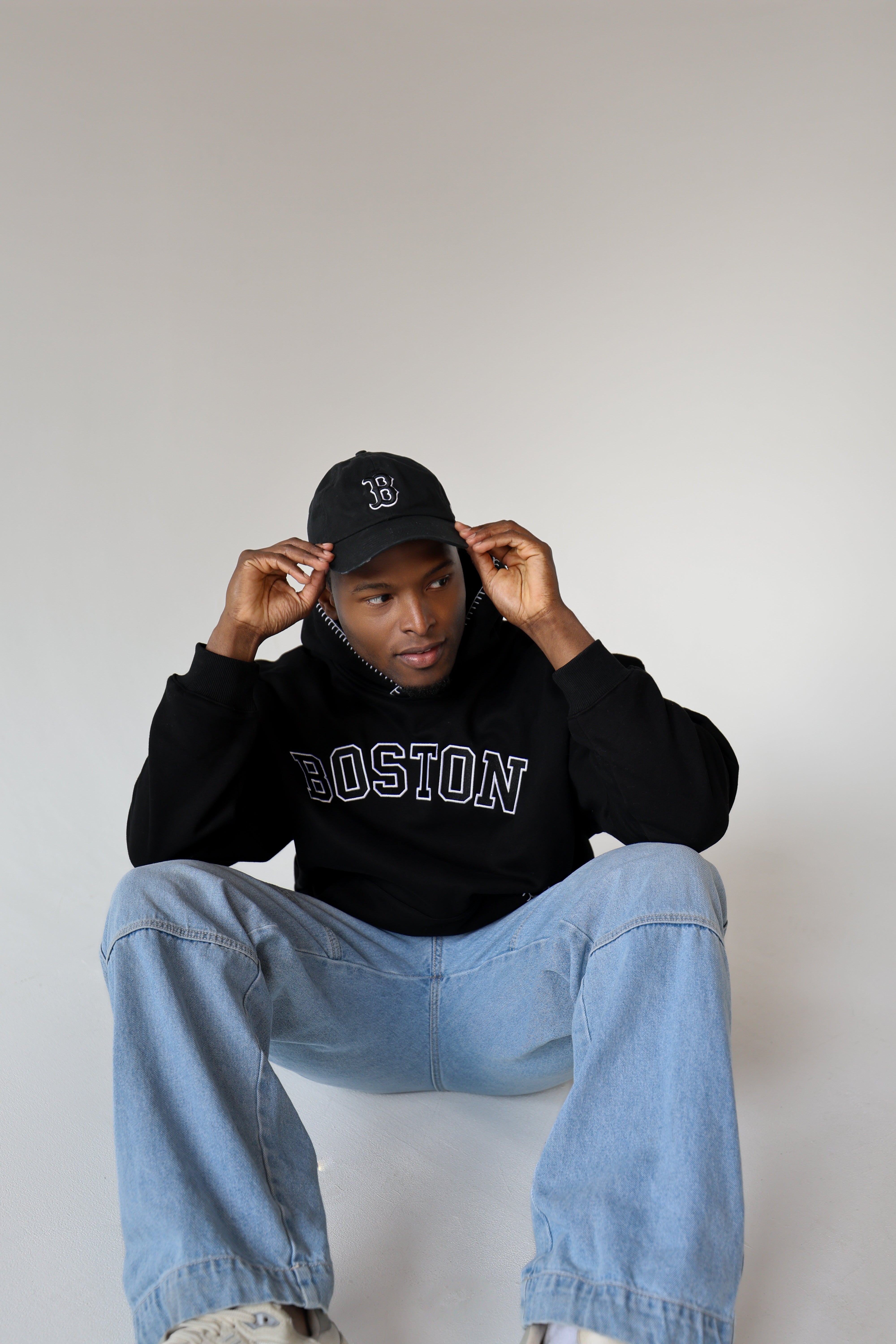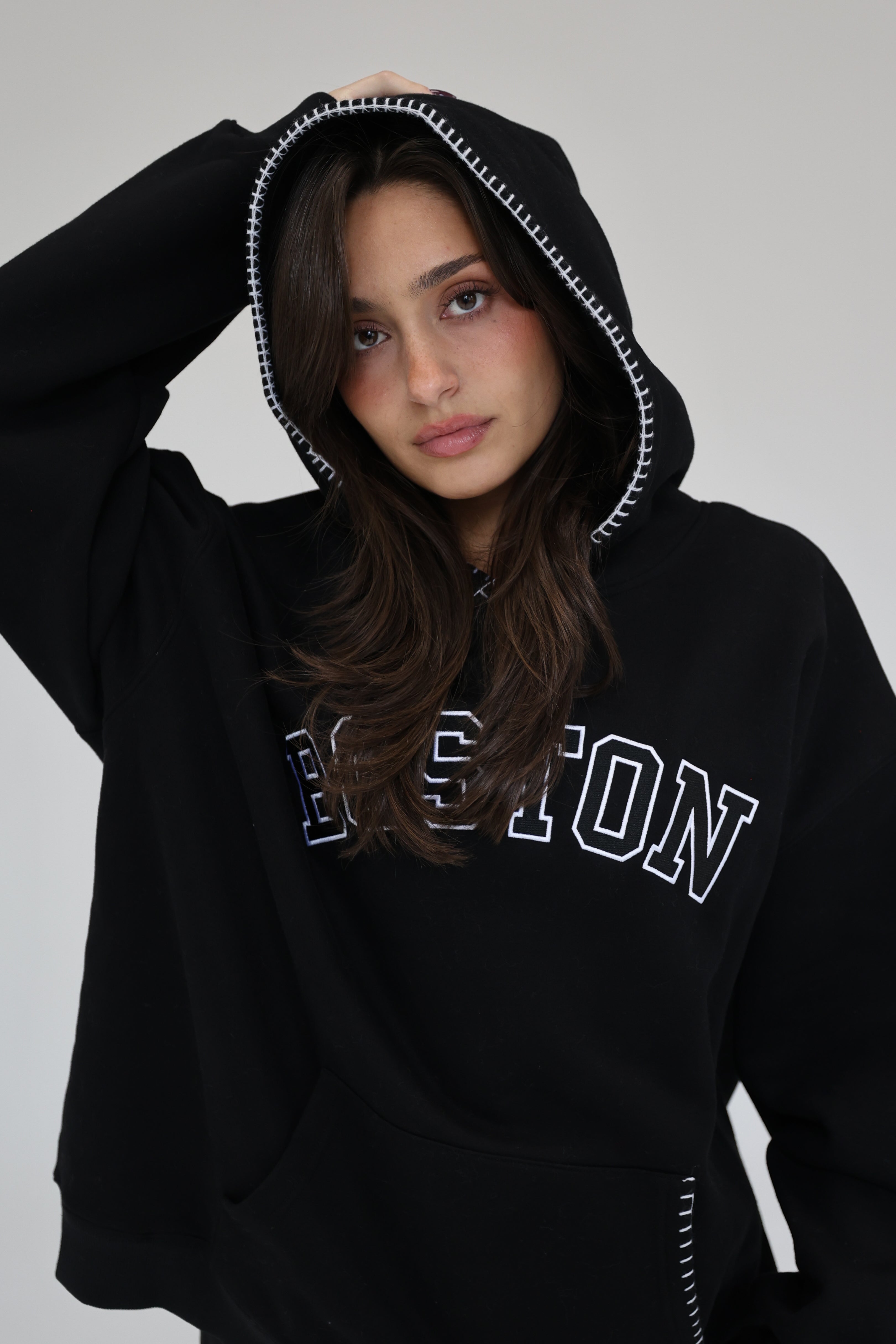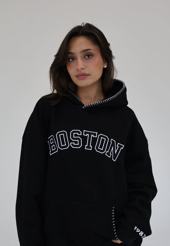 Cut from our premium, ultra-soft fleece, this unisex hoodie delivers oversized, boyfriend-fit comfort perfect for layering or everyday wear. The bold Boston embroidery, rendered in a classic varsity font, is meticulously stitched for lasting durability and a luxe finish. Contrast whipstitch detailing along the hood and pocket adds a distinctive, elevated touch.