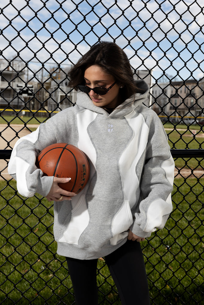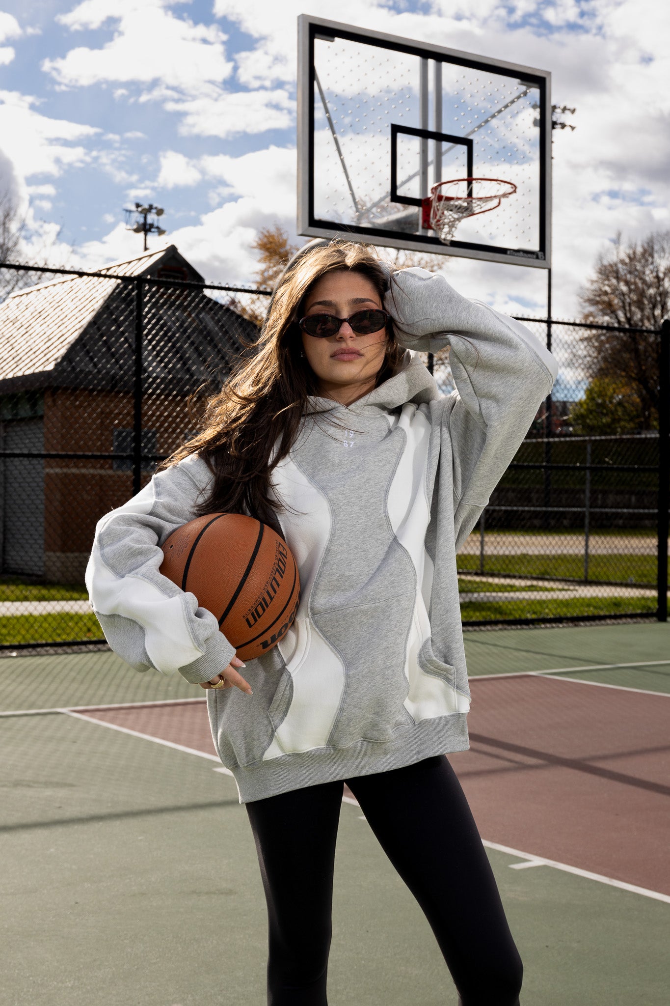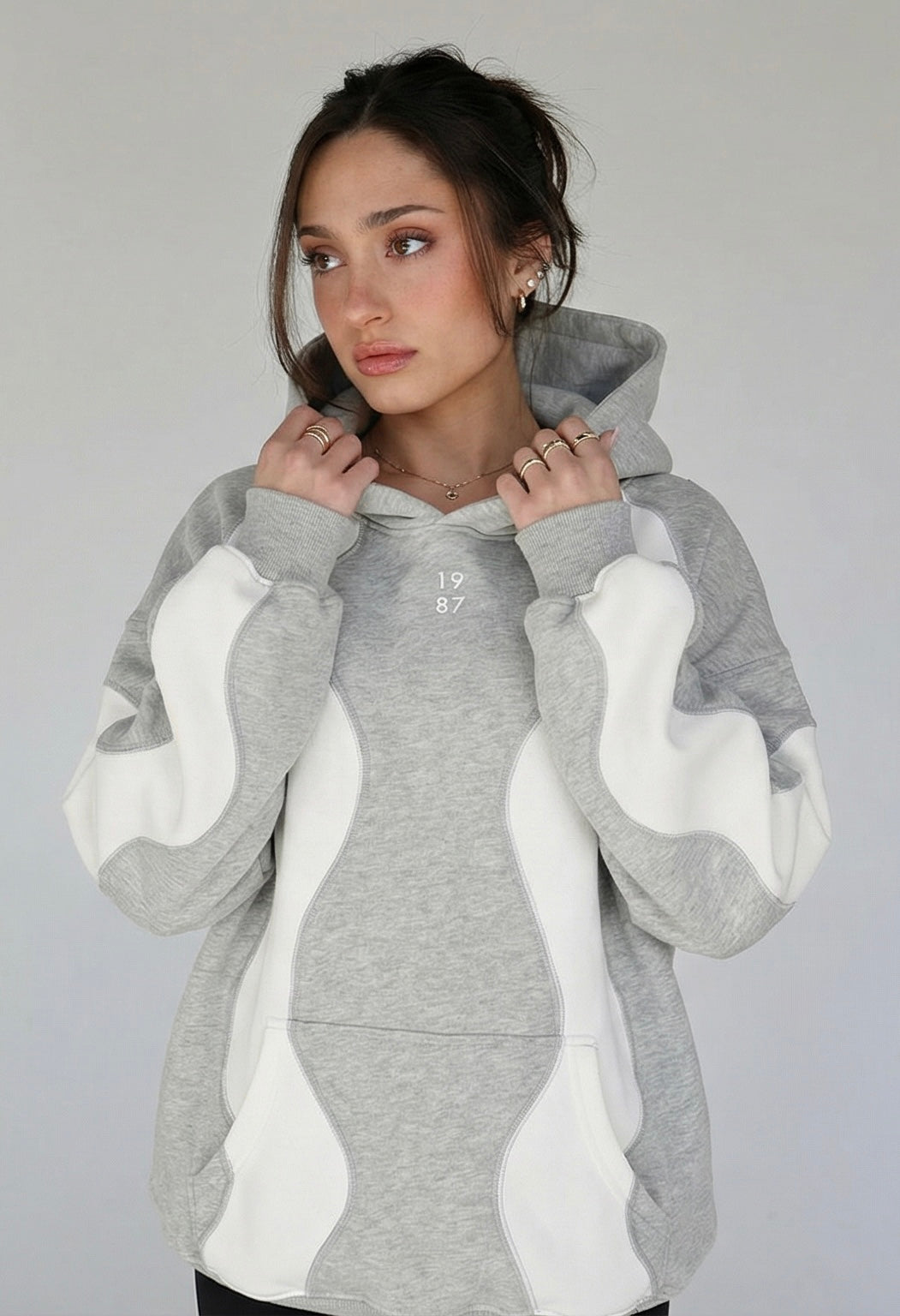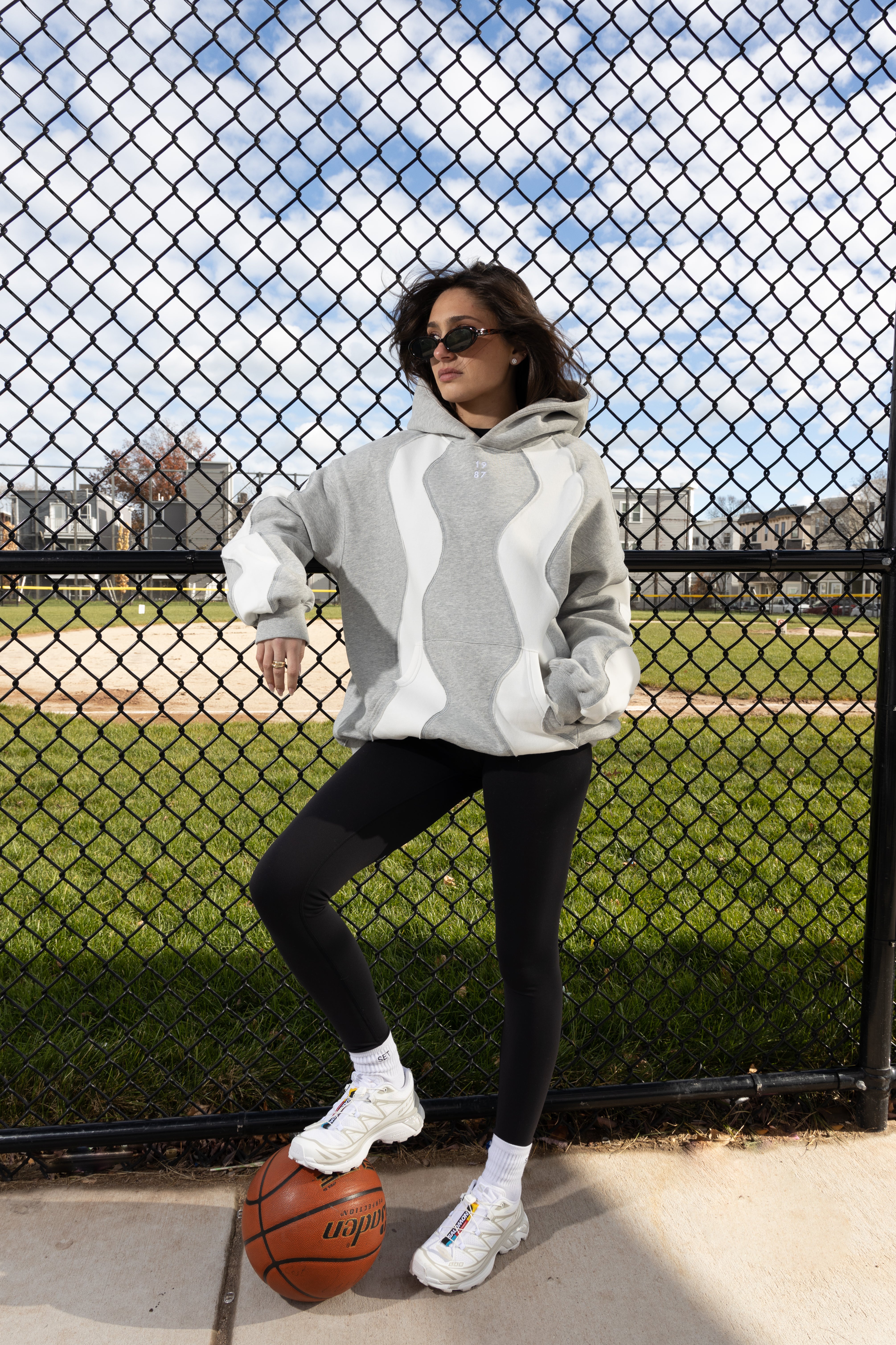 The contrast white panels ripple through the heather-grey base, creating a dimensional look that stands out without shouting. Oversized yet structured, it’s the kind of hoodie you reach for every day — for morning walks, city layers, or heading to and from training.