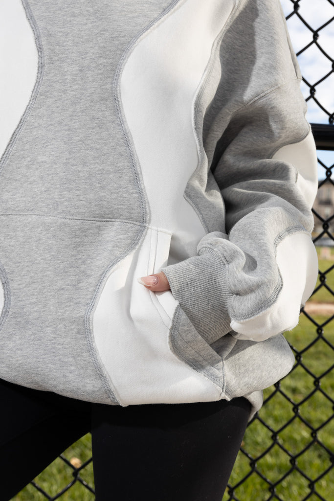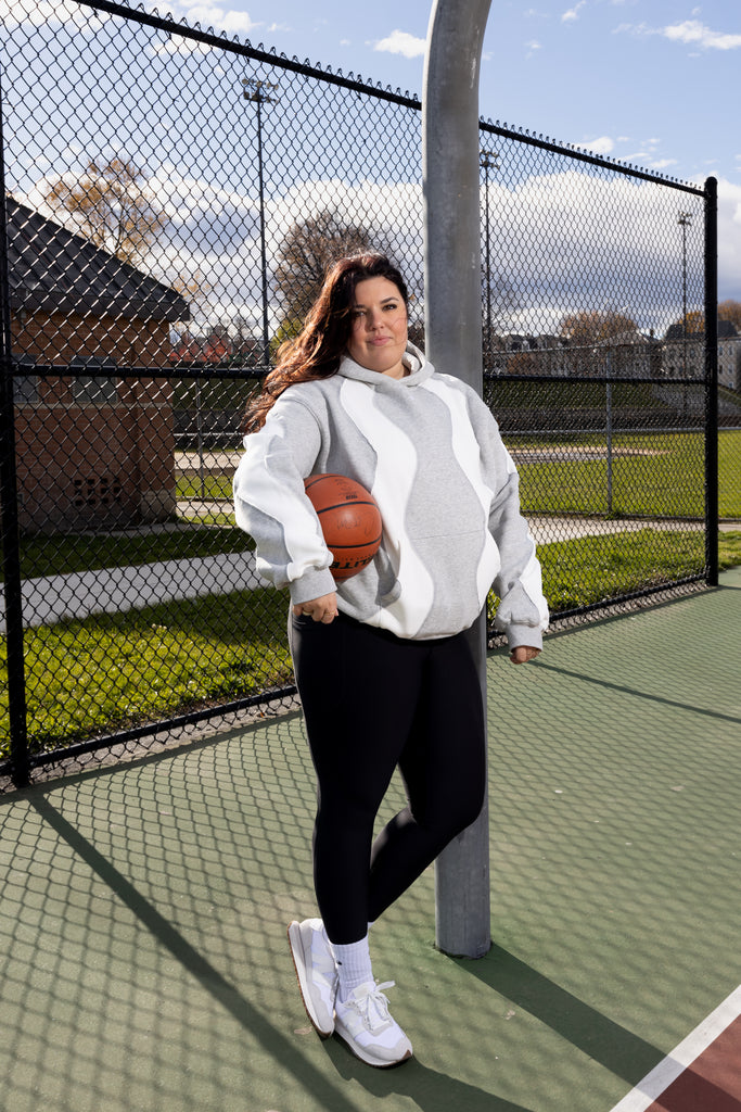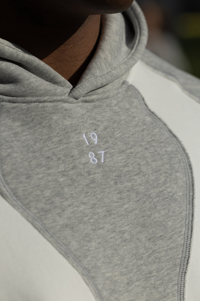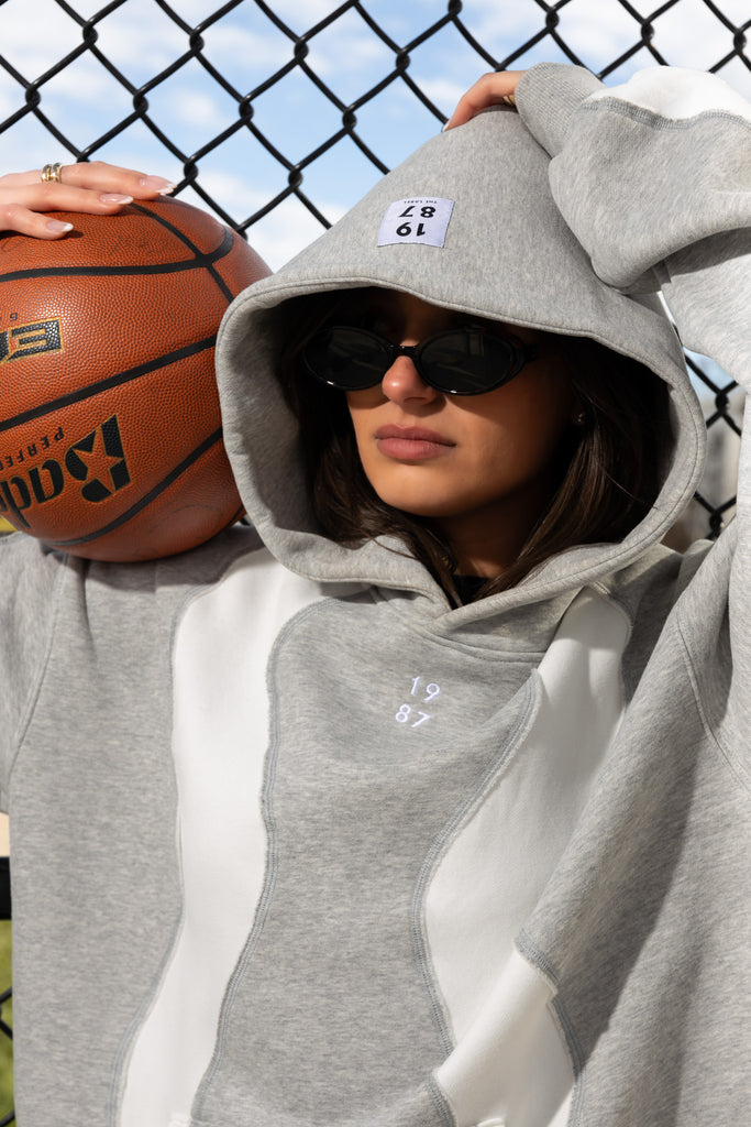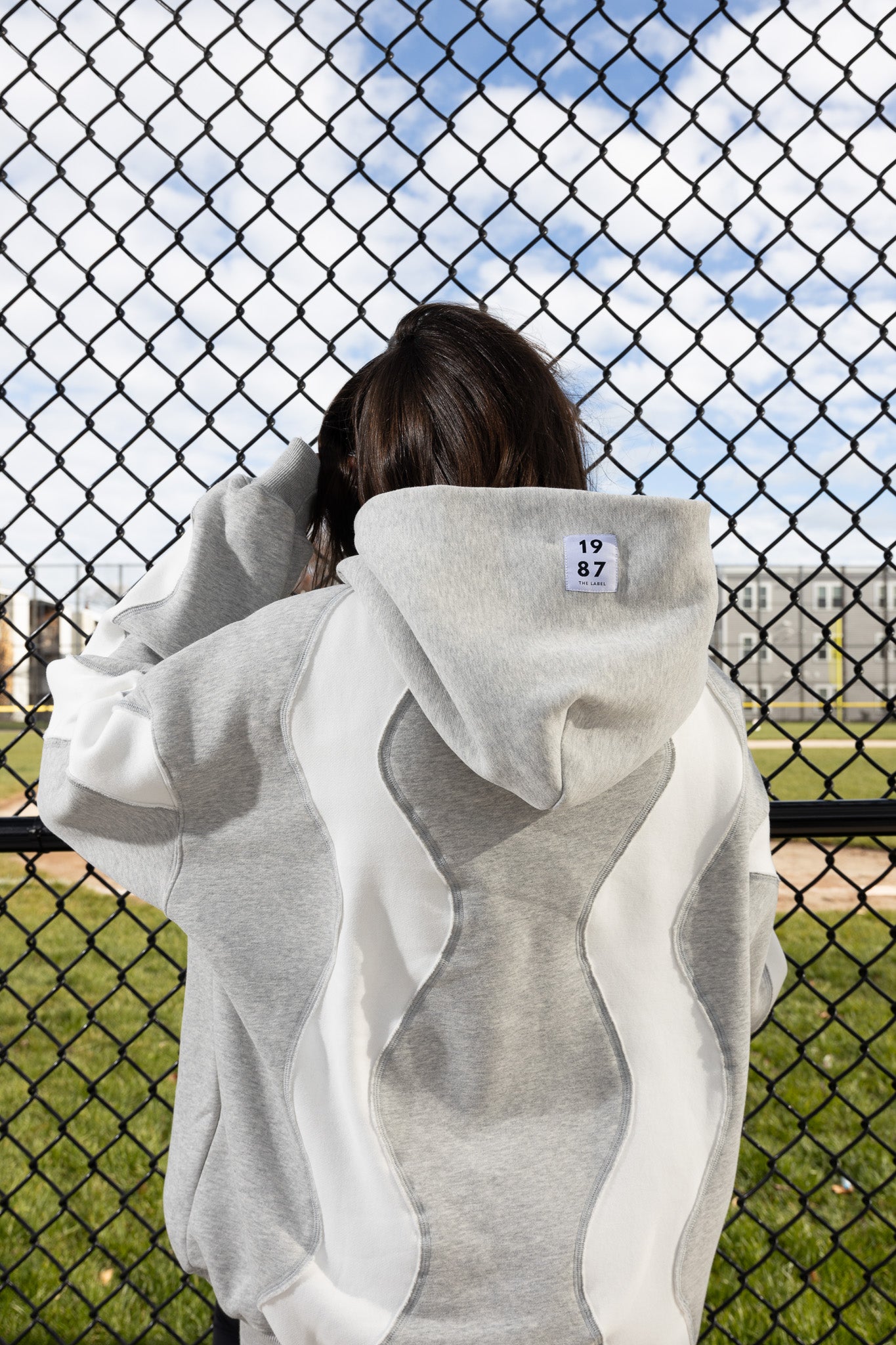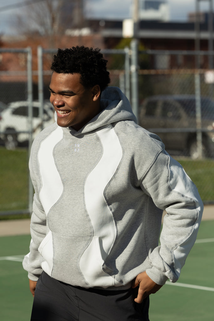 The contrast white panels ripple through the heather-grey base, creating a dimensional look that stands out without shouting. Oversized yet structured, it’s the kind of hoodie you reach for every day — for morning walks, city layers, or heading to and from training.