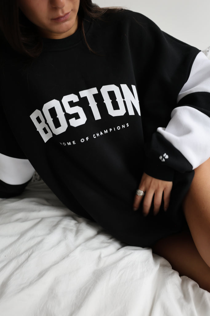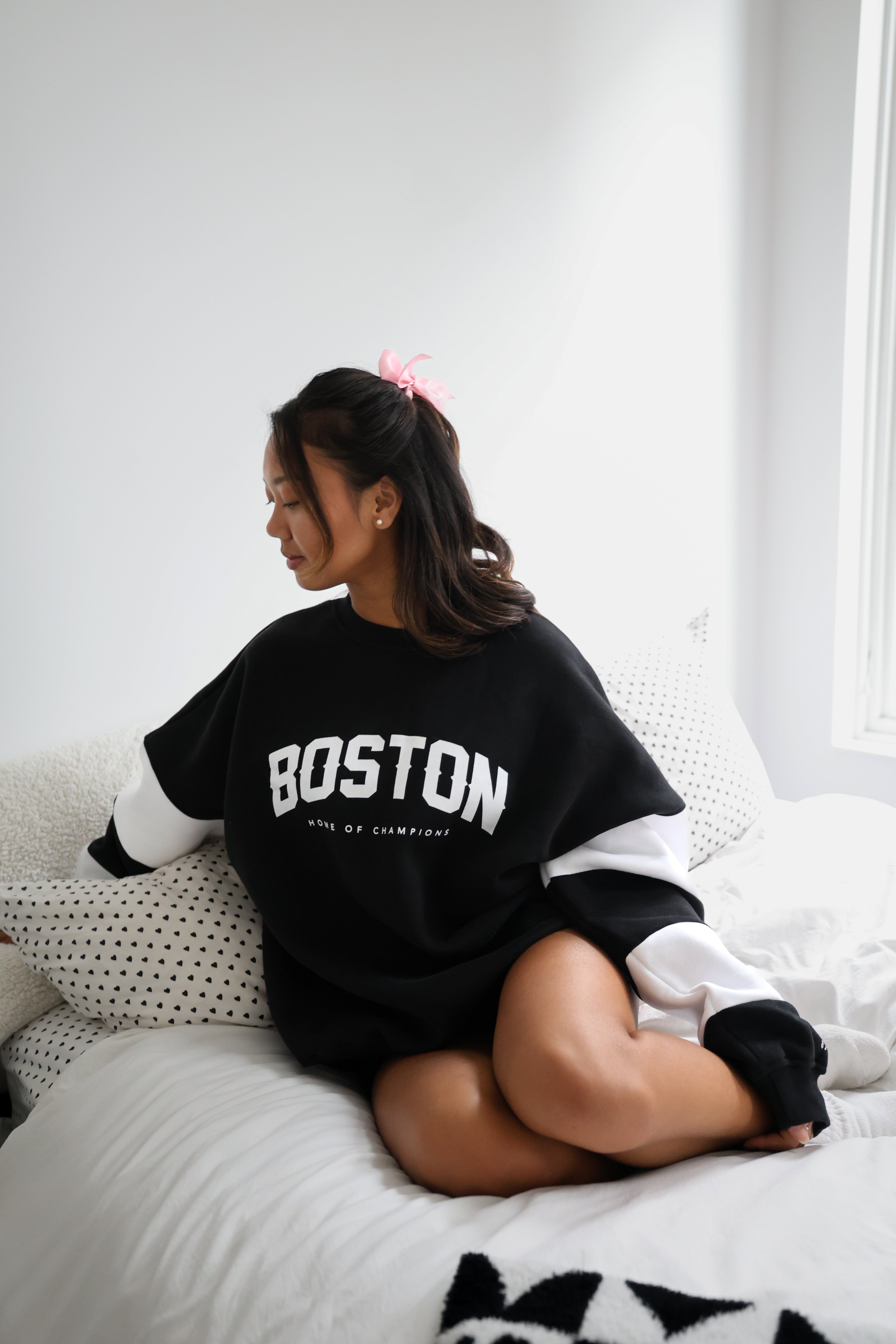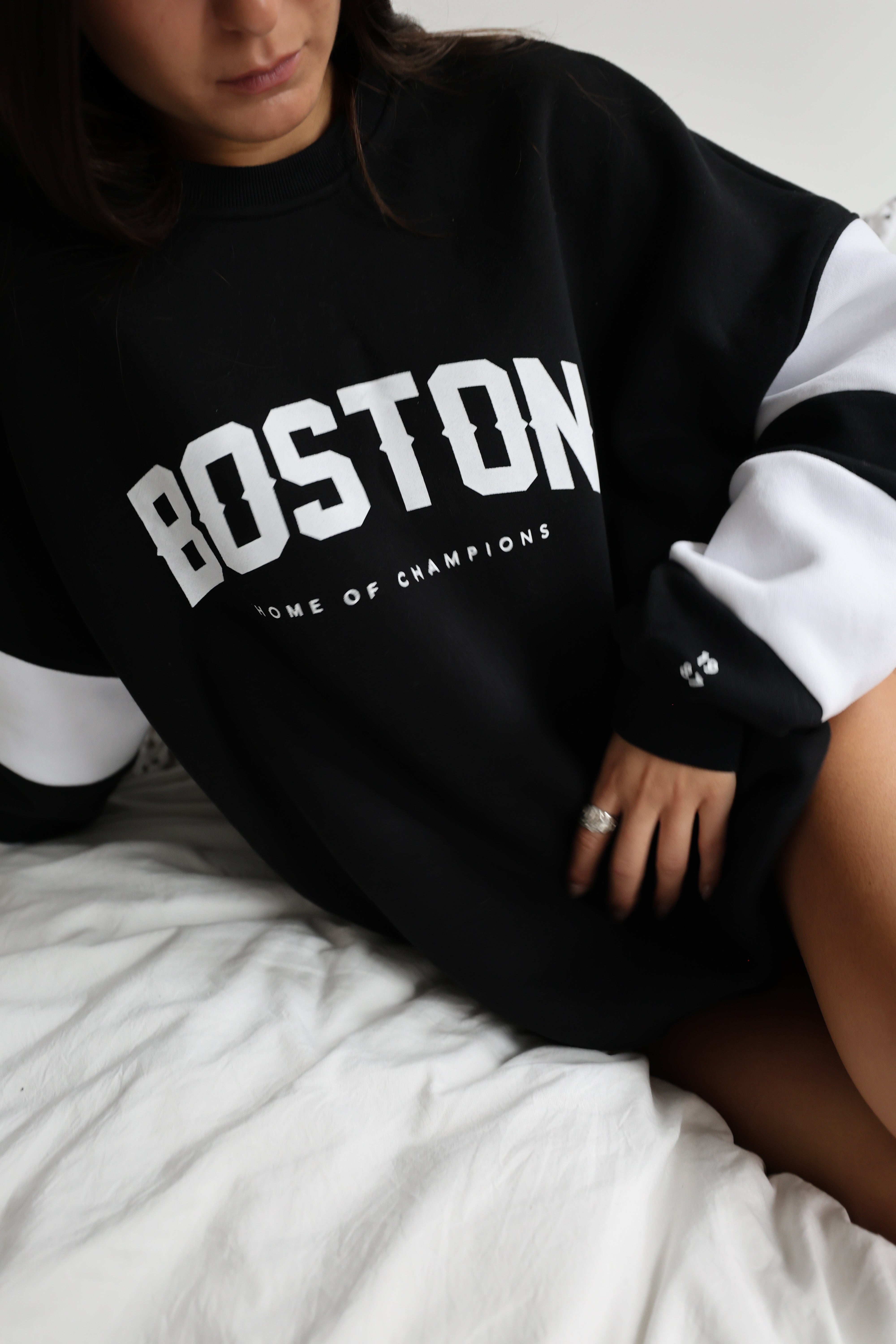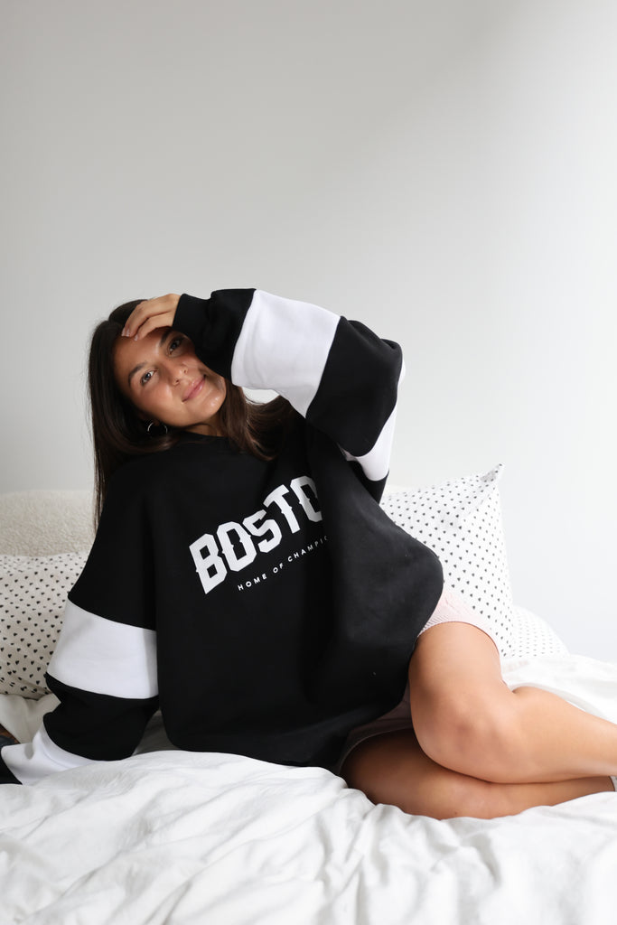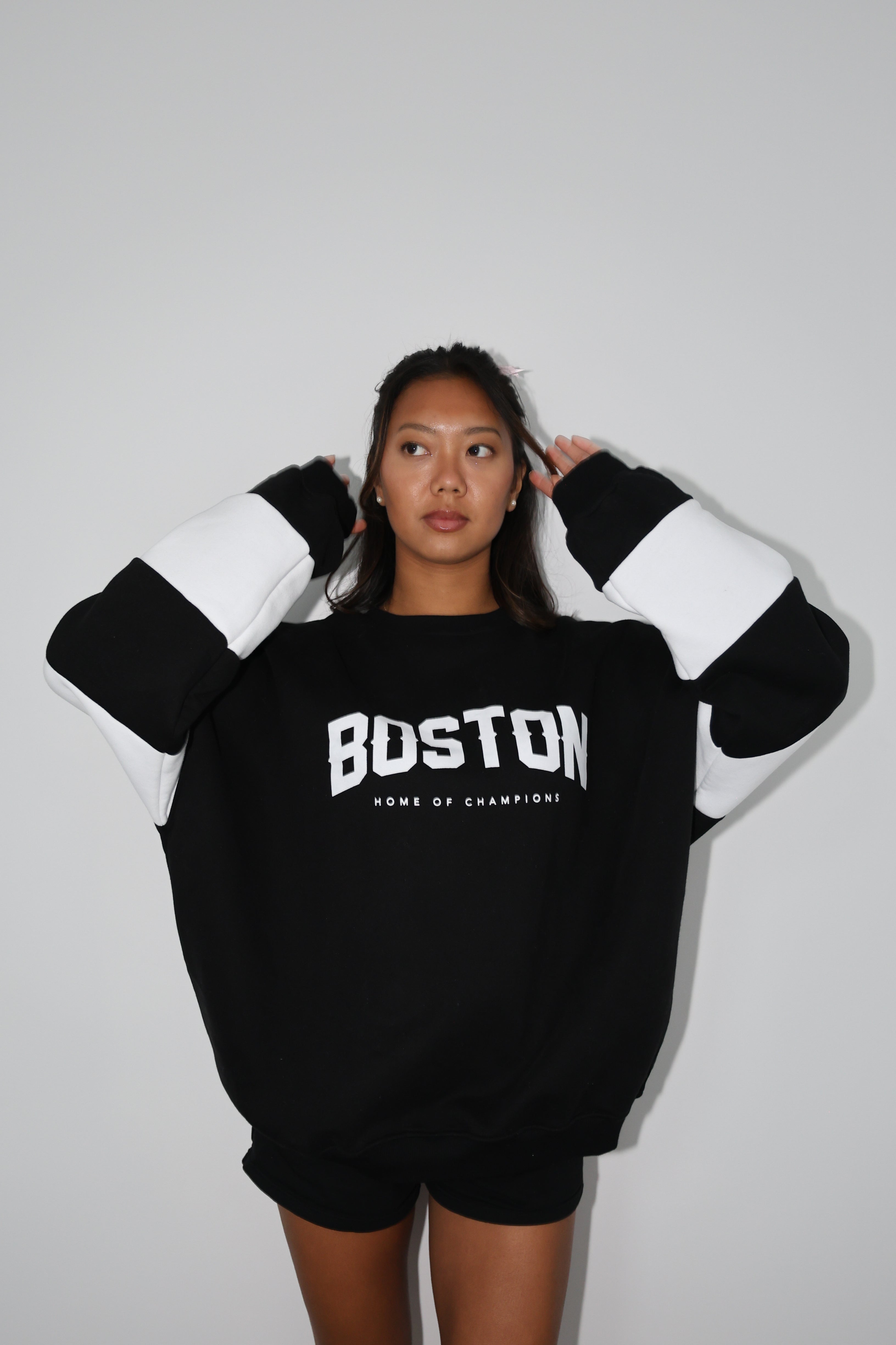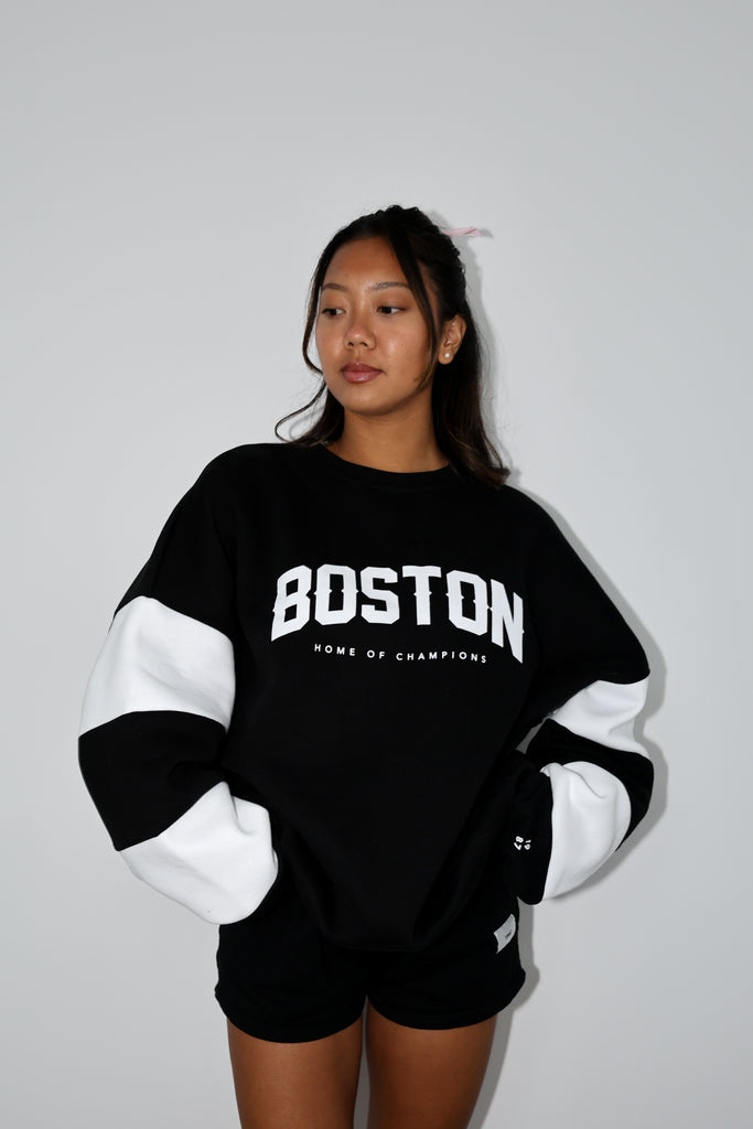 Classic Boston heritage, bold varsity edge. The Home of Champions stripe crew is crafted in a striking black-and-white palette with oversized sleeves and collegiate lettering across the chest. Designed for an effortless statement, this crew blends timeless Boston pride with a modern, relaxed silhouette.