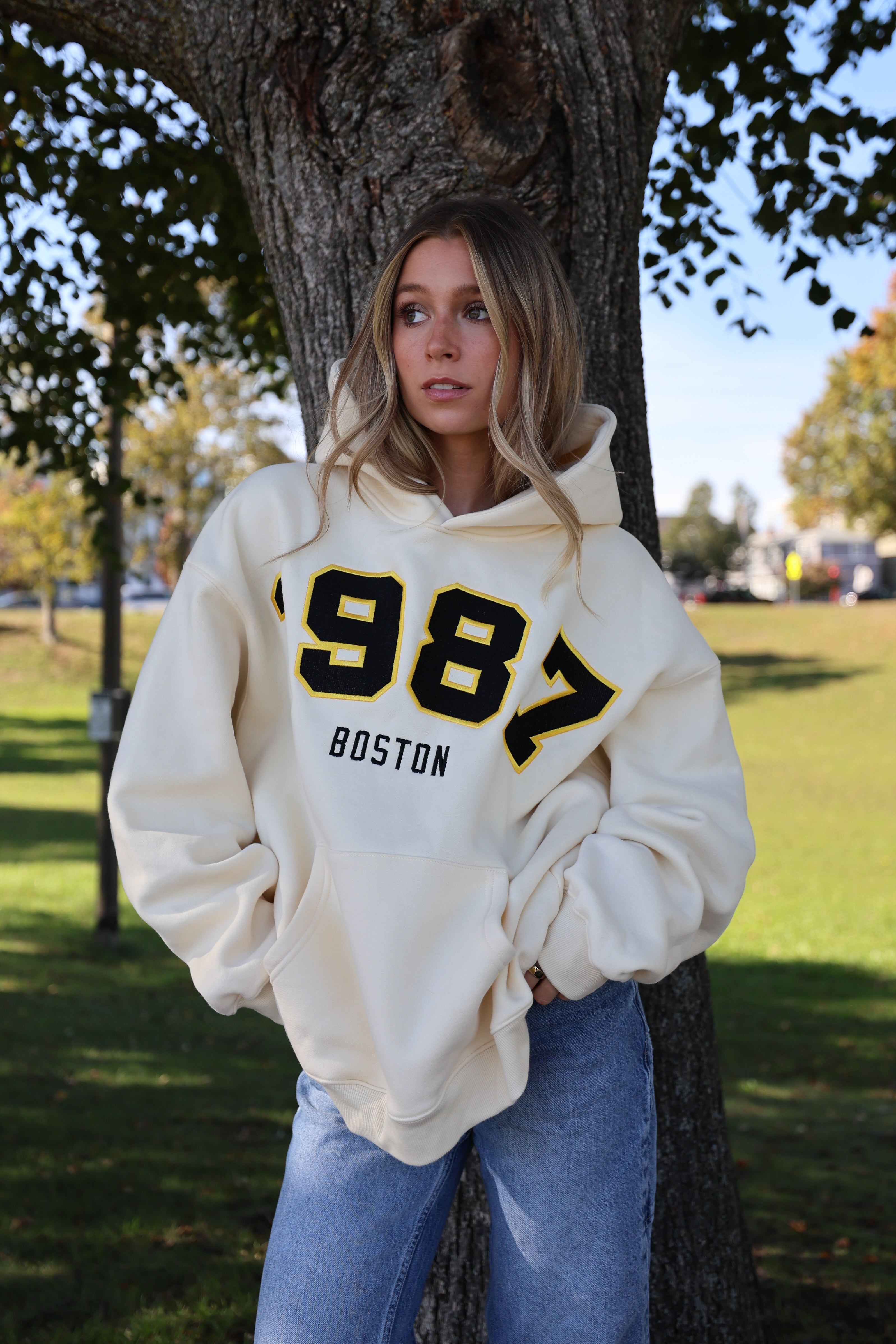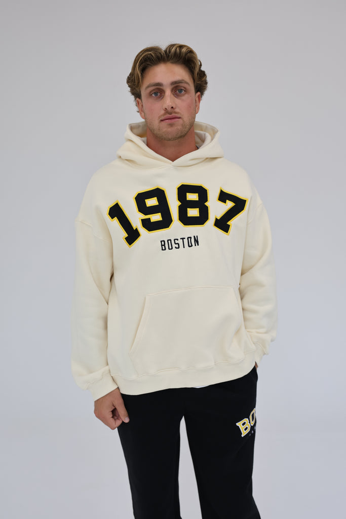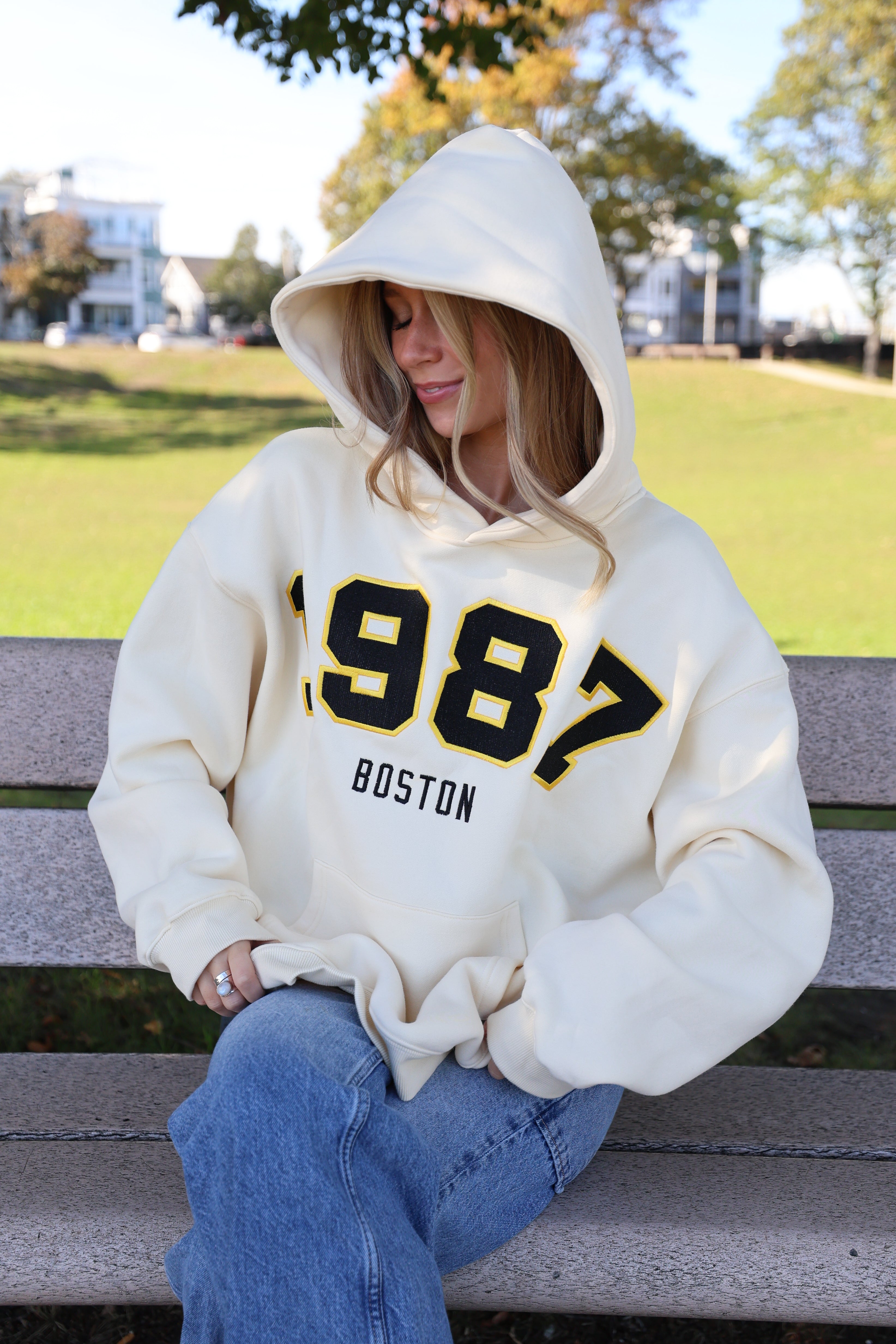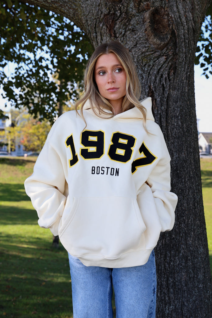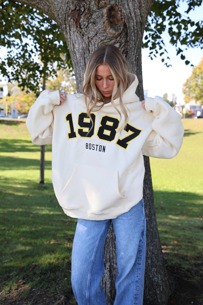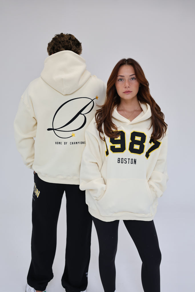 Boston’s championship legacy runs deep — and this hoodie is designed to wear it proudly. The Vintage Champs Hoodie in Champagne pays tribute to the city’s hockey heritage, featuring bold 1987 varsity appliqué outlined in black and gold — a nod to our home team's unmistakable palette.