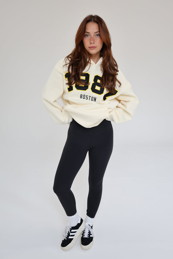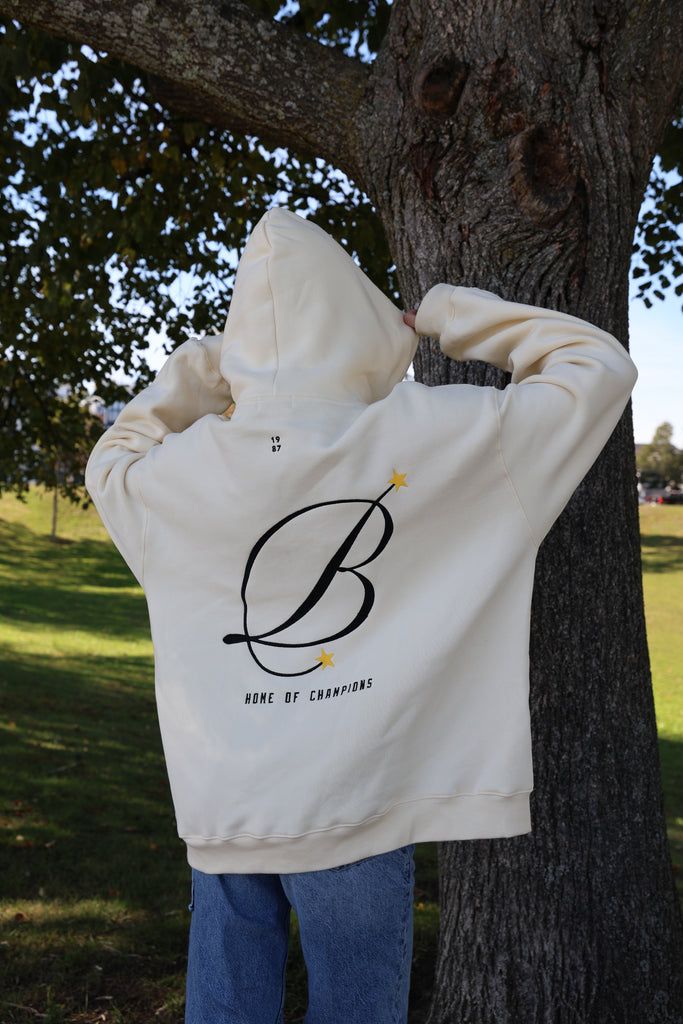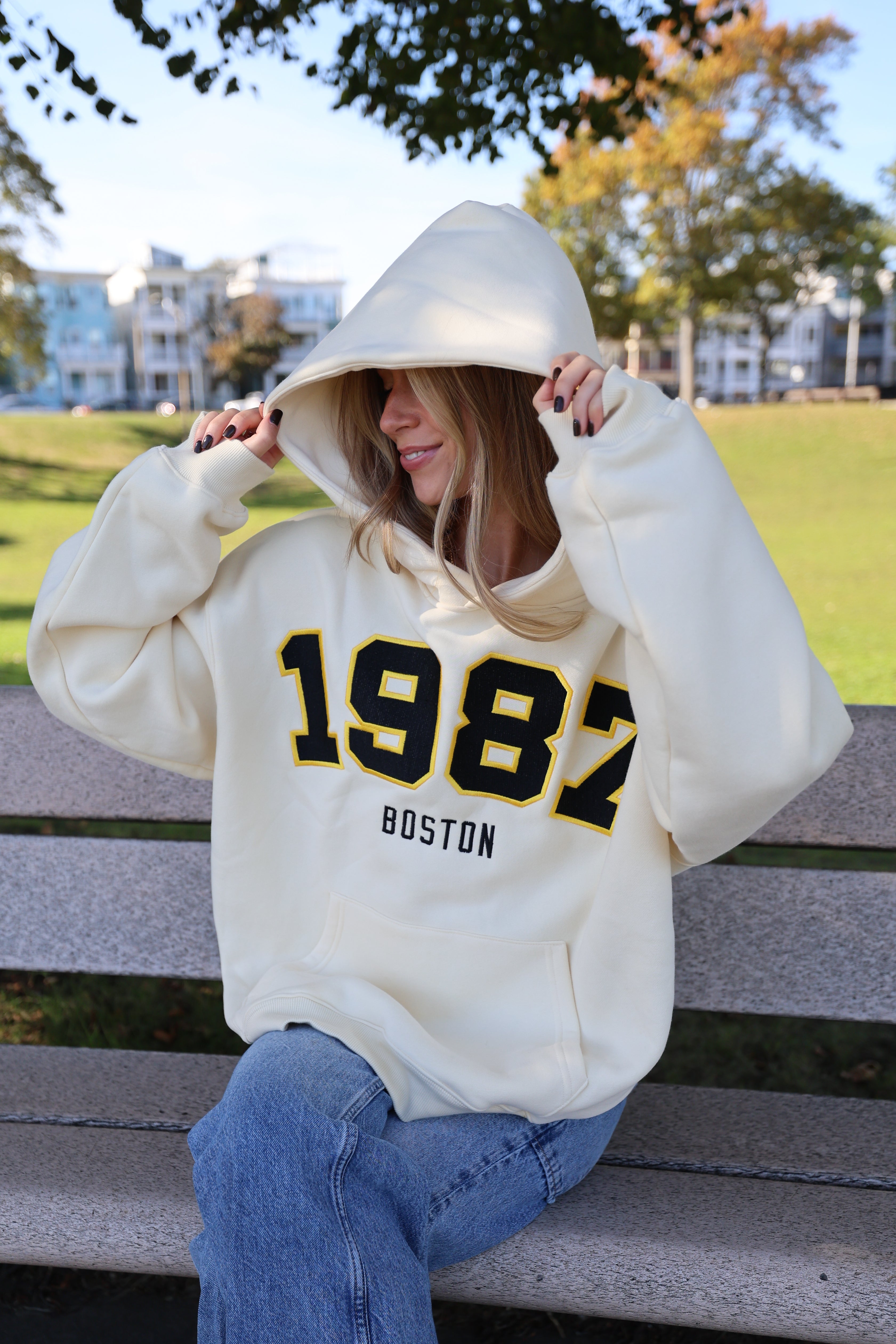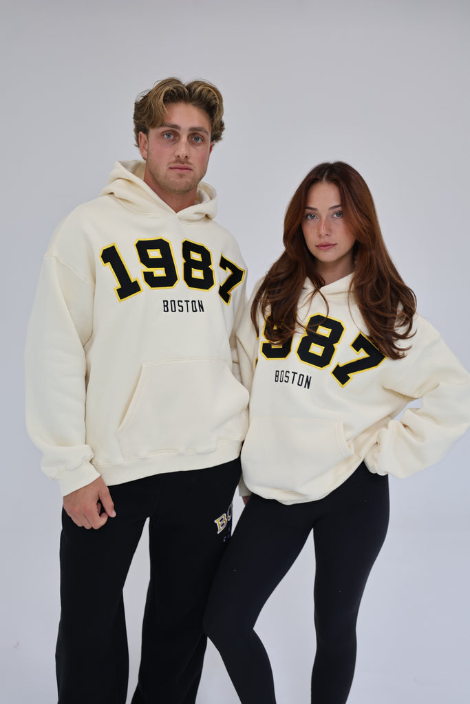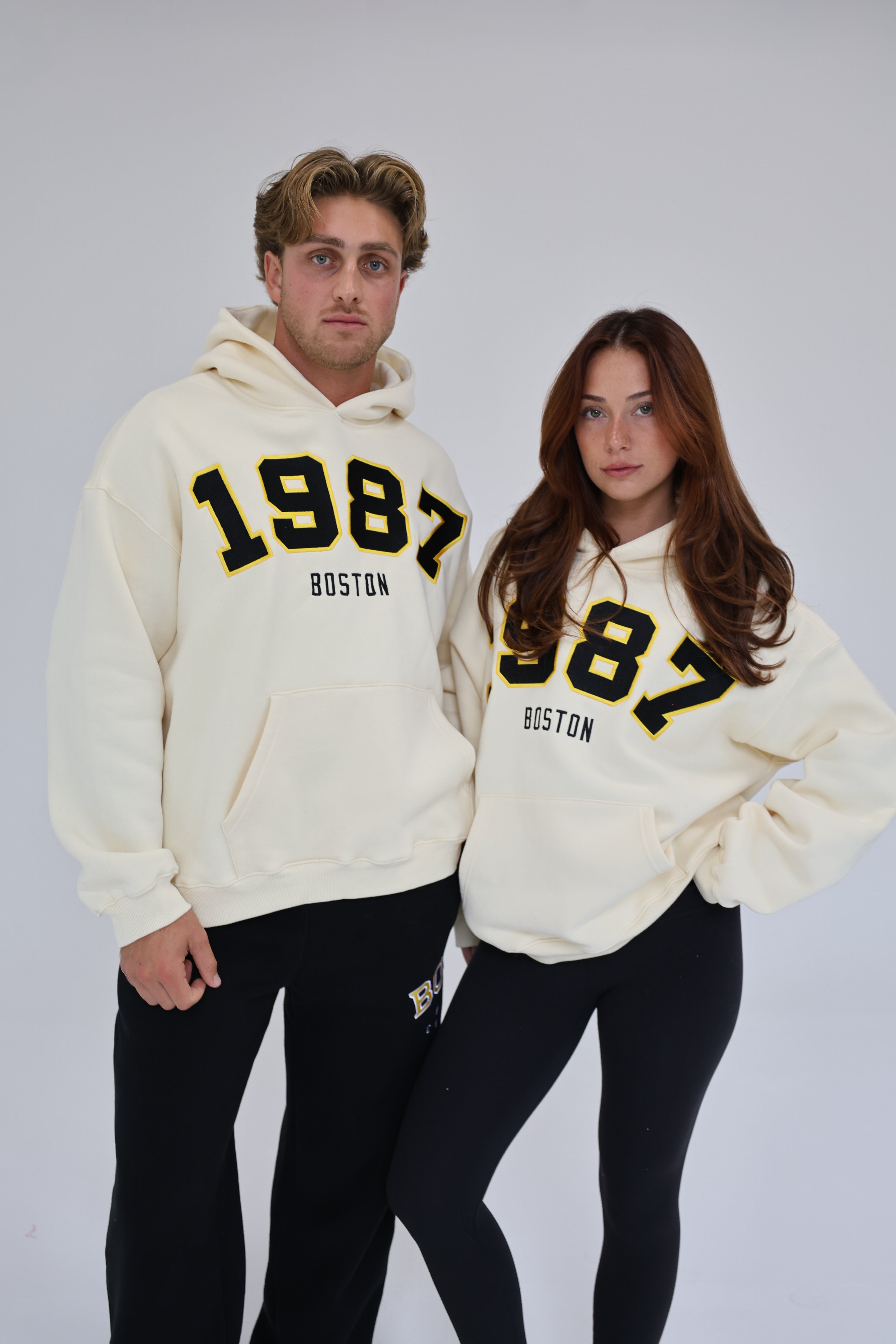 Boston’s championship legacy runs deep — and this hoodie is designed to wear it proudly. The Vintage Champs Hoodie in Champagne pays tribute to the city’s hockey heritage, featuring bold 1987 varsity appliqué outlined in black and gold — a nod to our home team's unmistakable palette.