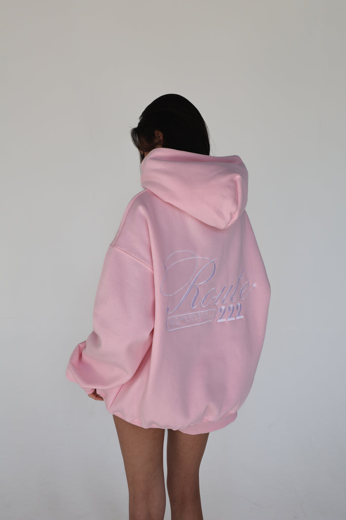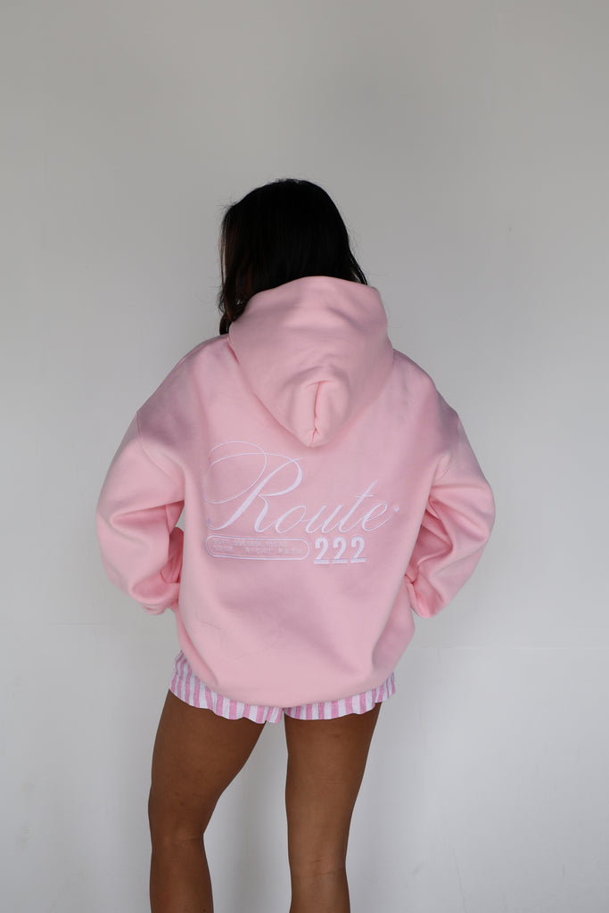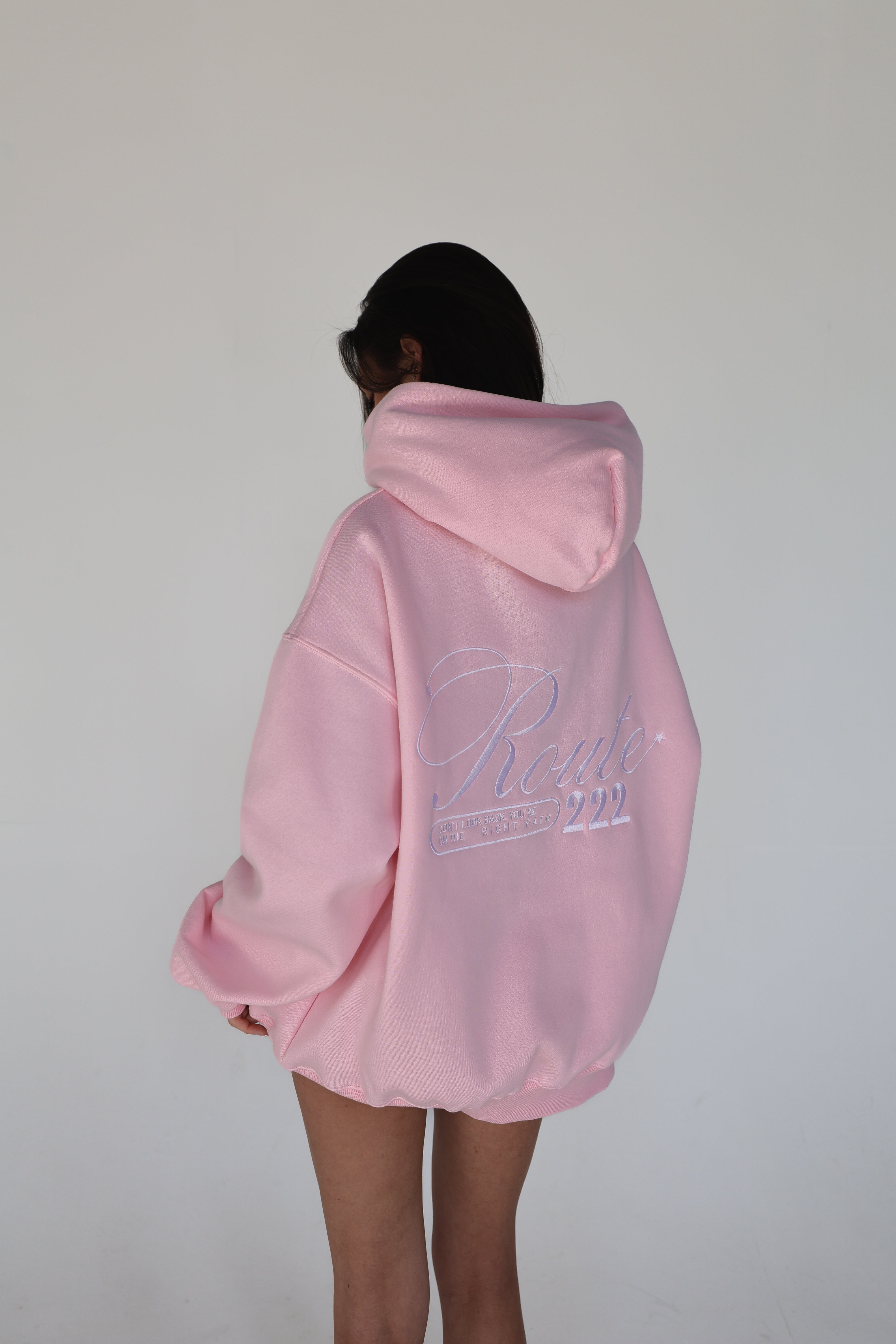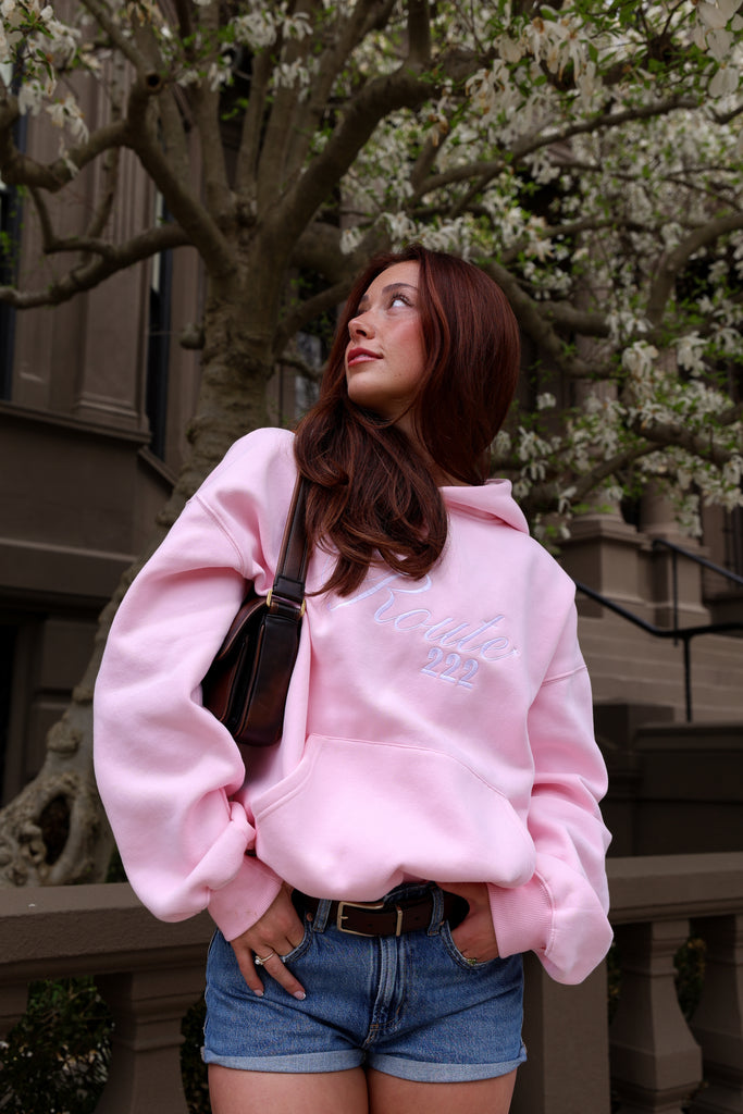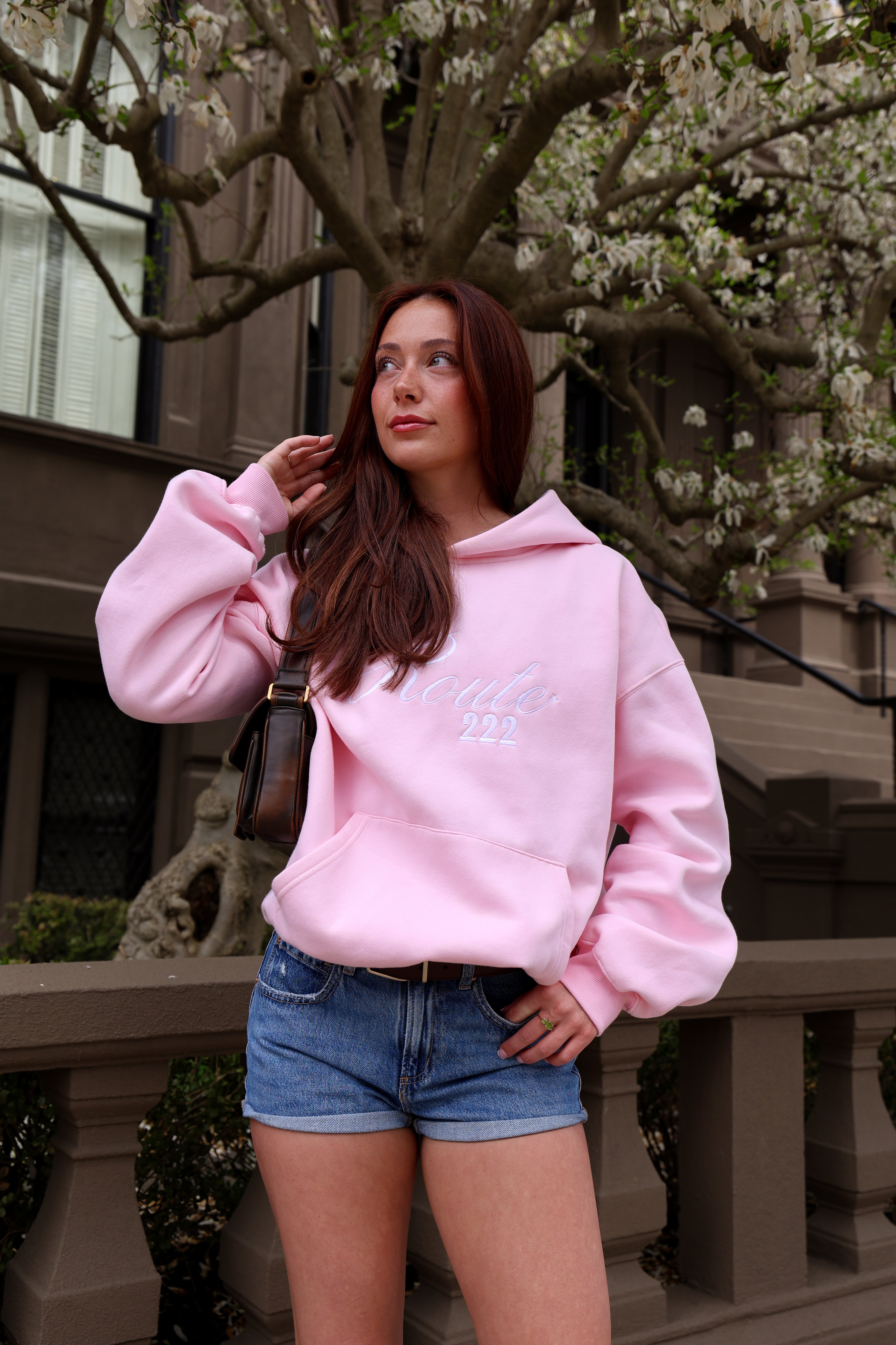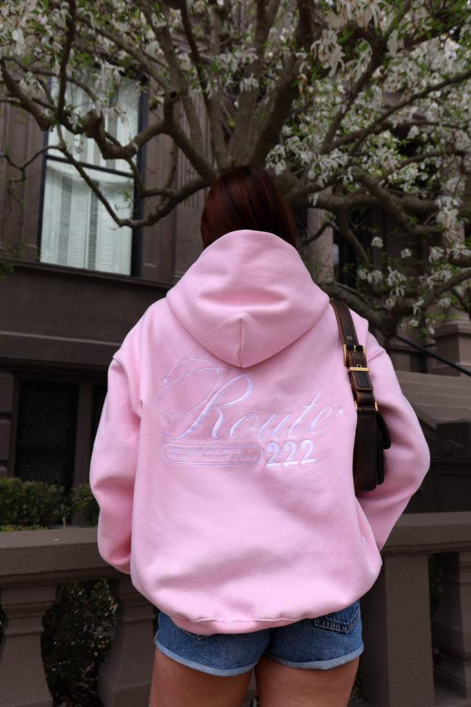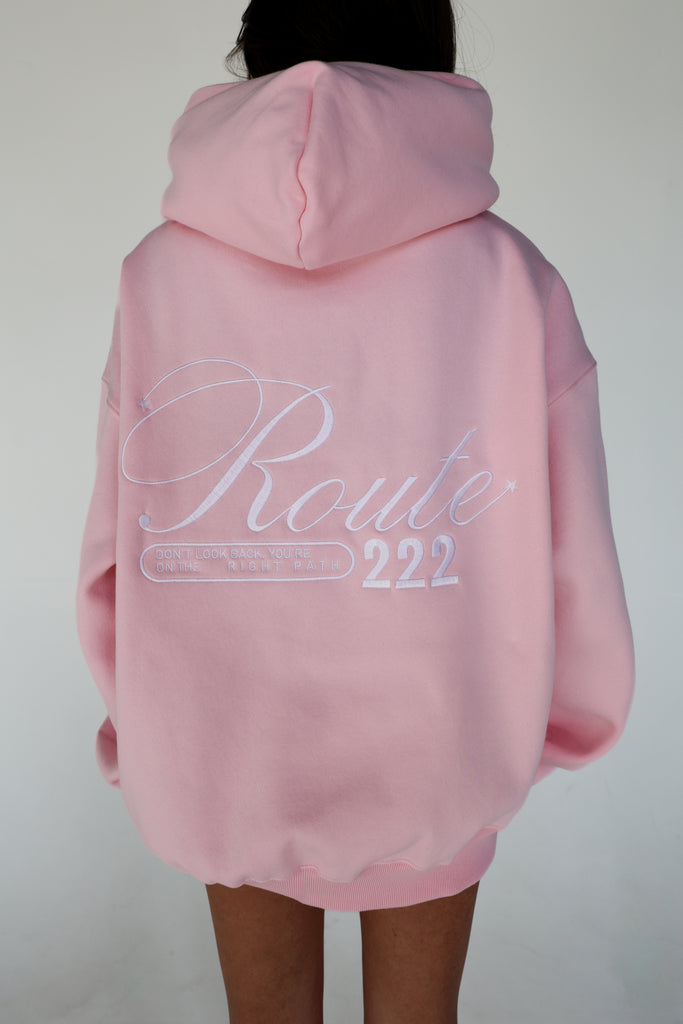 This soft pink hoodie features an embroidered “Route 222” graphic with a quiet affirmation: “Don’t look back. You’re on the right path.”
