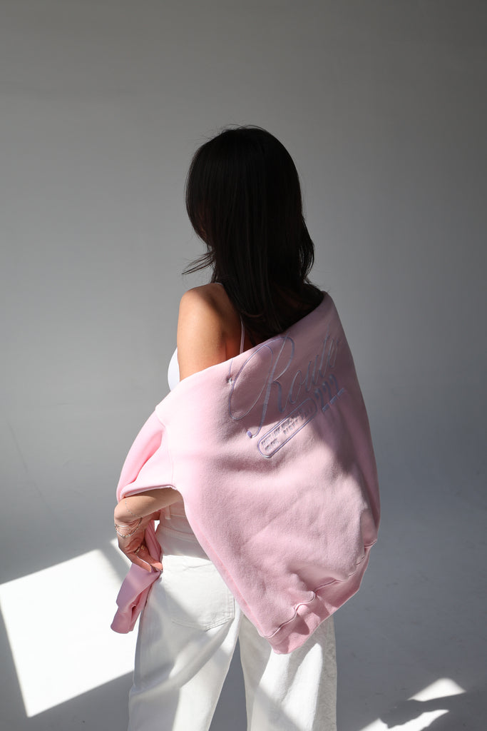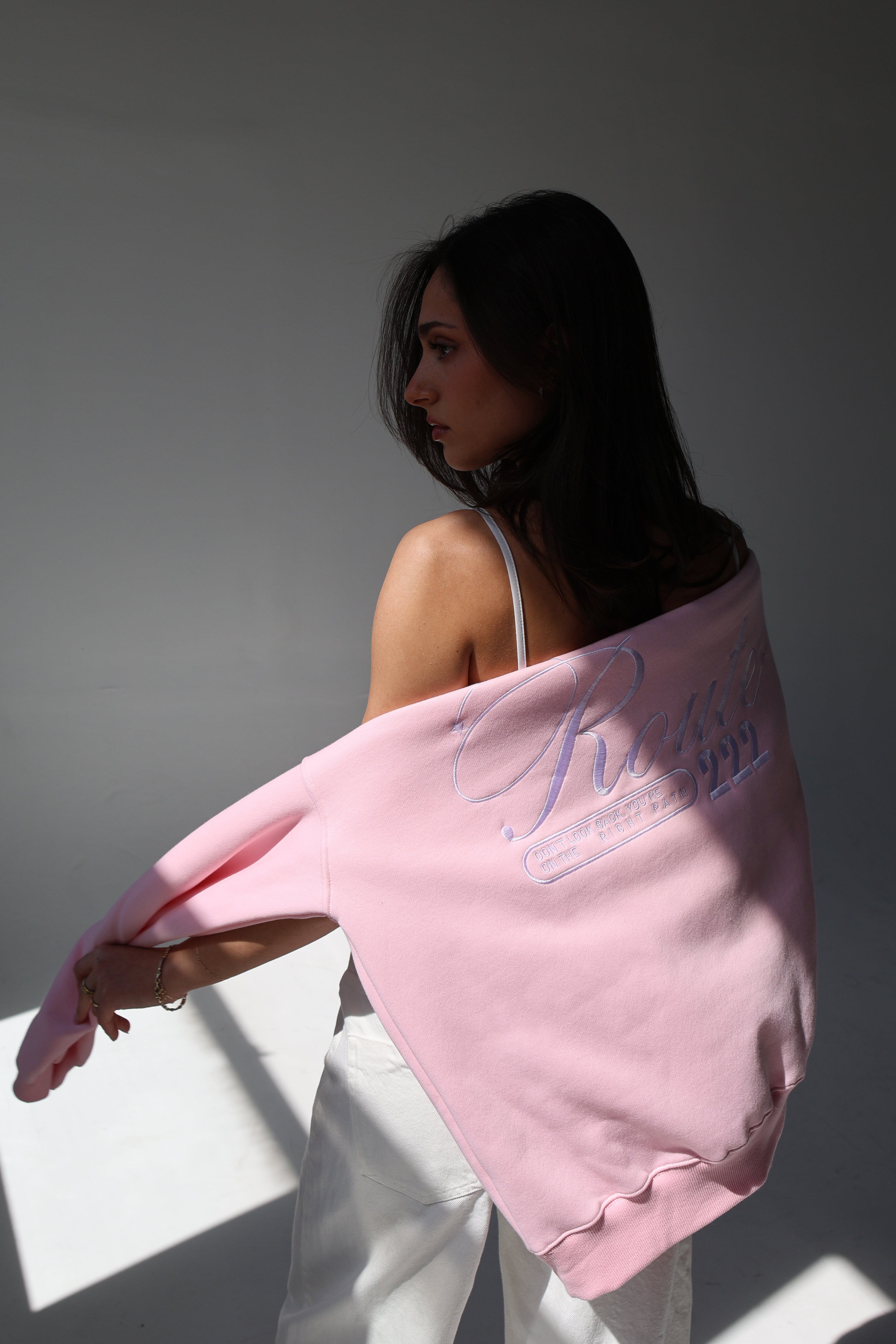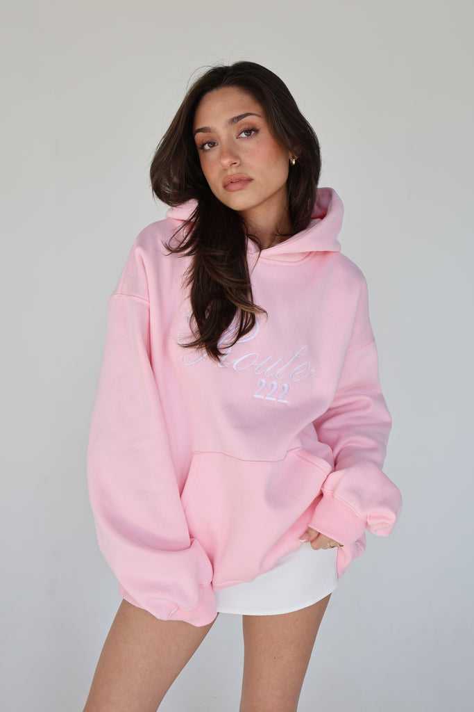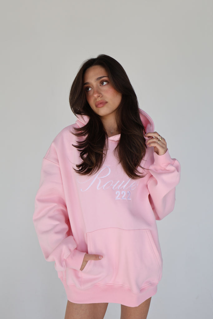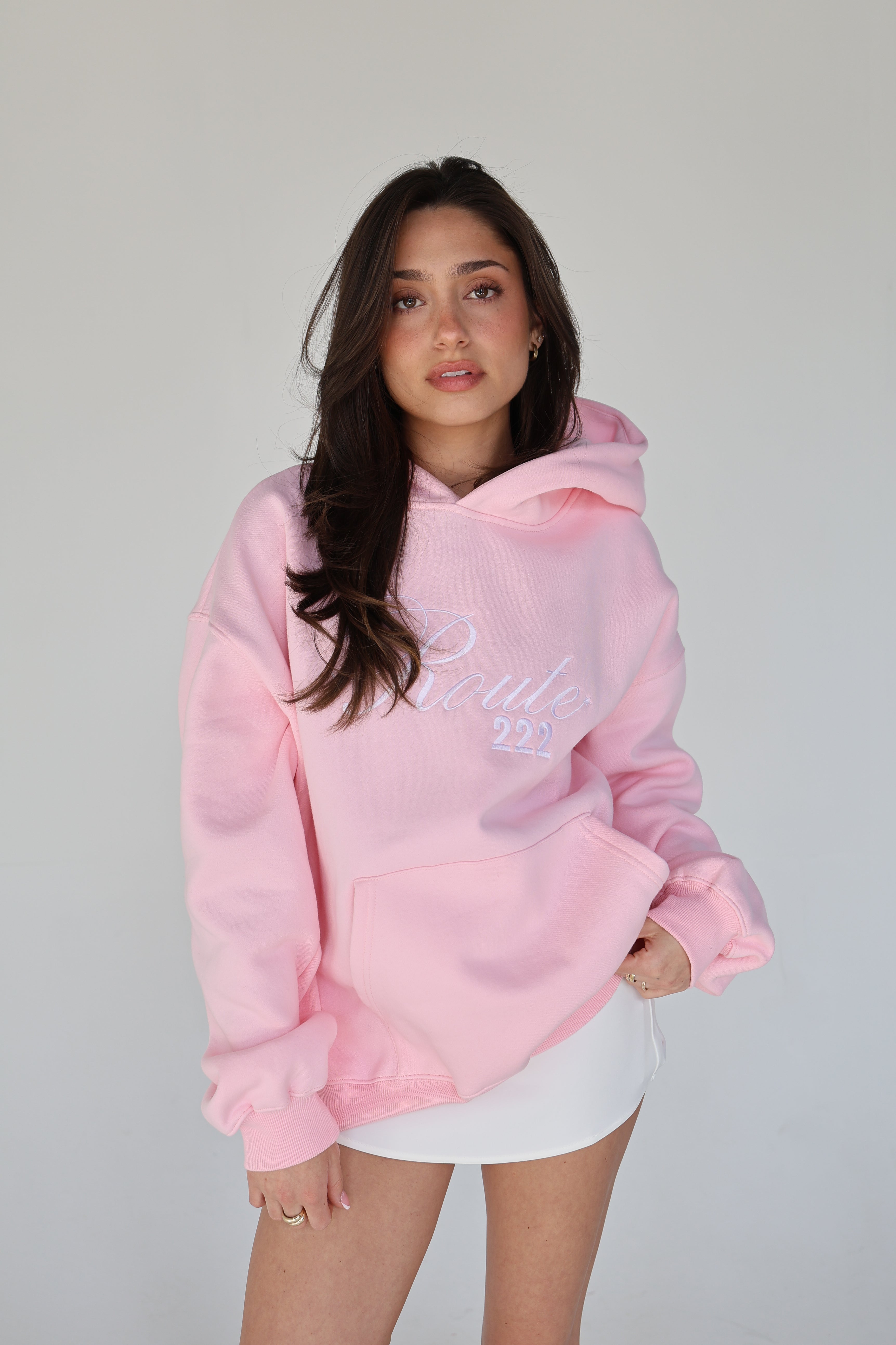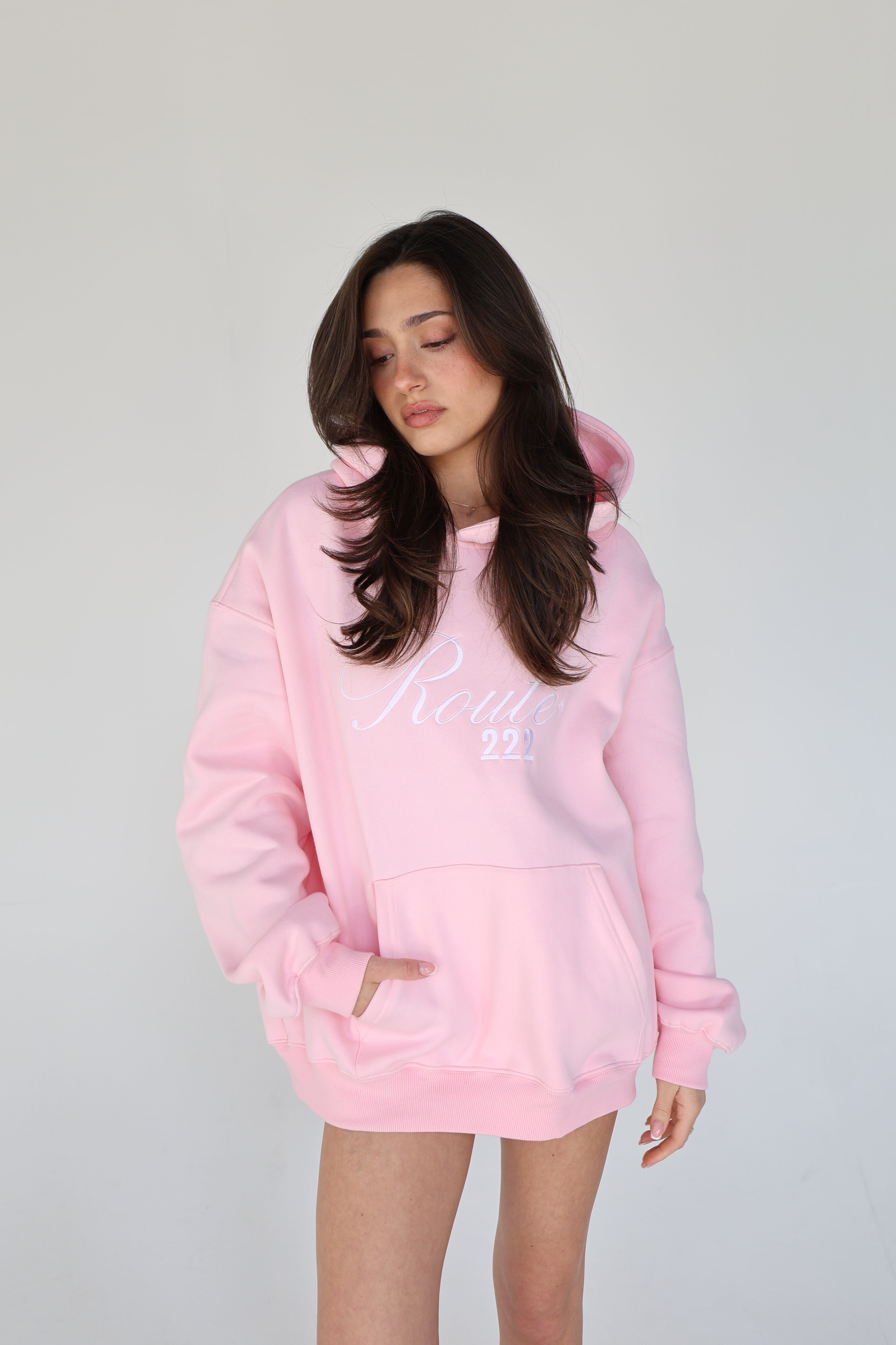 This soft pink hoodie features an embroidered “Route 222” graphic with a quiet affirmation: “Don’t look back. You’re on the right path.”