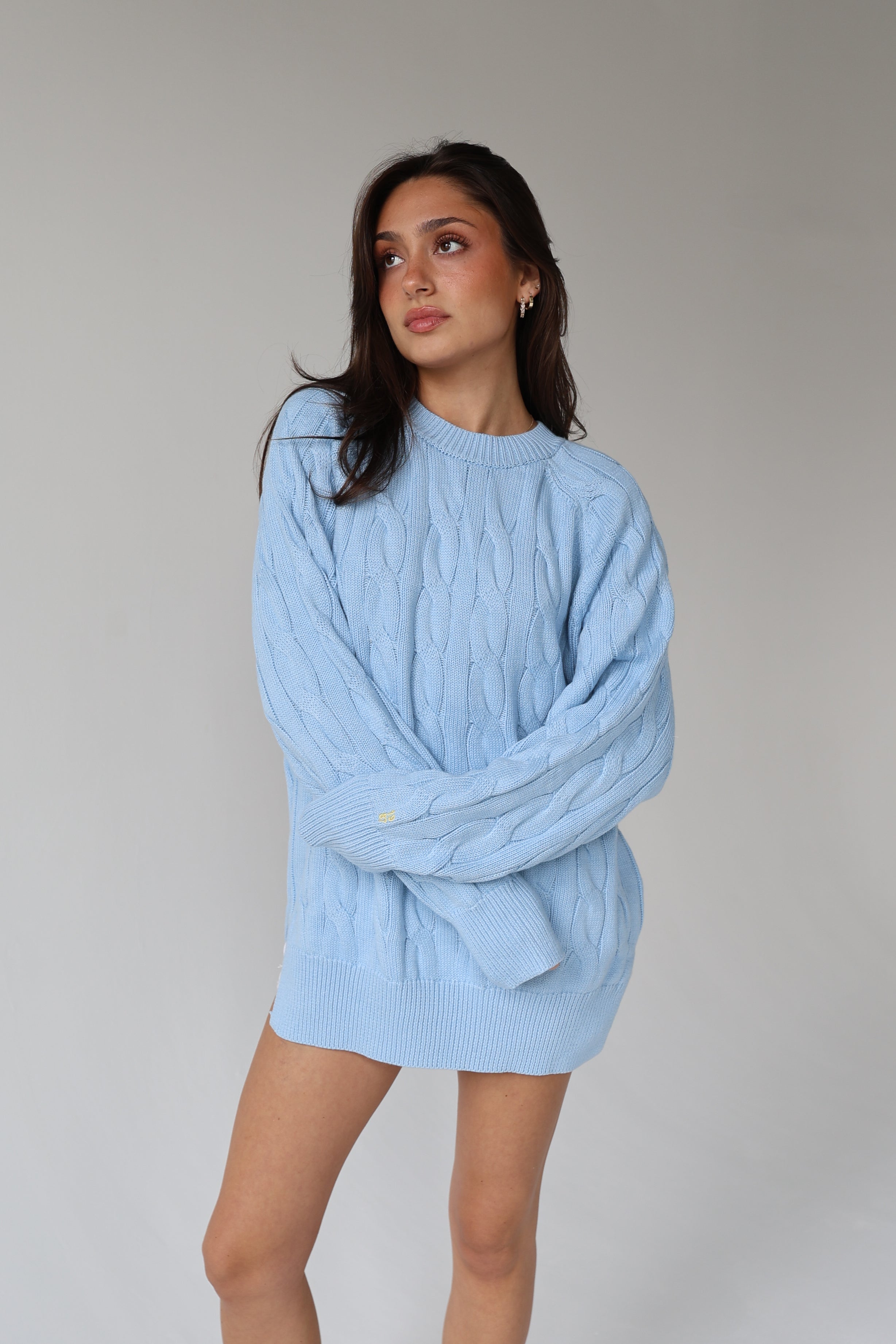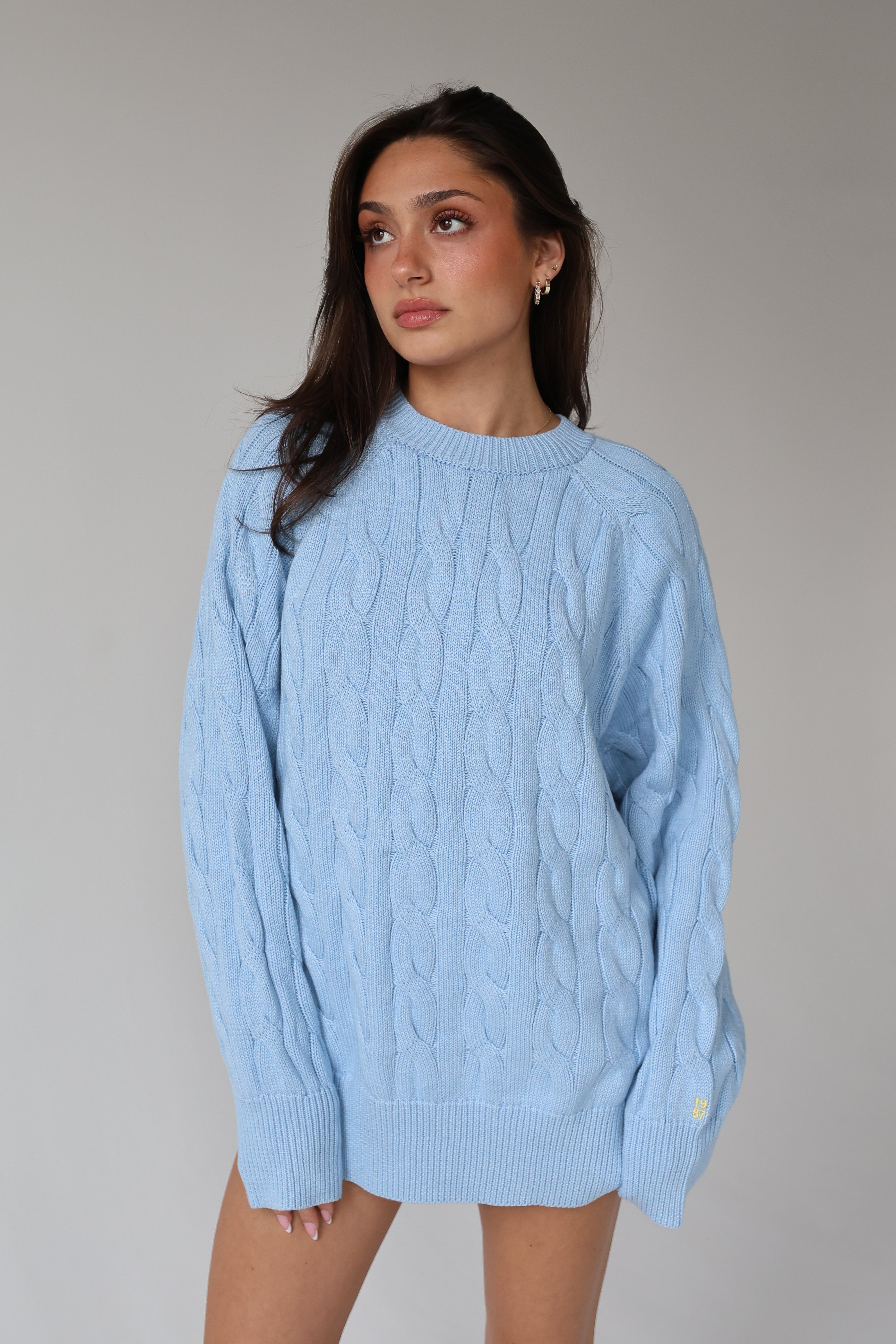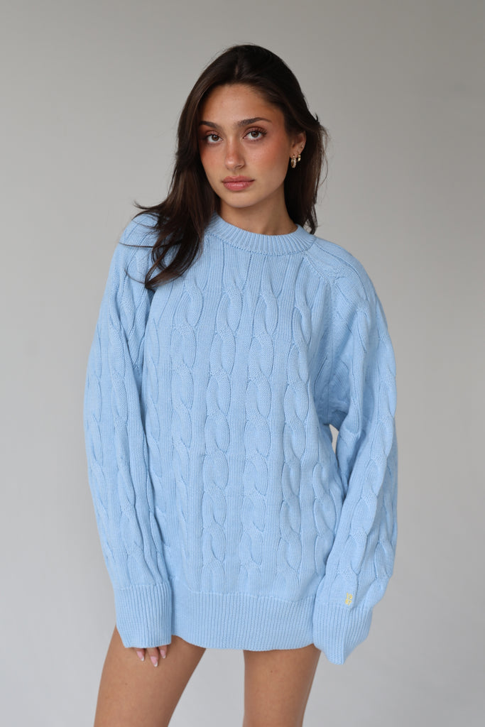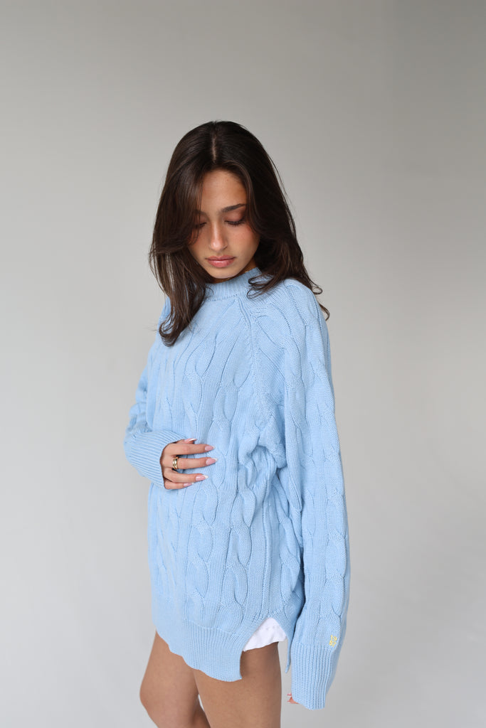Meet your new coastal essential. The Cashmere Crew in Monomoy is crafted from our premium cashmere blend for an ultra-soft, breathable feel with structure that holds its shape. The classic cable-knit texture is paired with a relaxed, oversized fit and side slits for ease and movement.
