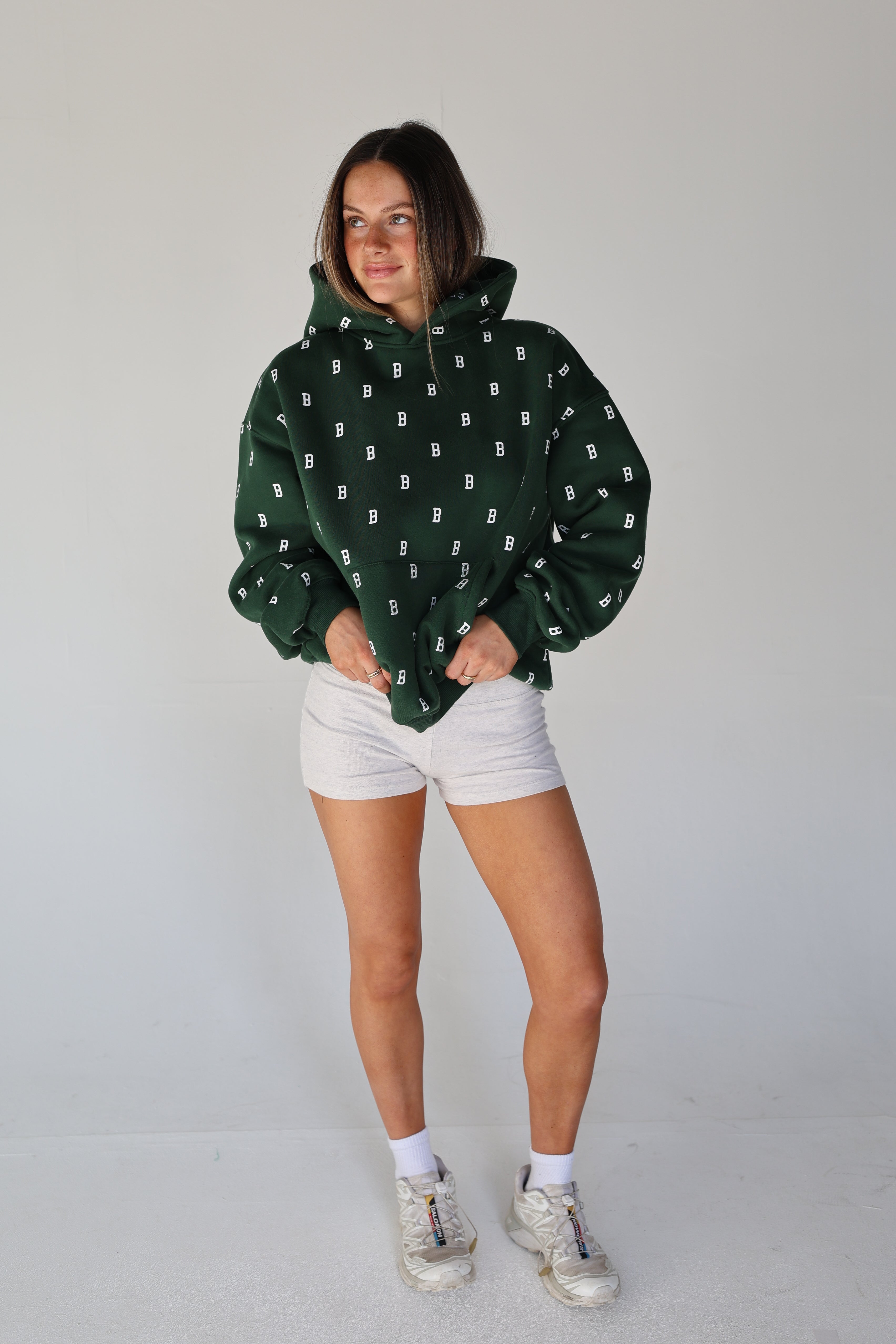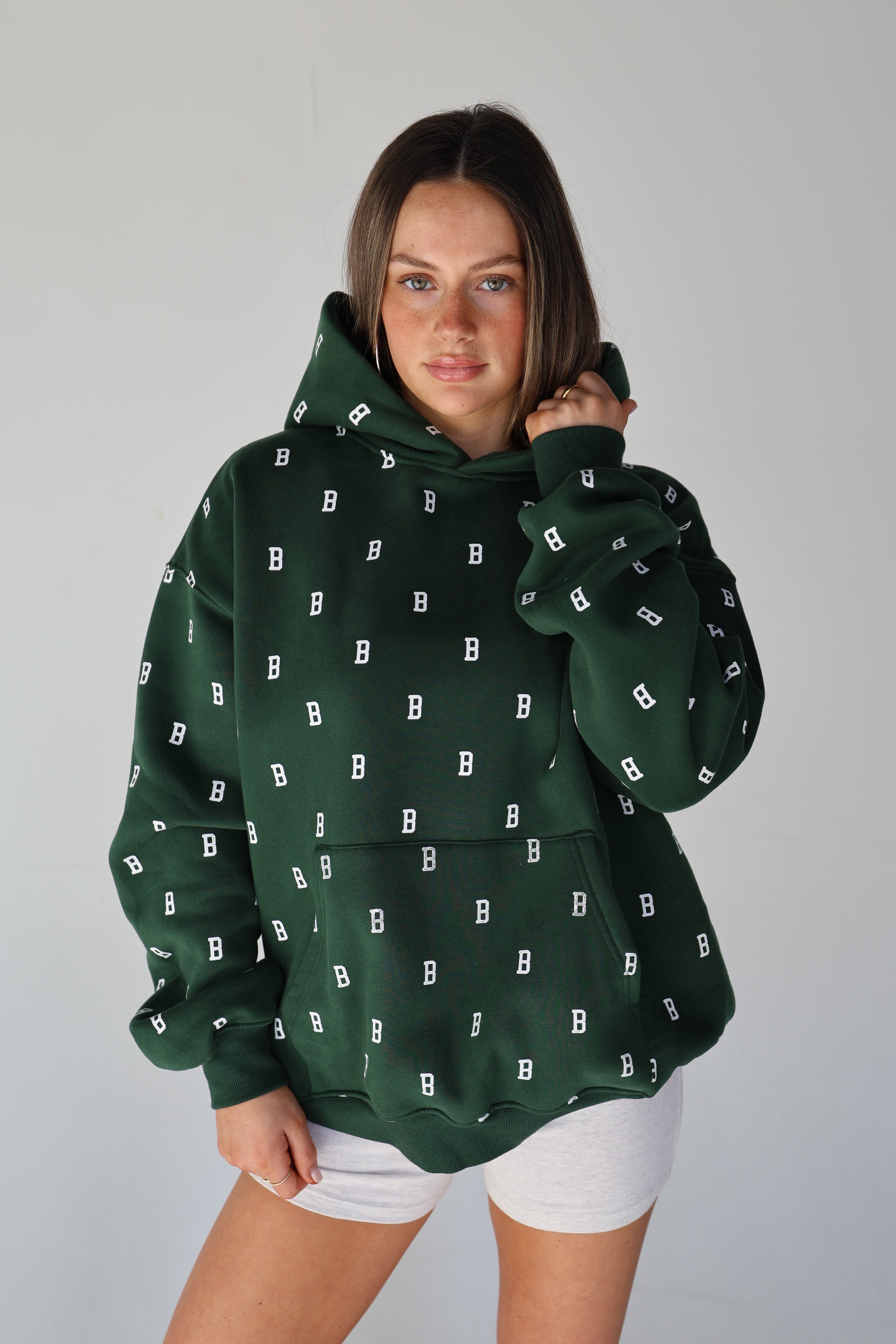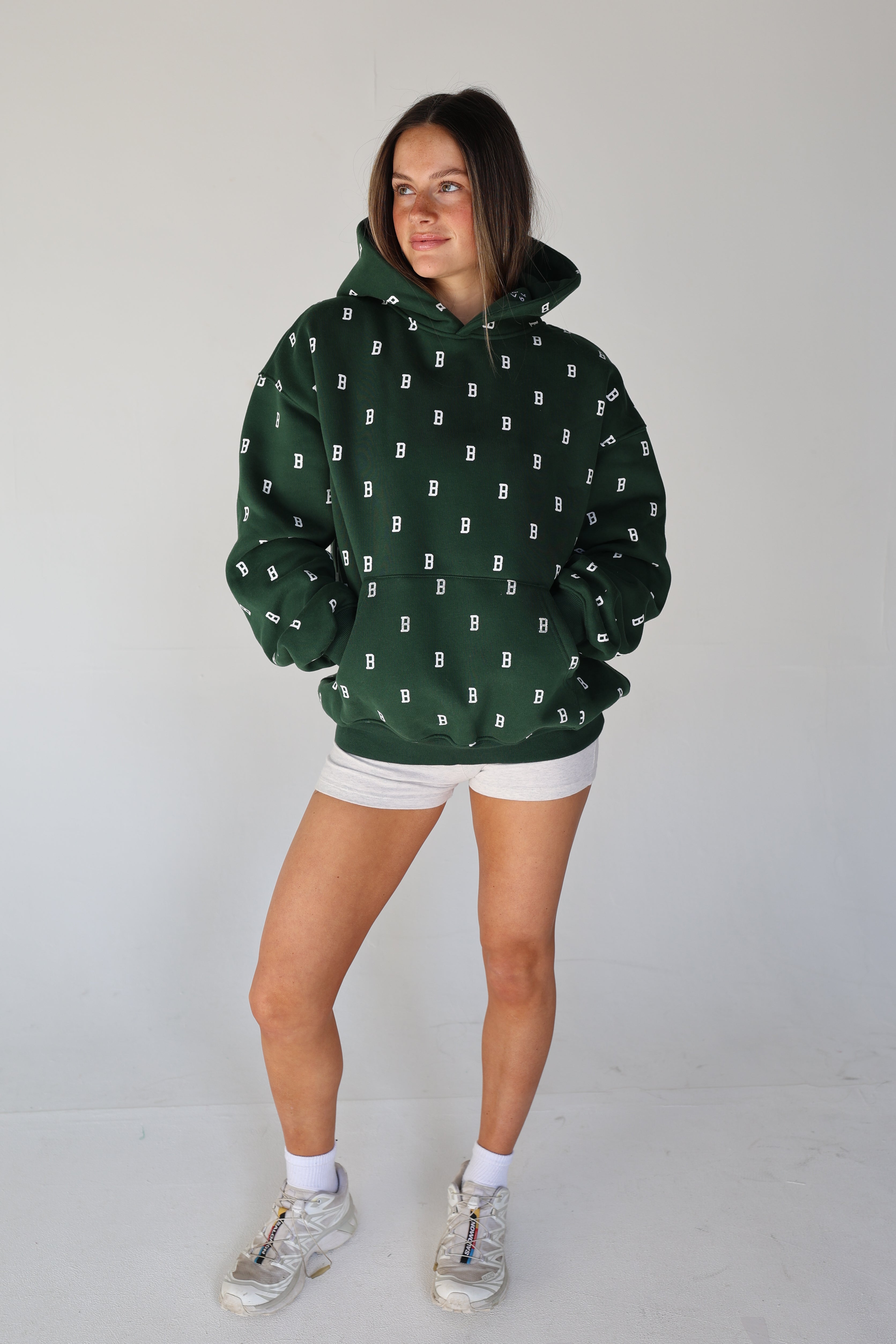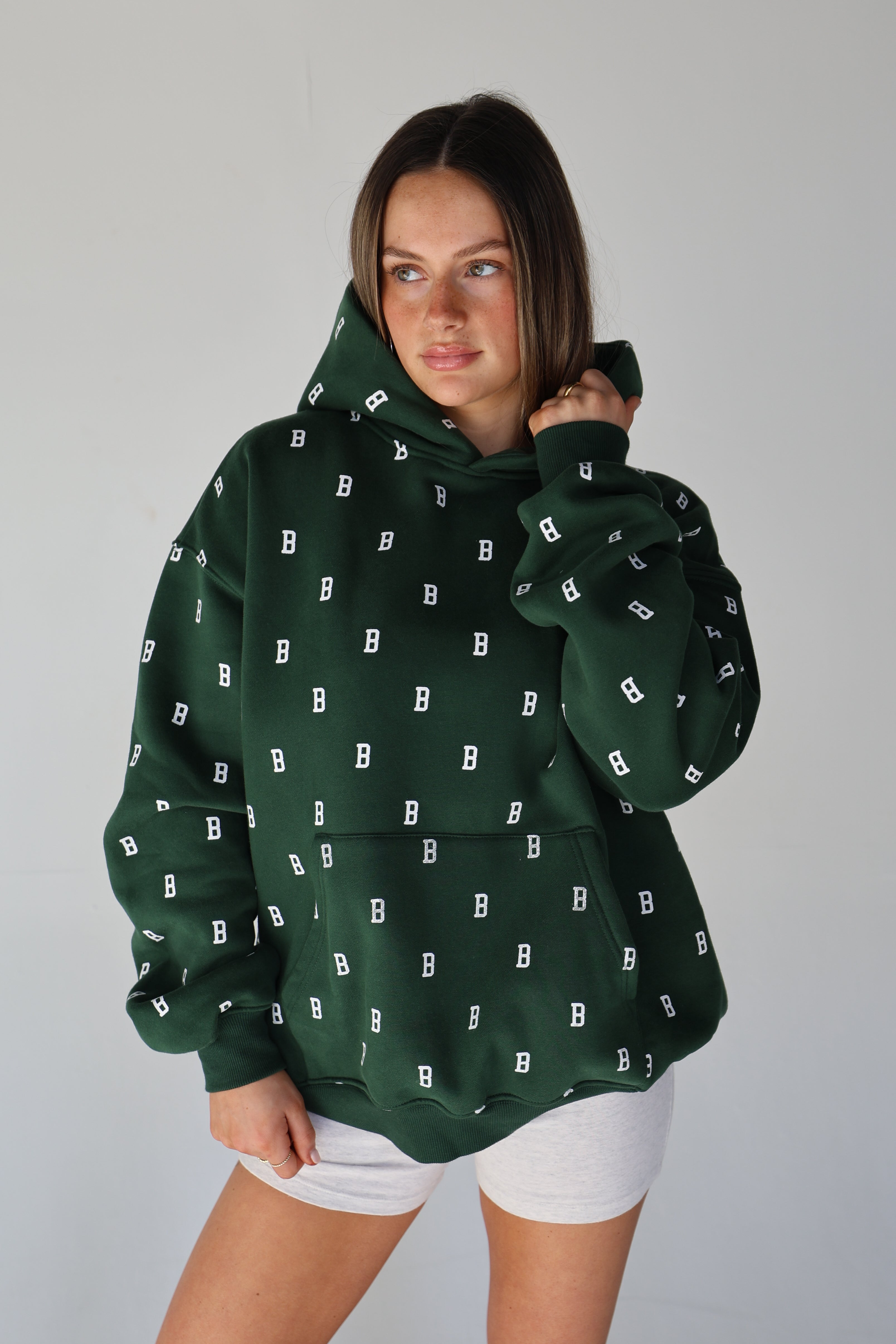 An everyday essential in deep Fens green, finished with our allover B monogram. Cut in an easy, oversized fit with a classic kangaroo pocket and soft fleece interior for all-day comfort. Designed for cool mornings, post-Pilates coffee runs, and game days alike.