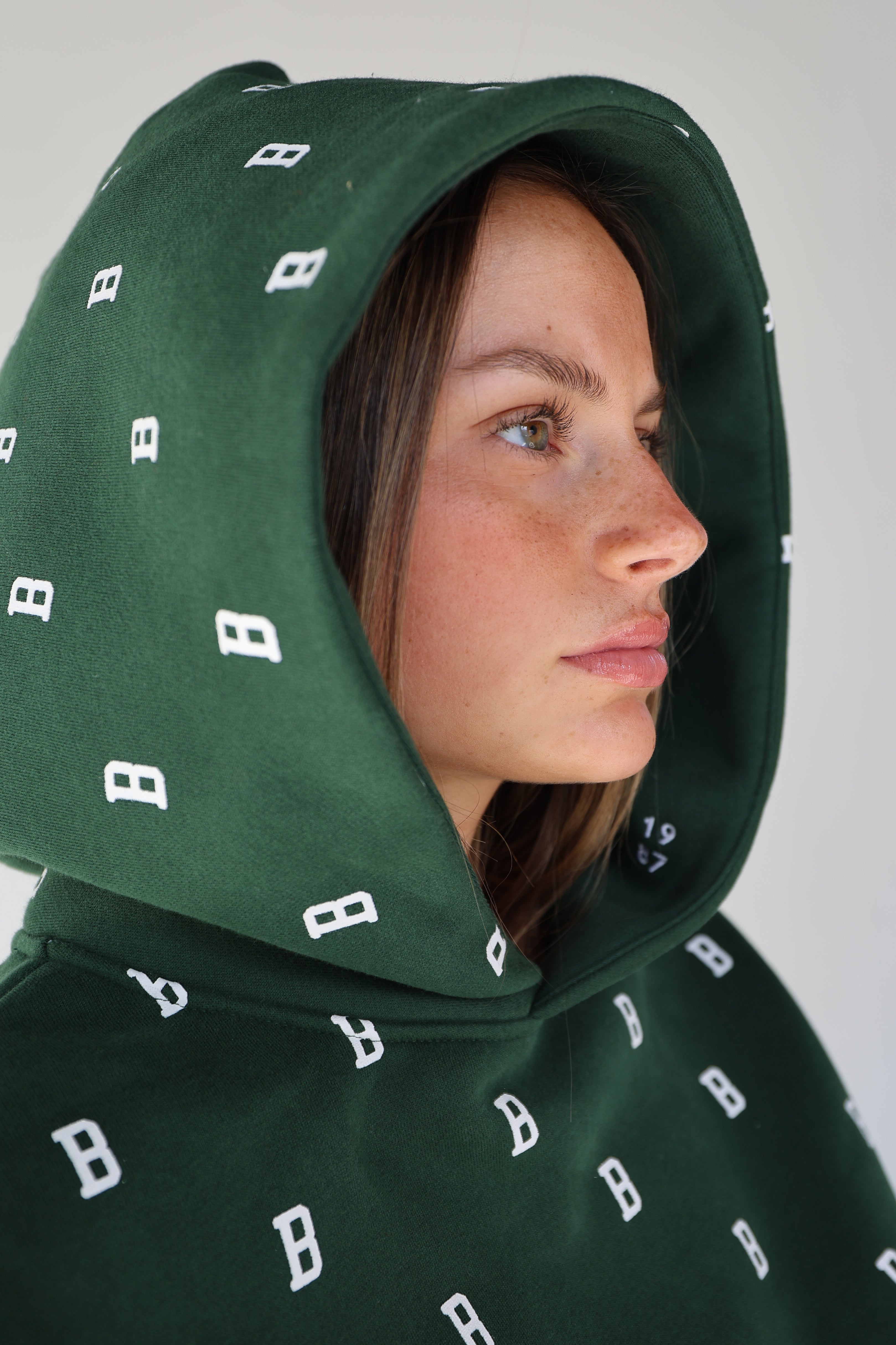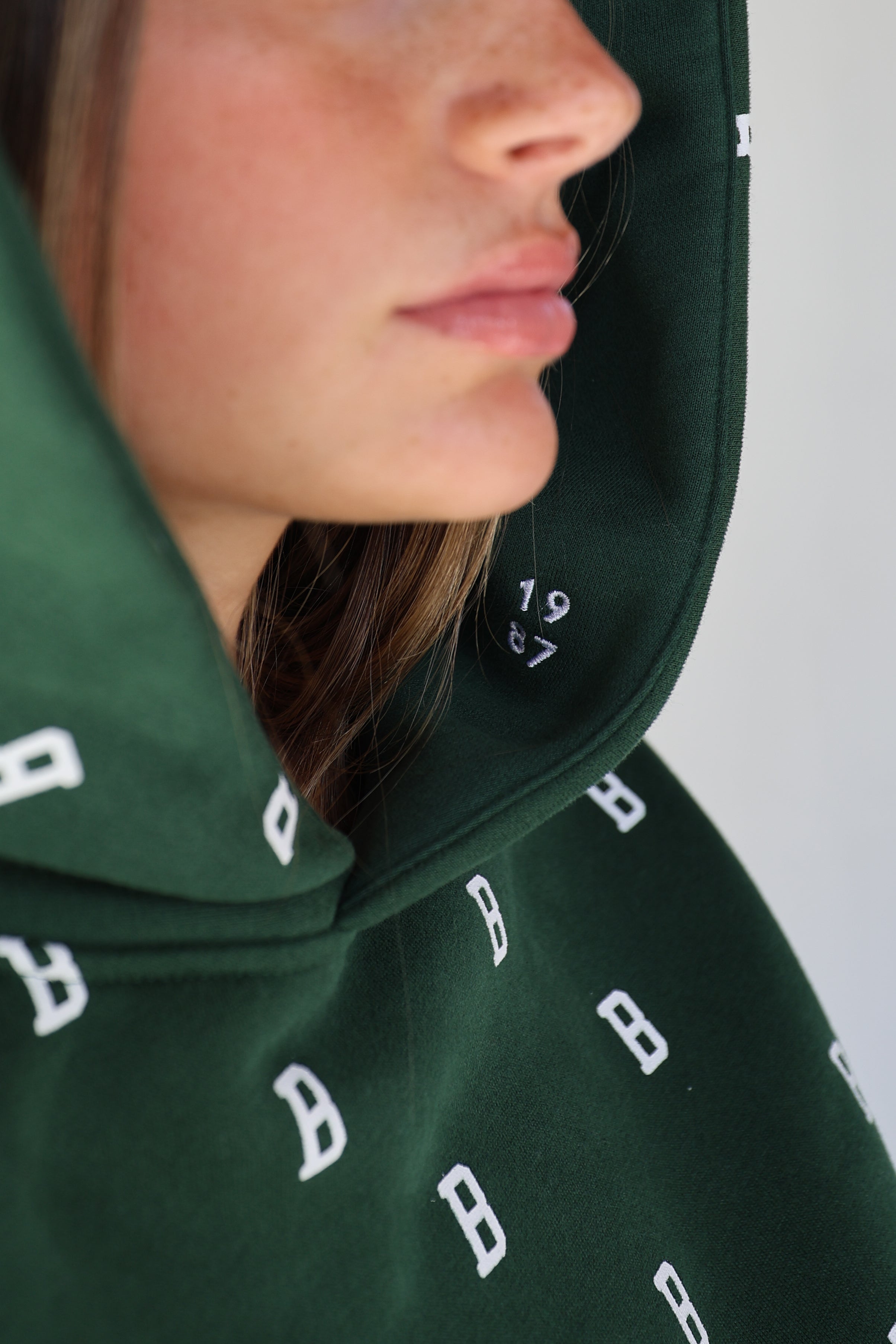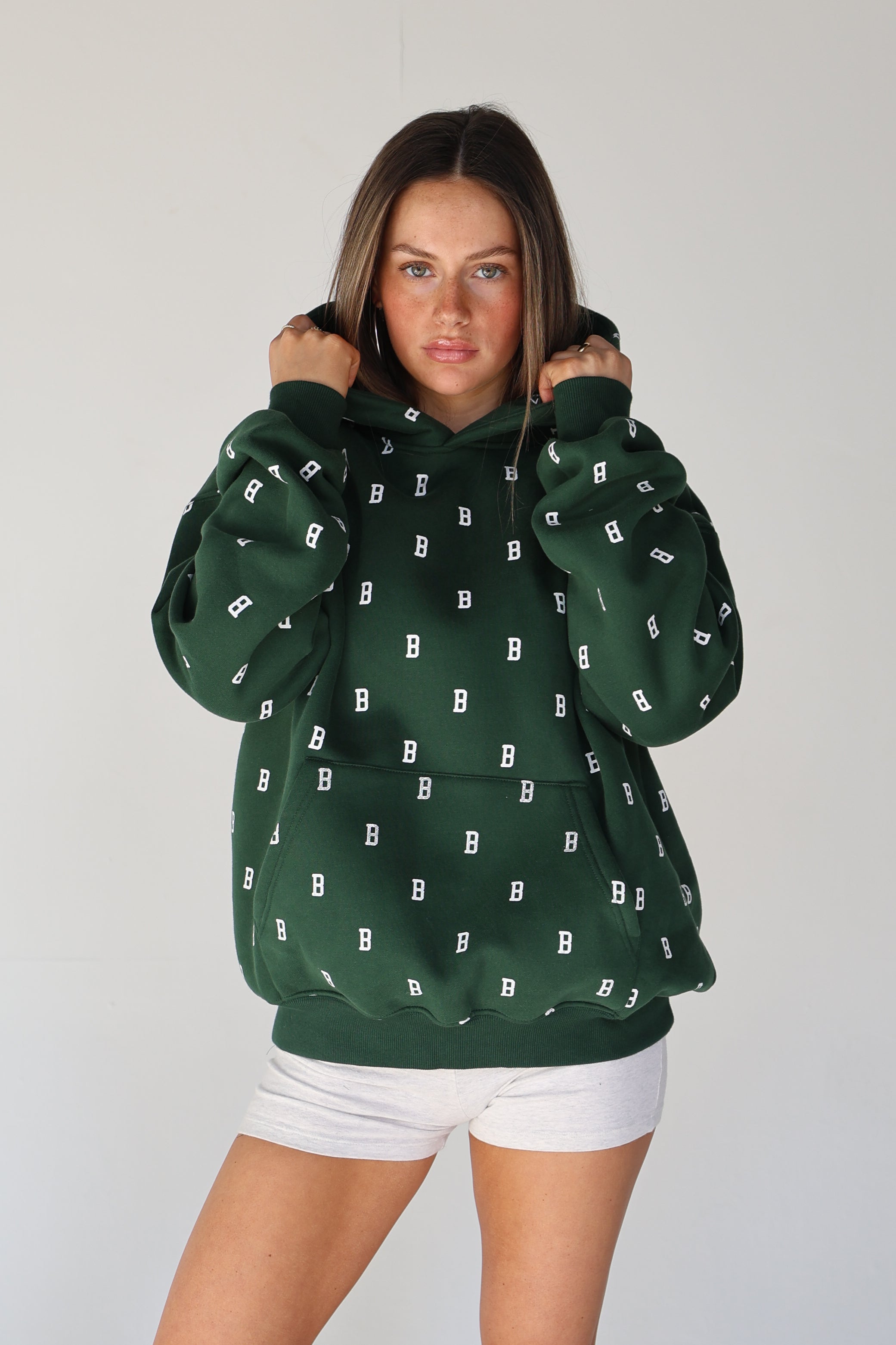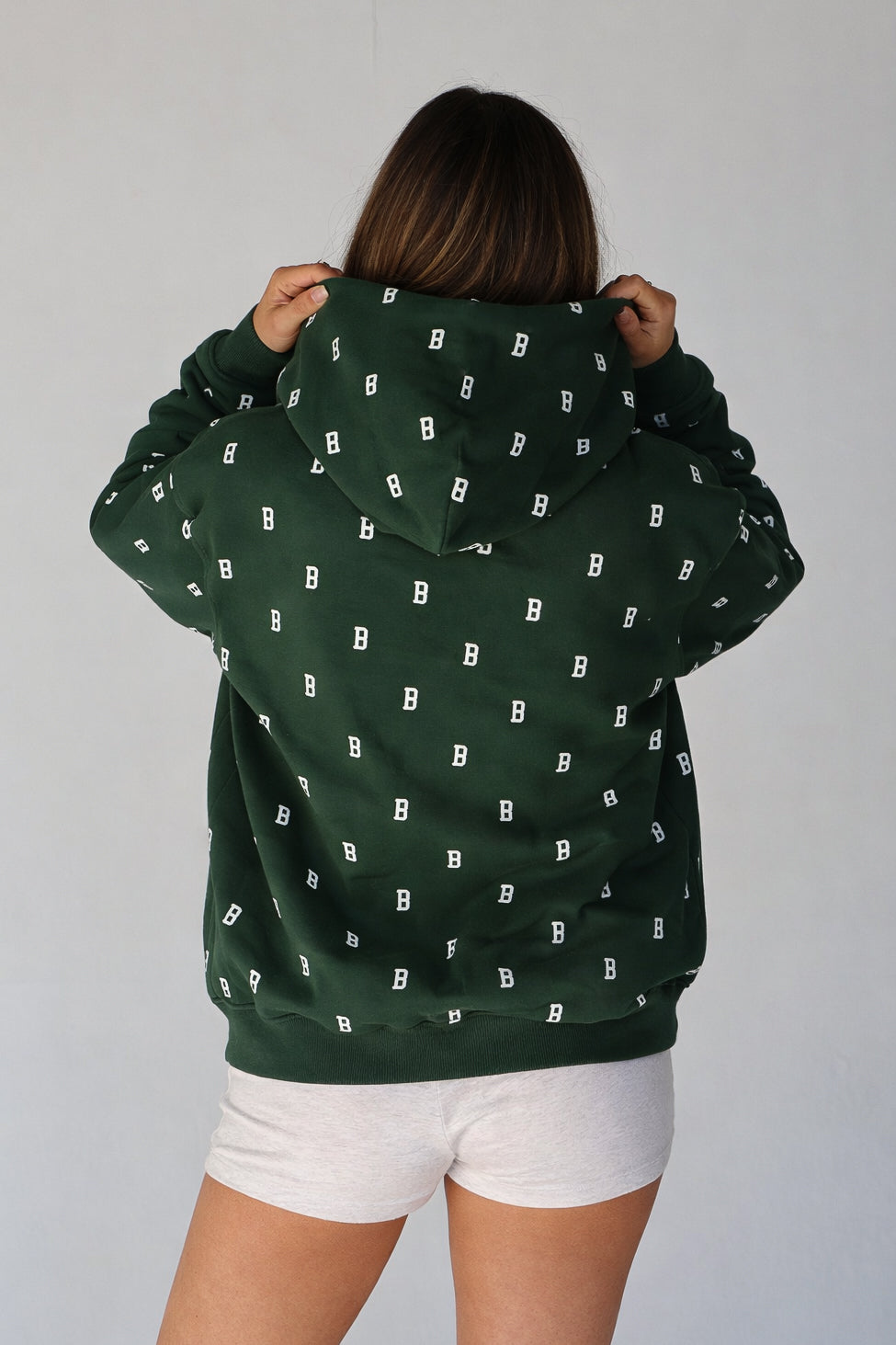 An everyday essential in deep Fens green, finished with our allover B monogram. Cut in an easy, oversized fit with a classic kangaroo pocket and soft fleece interior for all-day comfort. Designed for cool mornings, post-Pilates coffee runs, and game days alike.