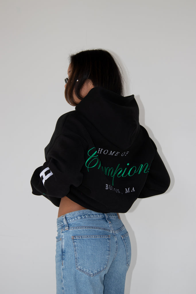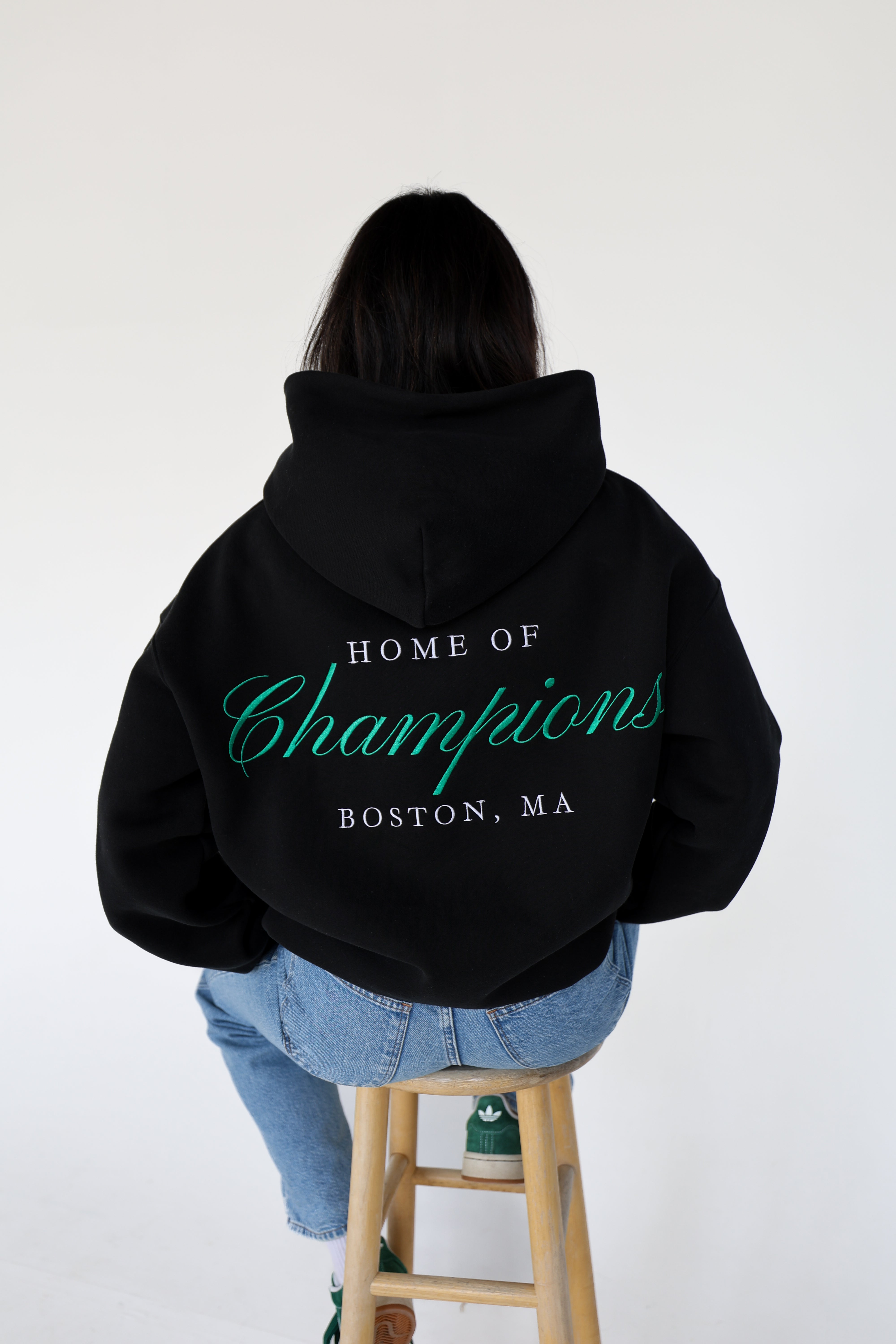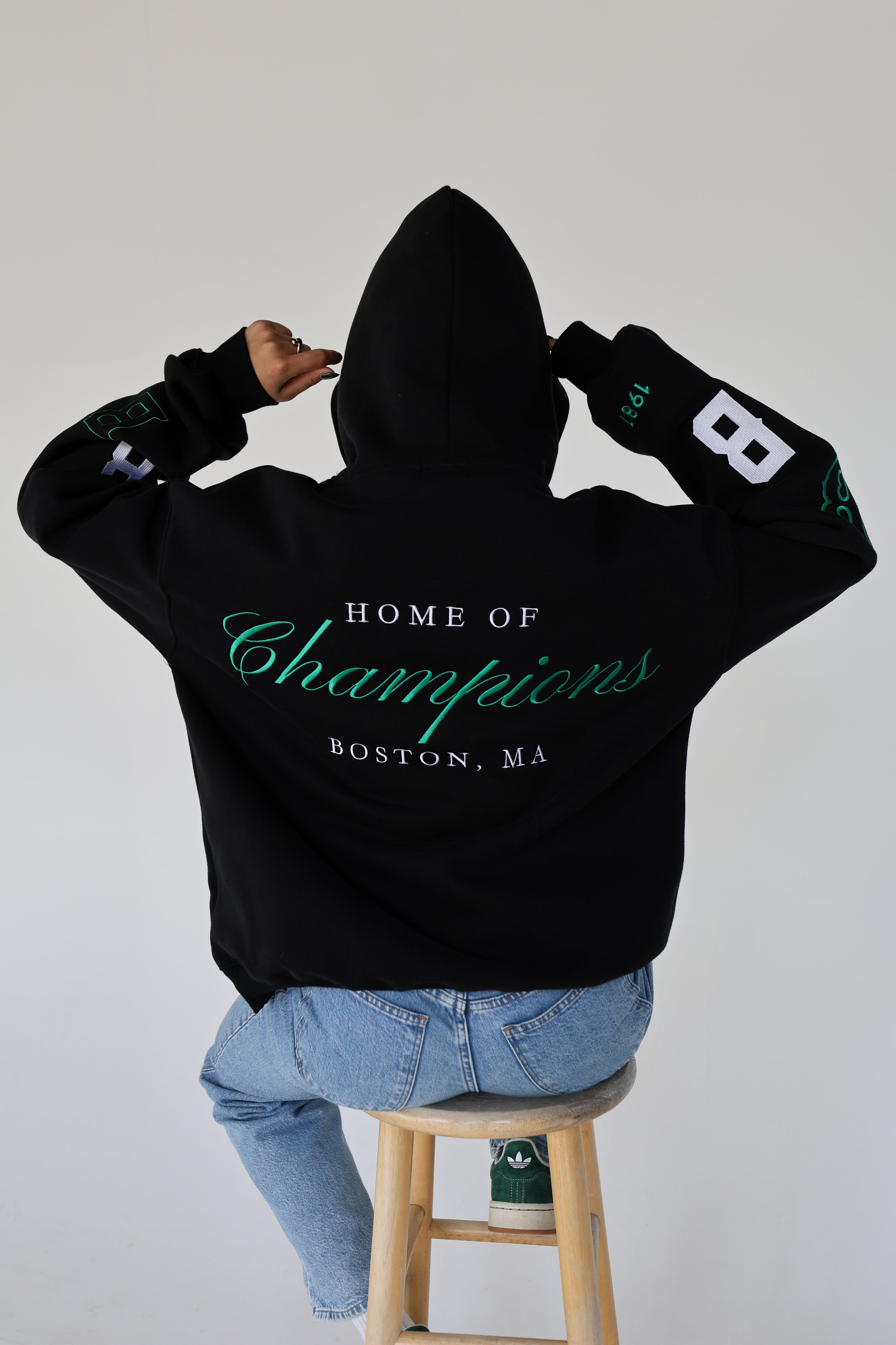 Boston’s legacy in sports is unmatched—40 championships and counting. We honor this winning tradition with our Home of Champions hoodie in black with, refined green hue accents, embodying the city’s pride.