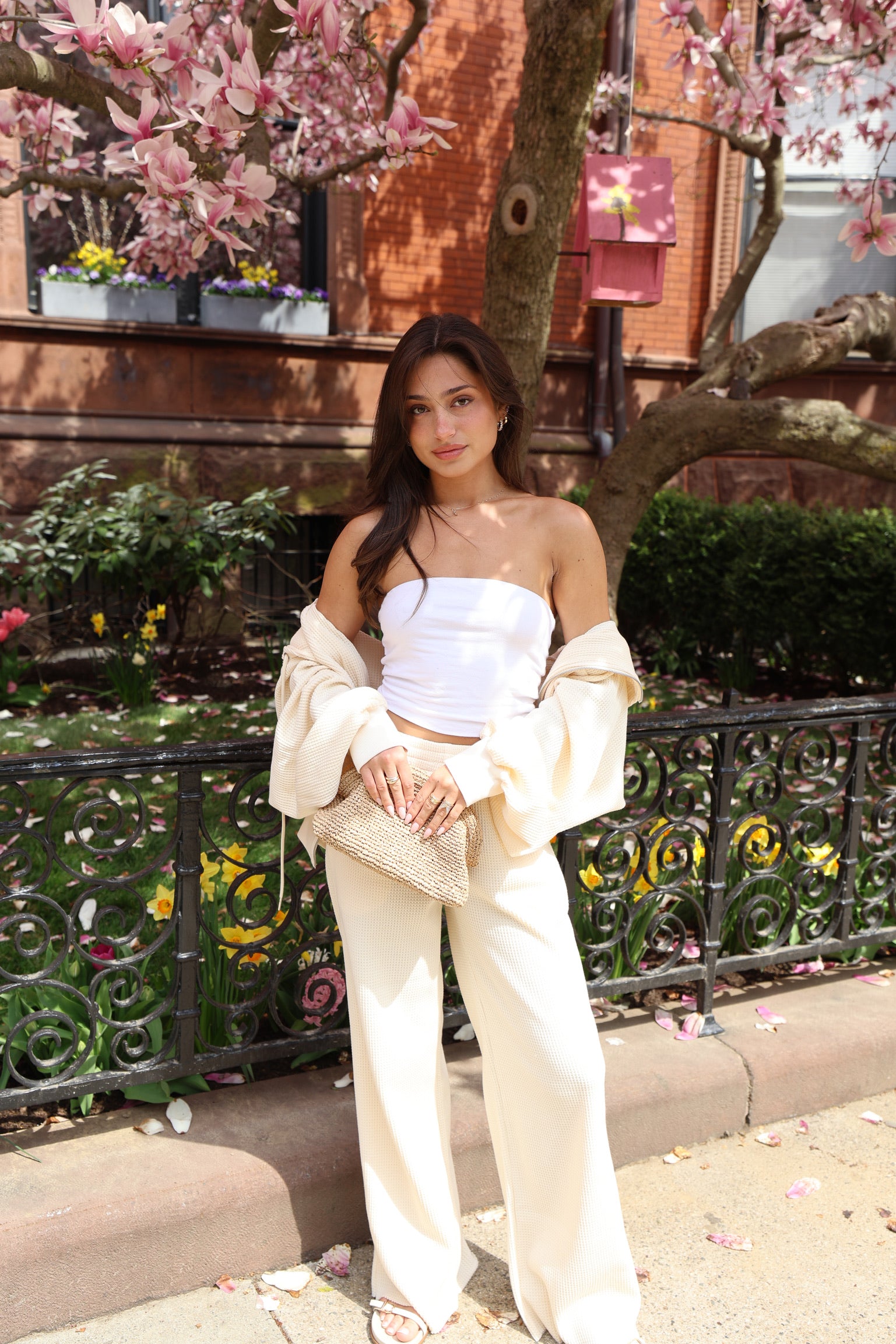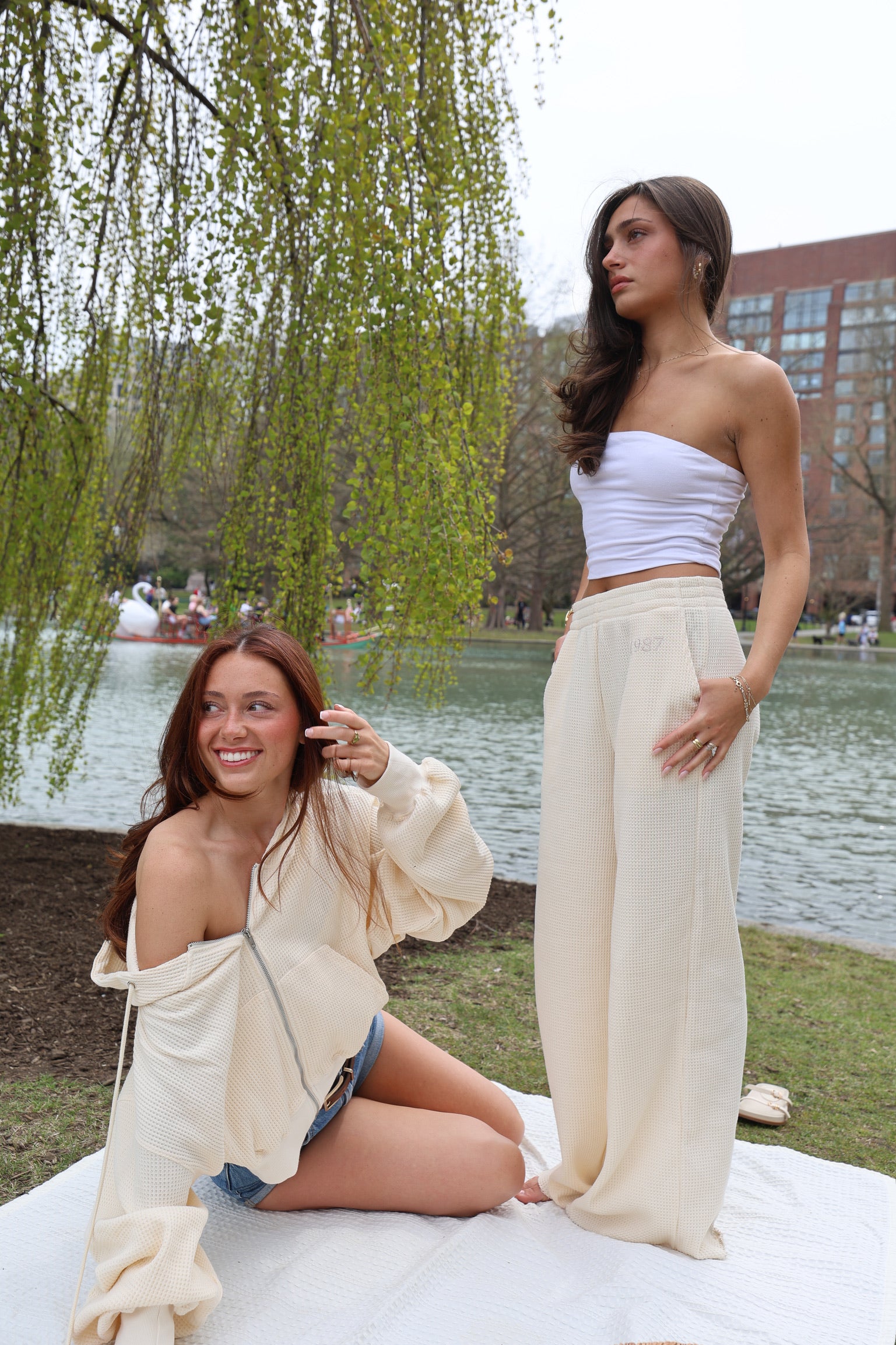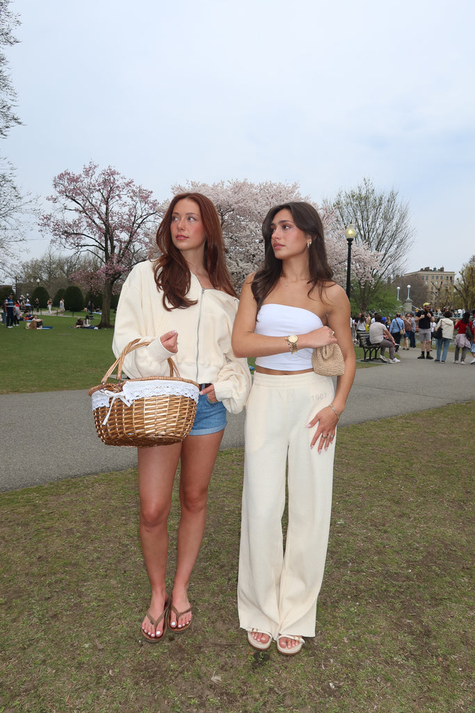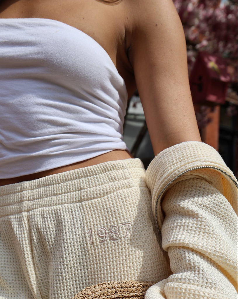 Cut to sit mid-rise with a soft elastic waistband, they flow into a super subtle flare that grazes just above the shoe for a long, clean line. The 1987 embroidery at the hip is intentionally understated—just enough to nod to something timeless, without saying too much.