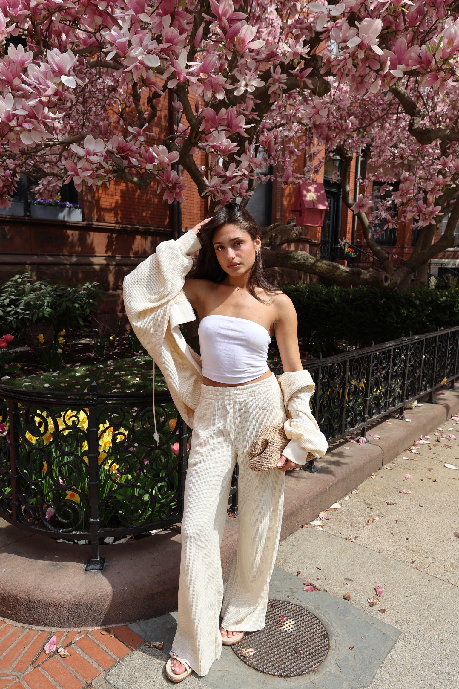 Elevated ease—coastal edition. These wide-leg pants are crafted from the same airy, textured waffle knit as the matching zip, making them an effortless go-to for head-to-toe comfort with polish.